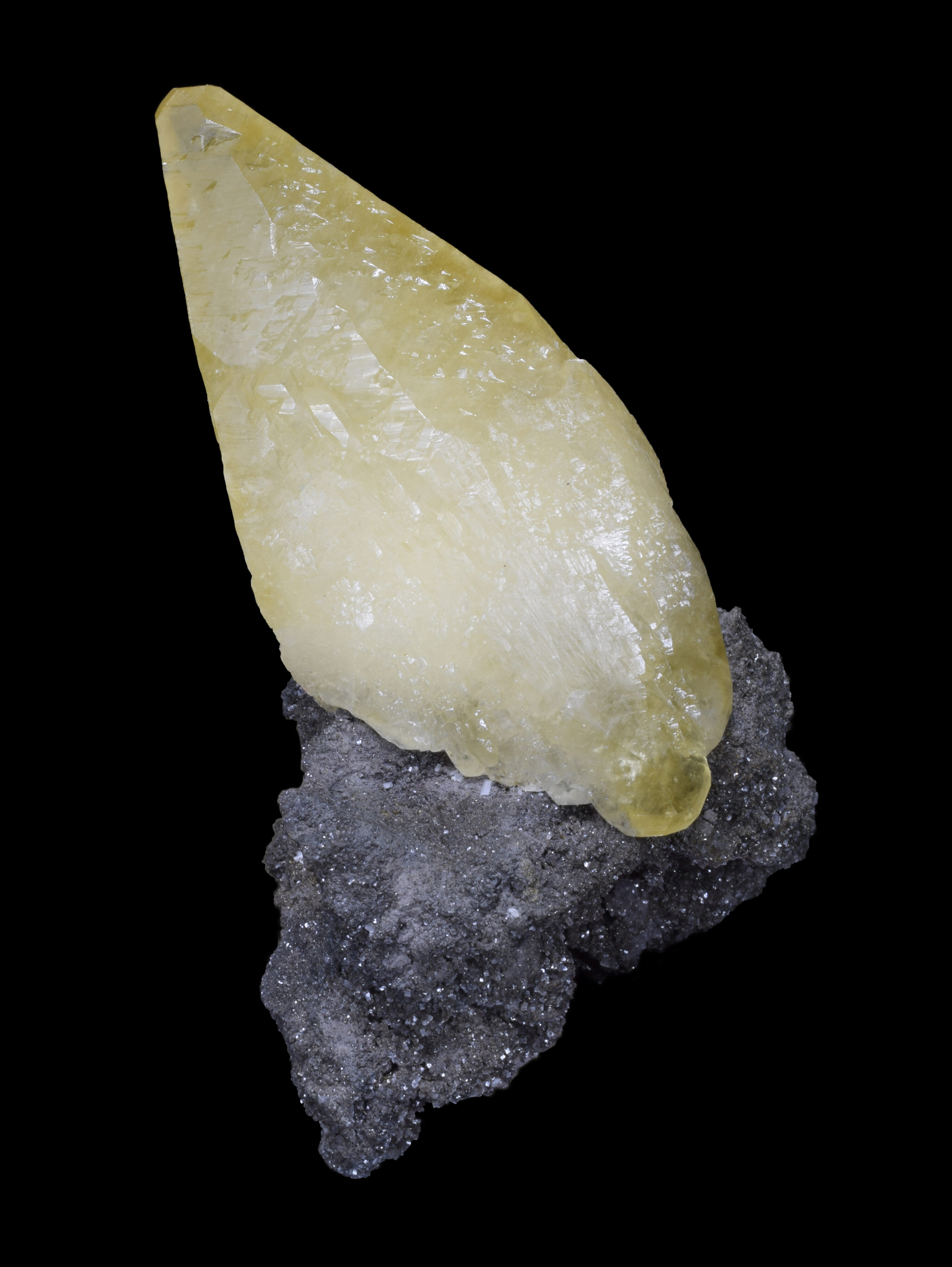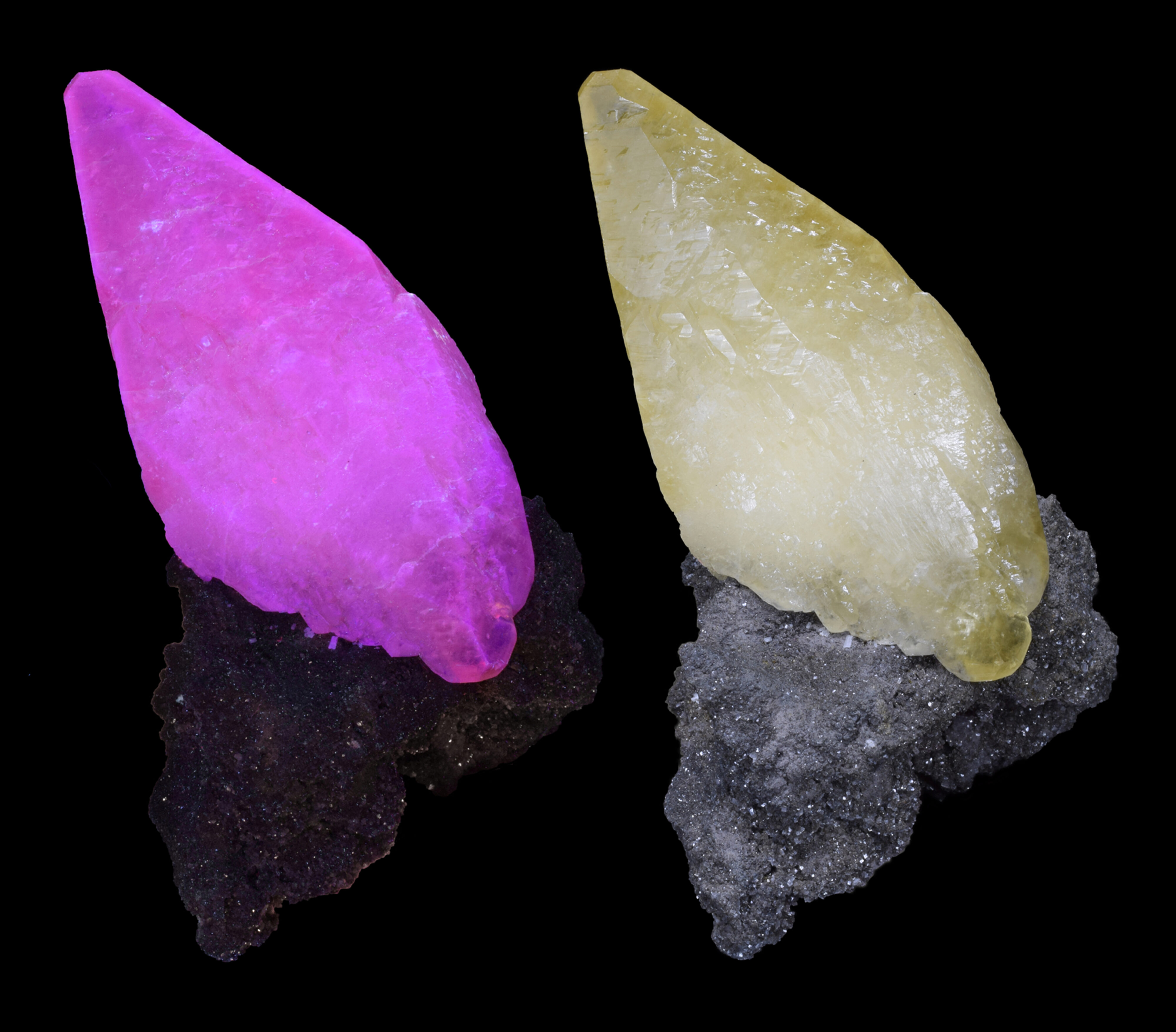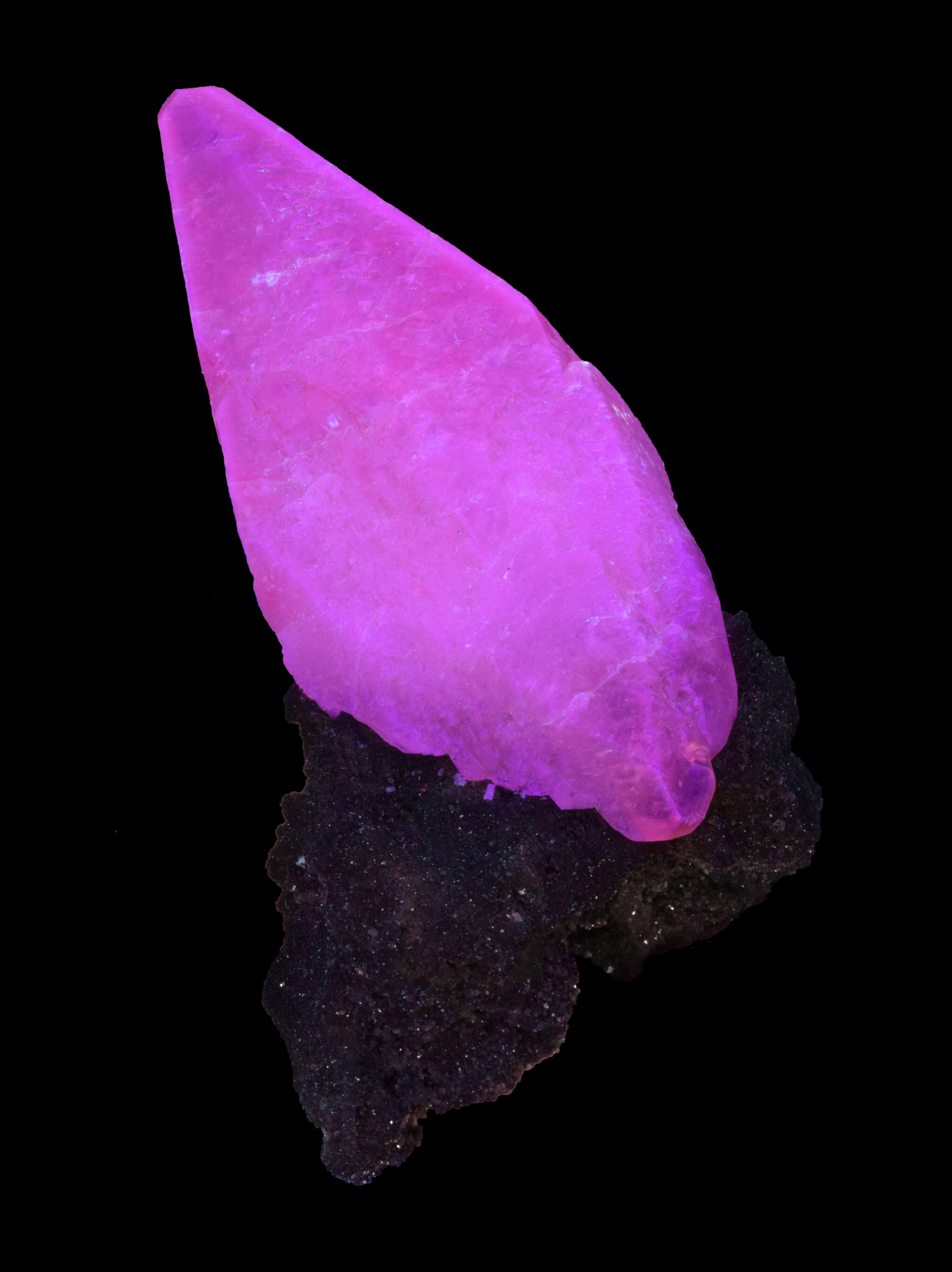 A beautiful fluorescent calcite from the Viburnum Trend in southeastern Missouri. This single, large, pale golden calcite scalenohedron (about 4 Inches long) sits on matrix of calcite druse-encrusted limestone. The specimen is from the West Fork Mine, Reynolds Co., Missouri. The calcite only responds under midwave UV and shows little to no fluorescence under either shortwave or longwave UV. Pink fluorescence under midwave UV occurs frequently in calcites from the various Viburnum Trend mines.