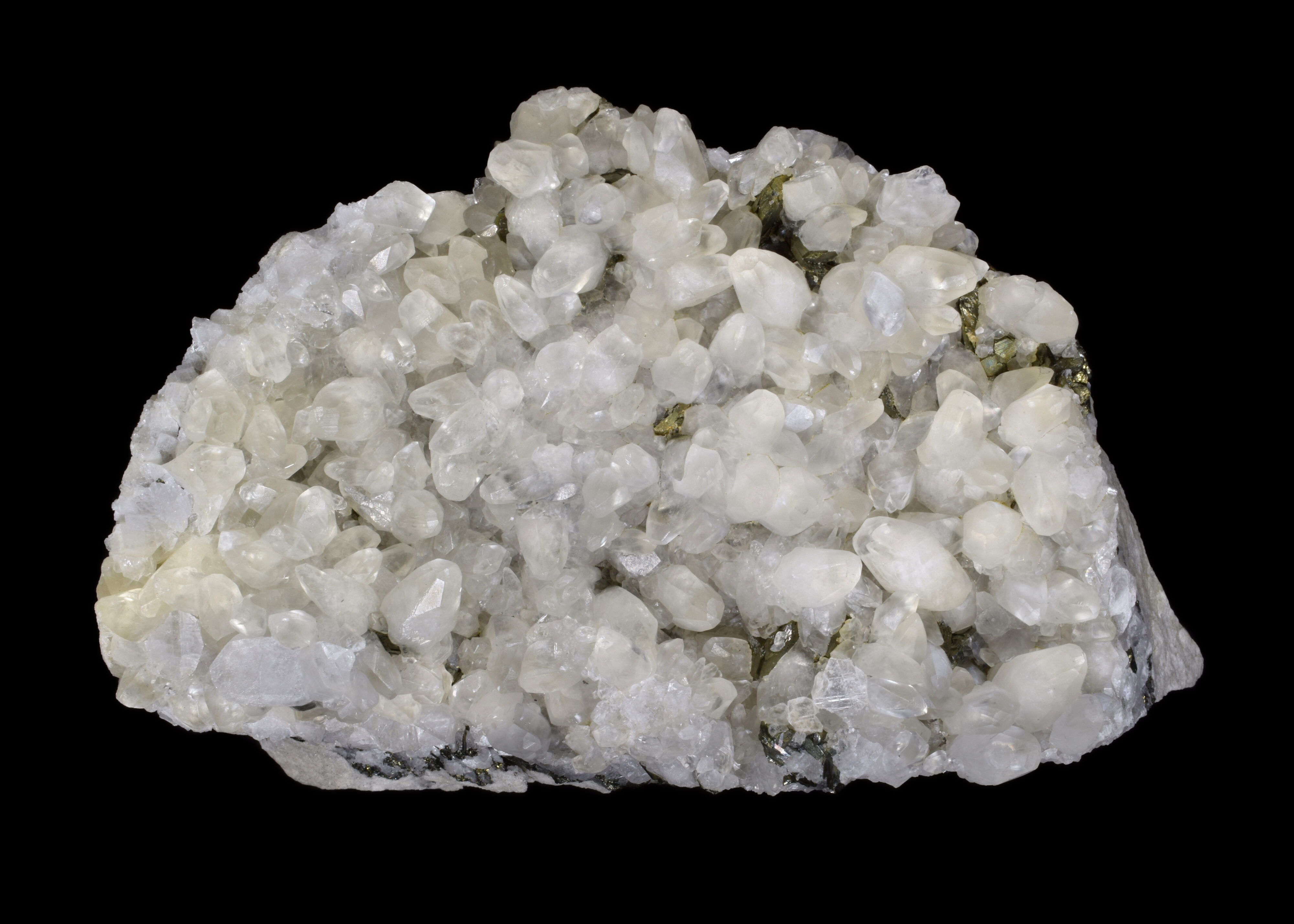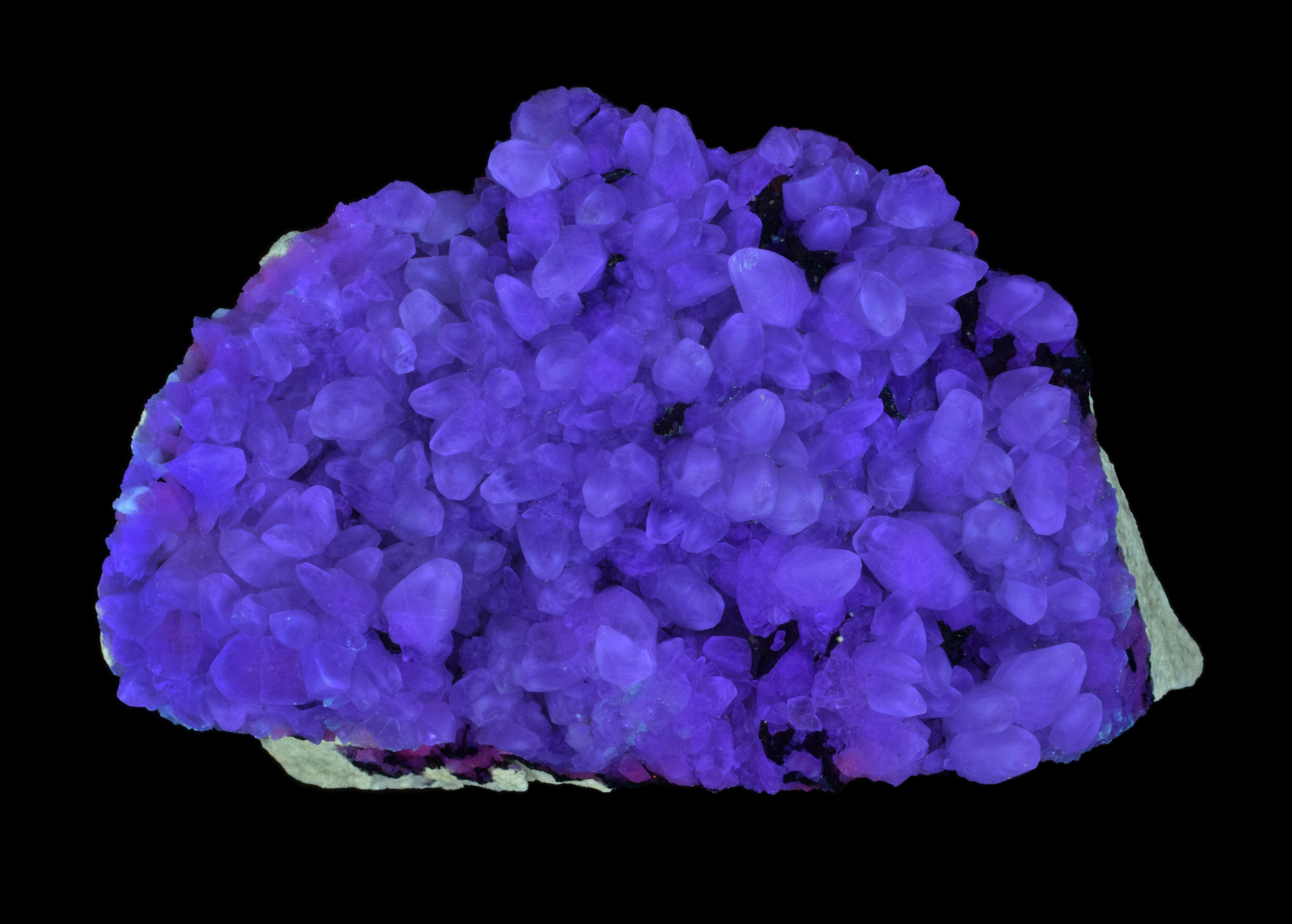 This piece consists of a plate of milky white, translucent, scalenohedral calcite crystals and minor marcasite on a flat matrix of light grey limestone/dolostone. The calcite crystals show an unusual purple/blue, fluorescent response under midwave UV (305 nm). Interestingly, the calcite is not significantly fluorescent under shortwave or longwave UV. This specimen is from an uncommon midwestern location, the Valders Quarry, in Valders, Manitowoc County, Wisconsin.
