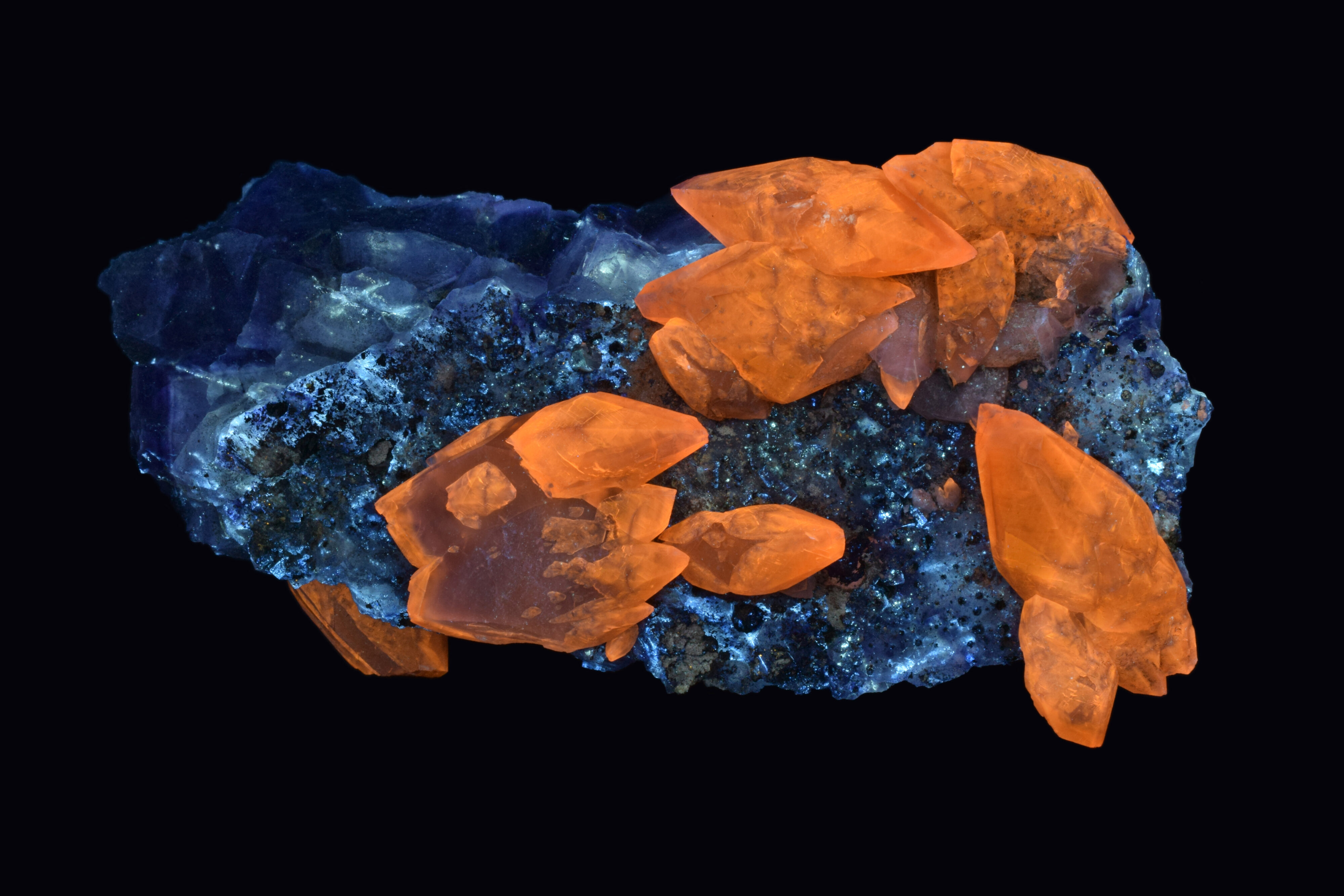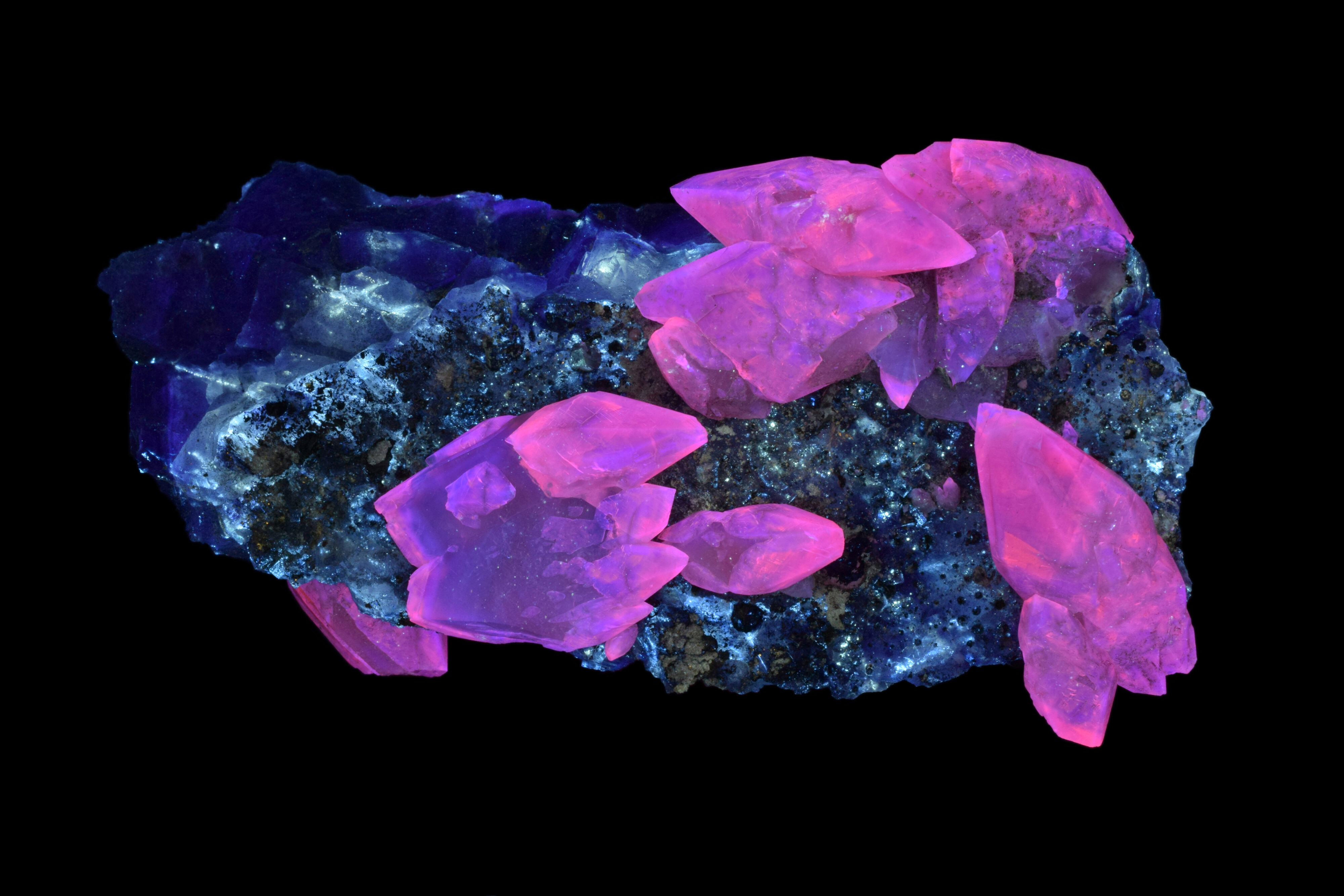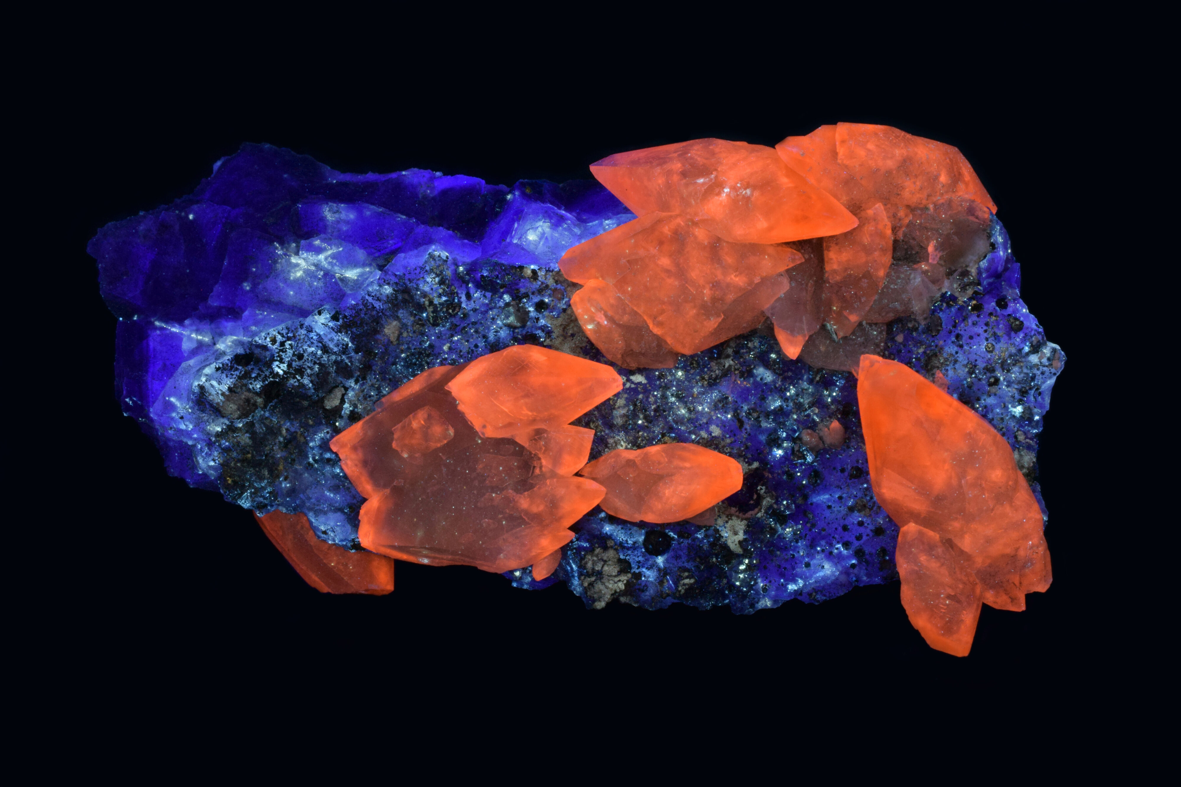 This specimen shows a striking multi-wavelength fluorescent response under UV. The calcite fluoresces bright orange and the fluorite shows a blue/purple response under longwave UV (365nm). Note the bright white wisps, streaks and dots of fluorescent hydrocarbons in the fluorite. Under midwave UV (305nm), the calcite fluoresces a striking pink/magenta color, while the fluorite shows a subdued blue response. The calcite fluoresces orange/yellow and the fluorite shows a pale blue response under shortwave UV (254nm).