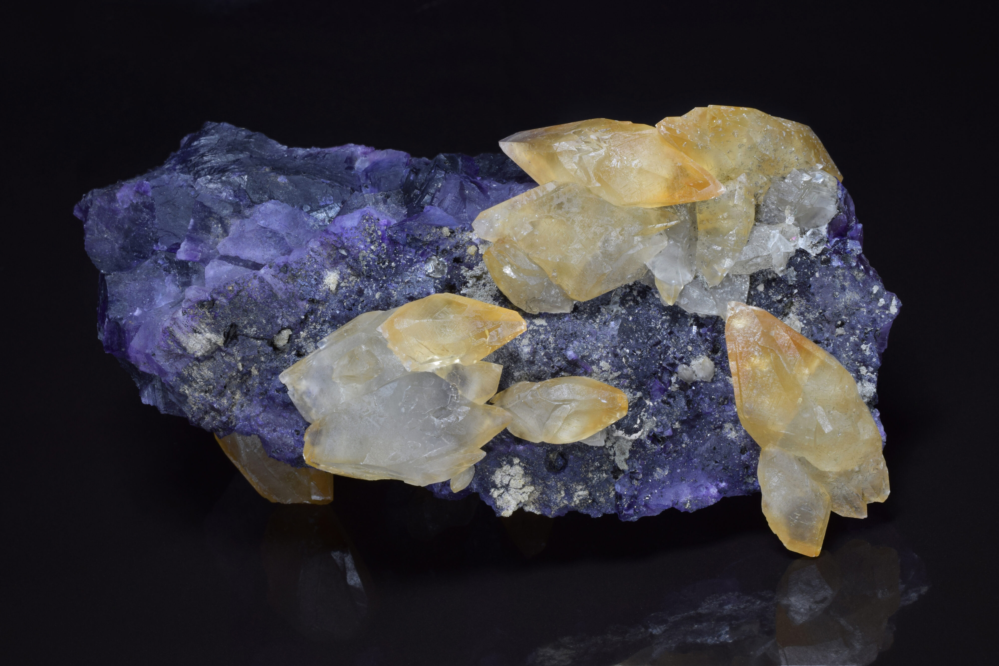 This spectacular fluorescent specimen features multiple golden, twinned, calcite crystals on a matrix of dark purple, hydrocarbon-included fluorite, from the Denton Mine, Cave-In-Rock, Hardin County, Illinois.
