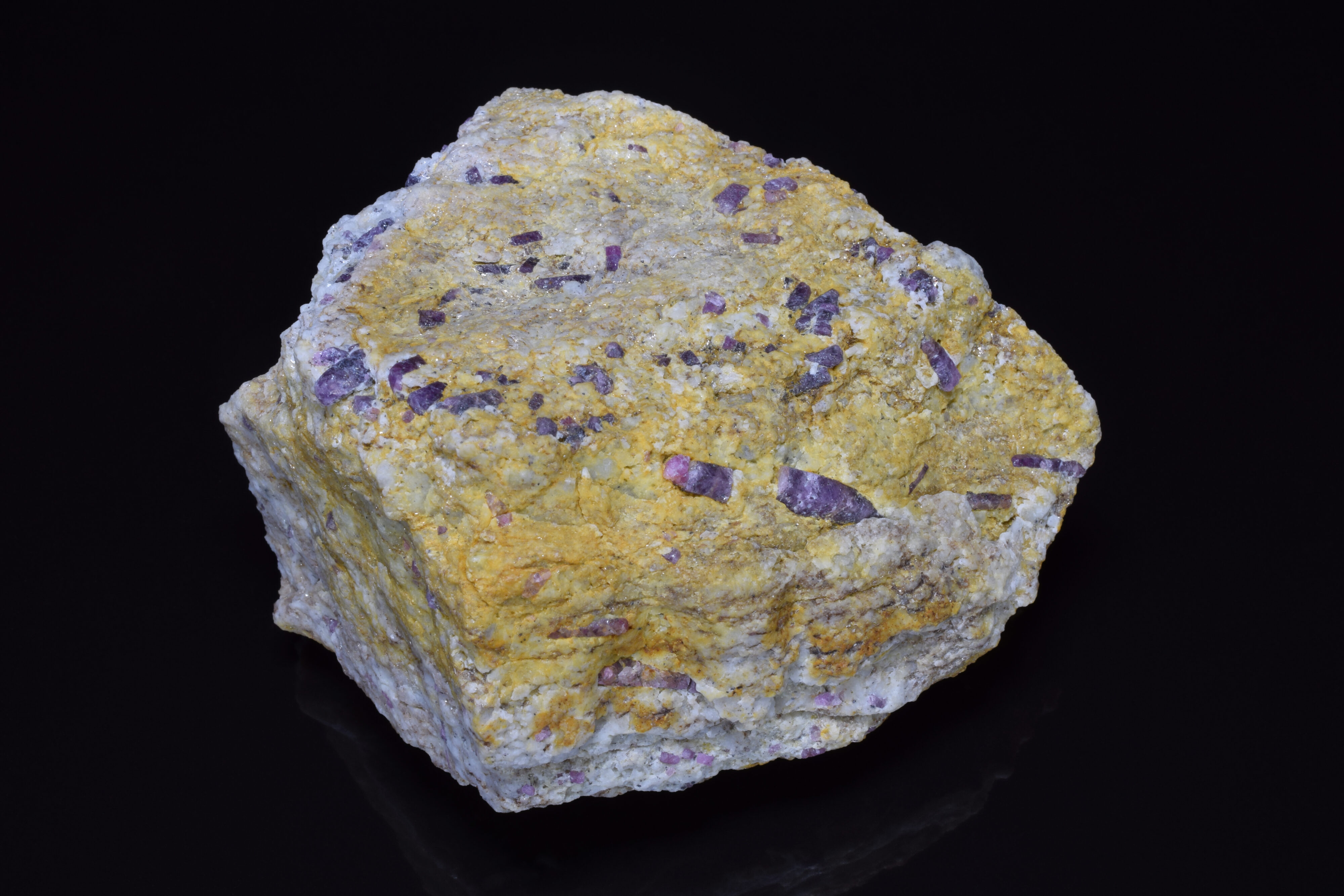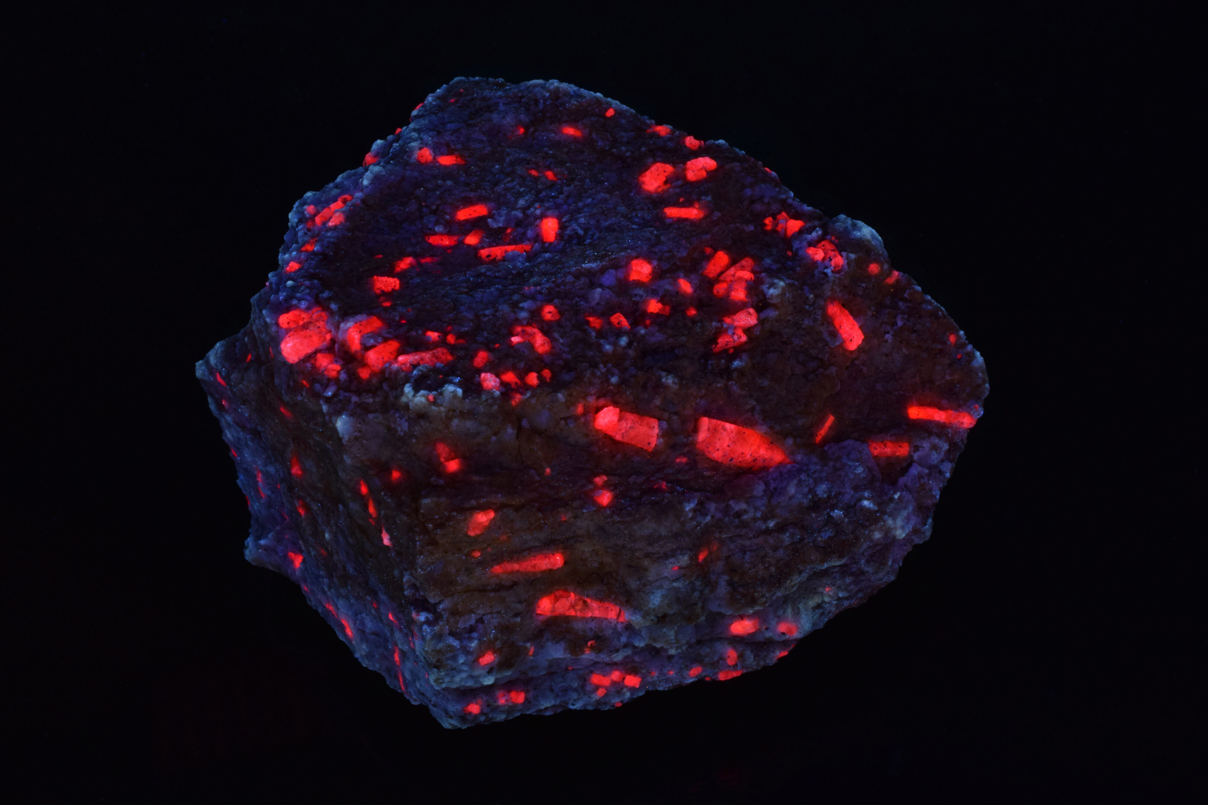 Cascade Canyon is a little-known location situated in the San Gabriel Mountains, northeast of Los Angeles. The rocks of Cascade Canyon are primarily comprised of complexly deformed metamorphosed sedimentary rocks that are notable for their content of red/purple colored ruby crystals. This specimen contains numerous red/purple hexagonal crystals of corundum (ruby) that are found in a light tan colored, schistose matrix that is typical for Cascade Canyon. As seen in the following photograph, bright red fluorescent ruby crystals contrast against a weakly fluorescent matrix of metamorphic rock under longwave UV (365 nm).