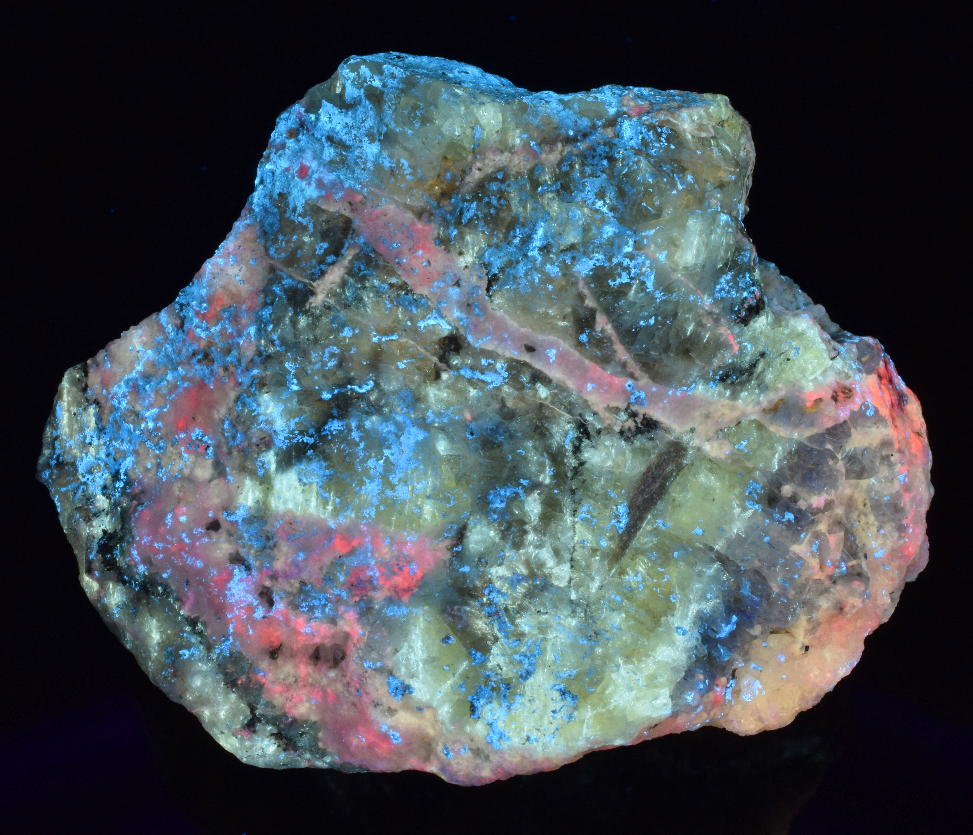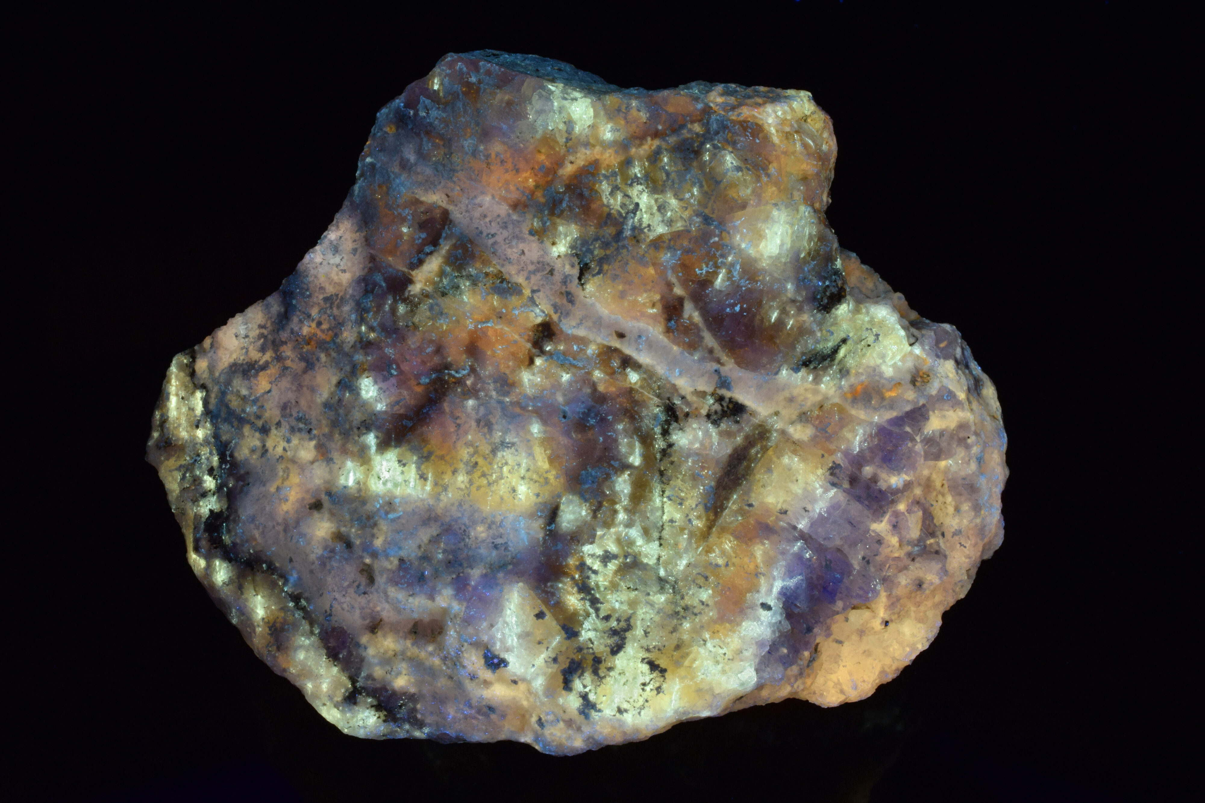 Under shortwave UV (254nm), the fluorite shows a cream/white response, with bright white streaks, clouds and dots of hydrocarbons. Veins of calcite fluoresce pink, red and orange, and numerous patches of post-mining deposited hydrozincite glow bright sky blue.