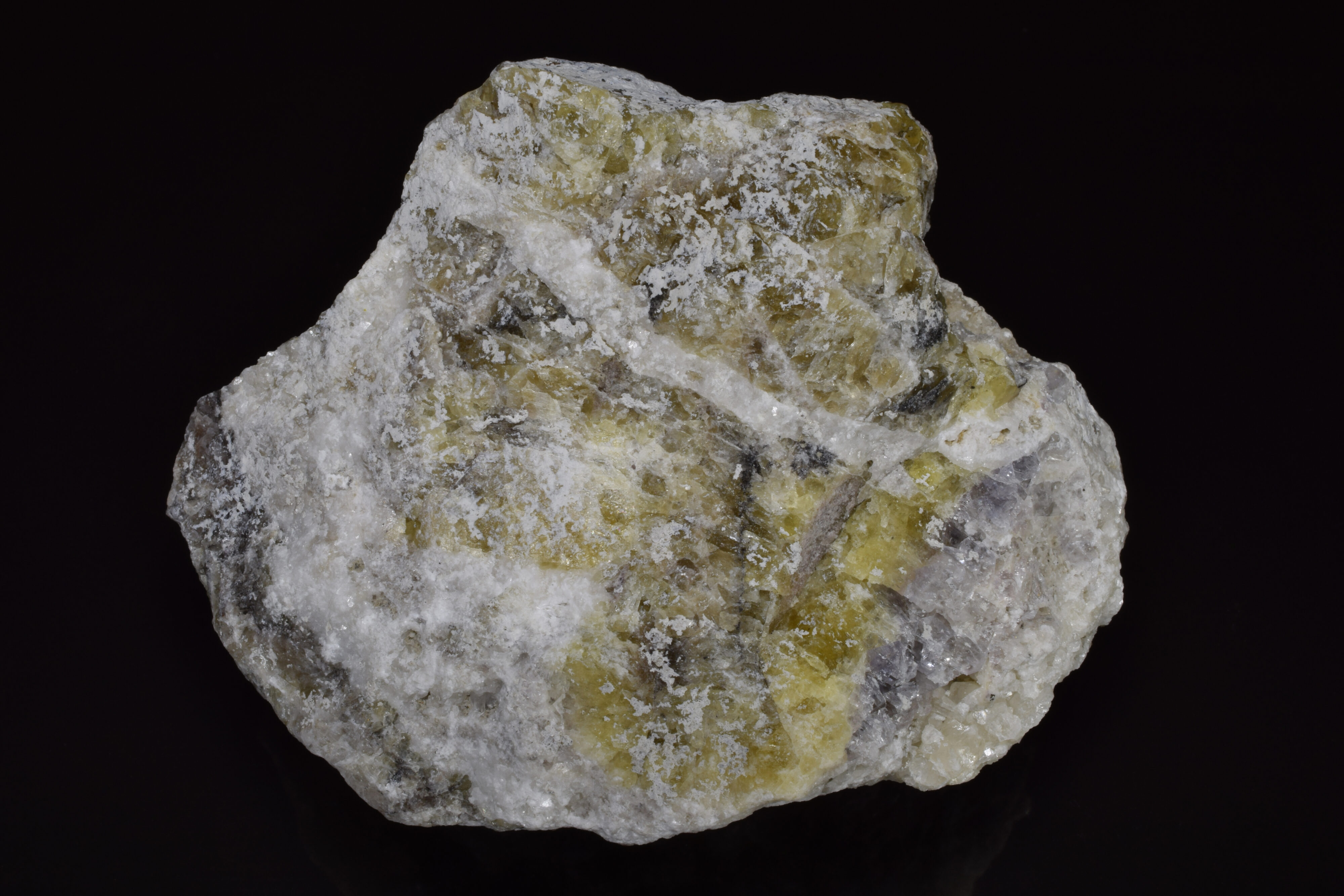 This beautiful multi-colored fluorescent specimen was surface collected from the tailings that remain at the site of the former Minerva No. 1 Mine, in Cave-In-Rock, Hardin County, Illinois. This rock contains mottled areas of pale purple, white and yellow fluorite and a distinct white vein of calcite running diagonally through the upper third of the rock. The post-mining hydrozincite can be seen as a patchy white coating.
