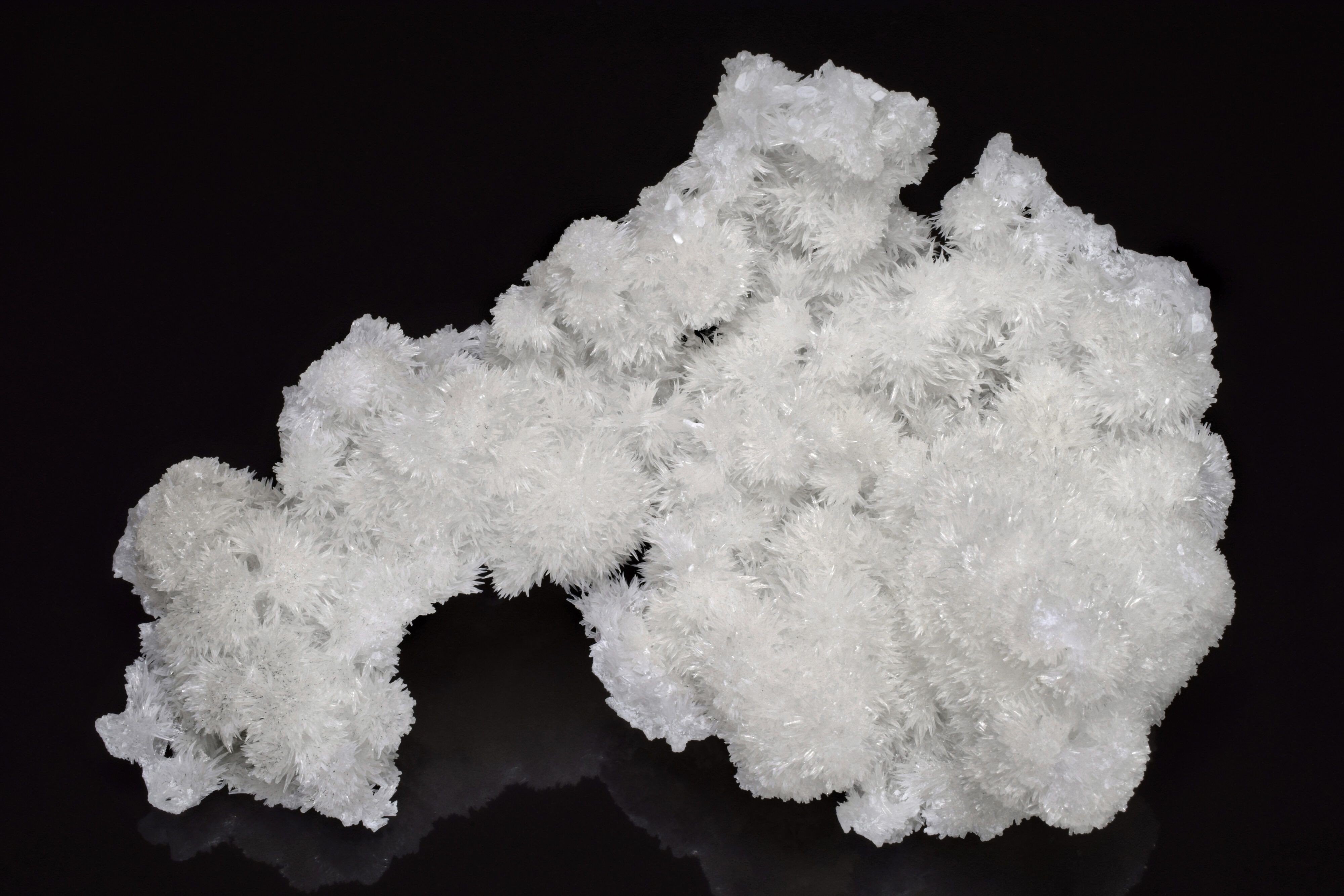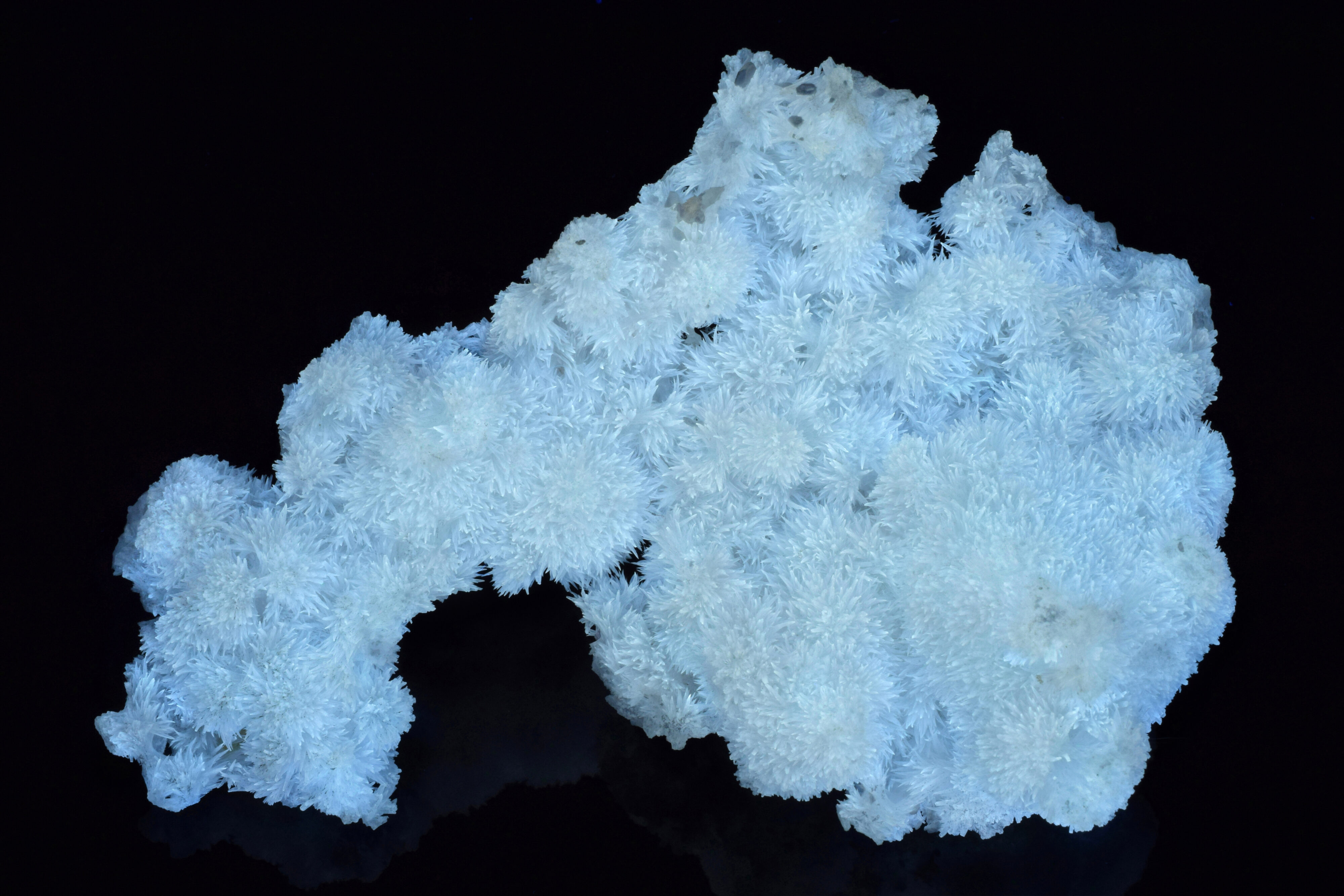 Strontianite is an uncommon strontium carbonate mineral that was sometimes encountered during fluorspar (fluorite) mining activities in the historic Cave-In-Rock mining district in Hardin County, Illinois. Although the last of the famous fluorspar mines in Cave-In-Rock closed in 1995, well crystallized specimens of strontianite can still occasionally be found at rock and mineral shows in the midwestern states. This is a fine example from the Minerva No. 1 mine in Cave-In-Rock. This specimen was mined by Ross Lillie in April 1990. It consists of a large aggregate of radiating, snow-white, acicular crystals of strontianite with no matrix. Shown here under short wave UV, this specimen displays a similar bright blue/white, fluorescent response under both shortwave and longwave UV.