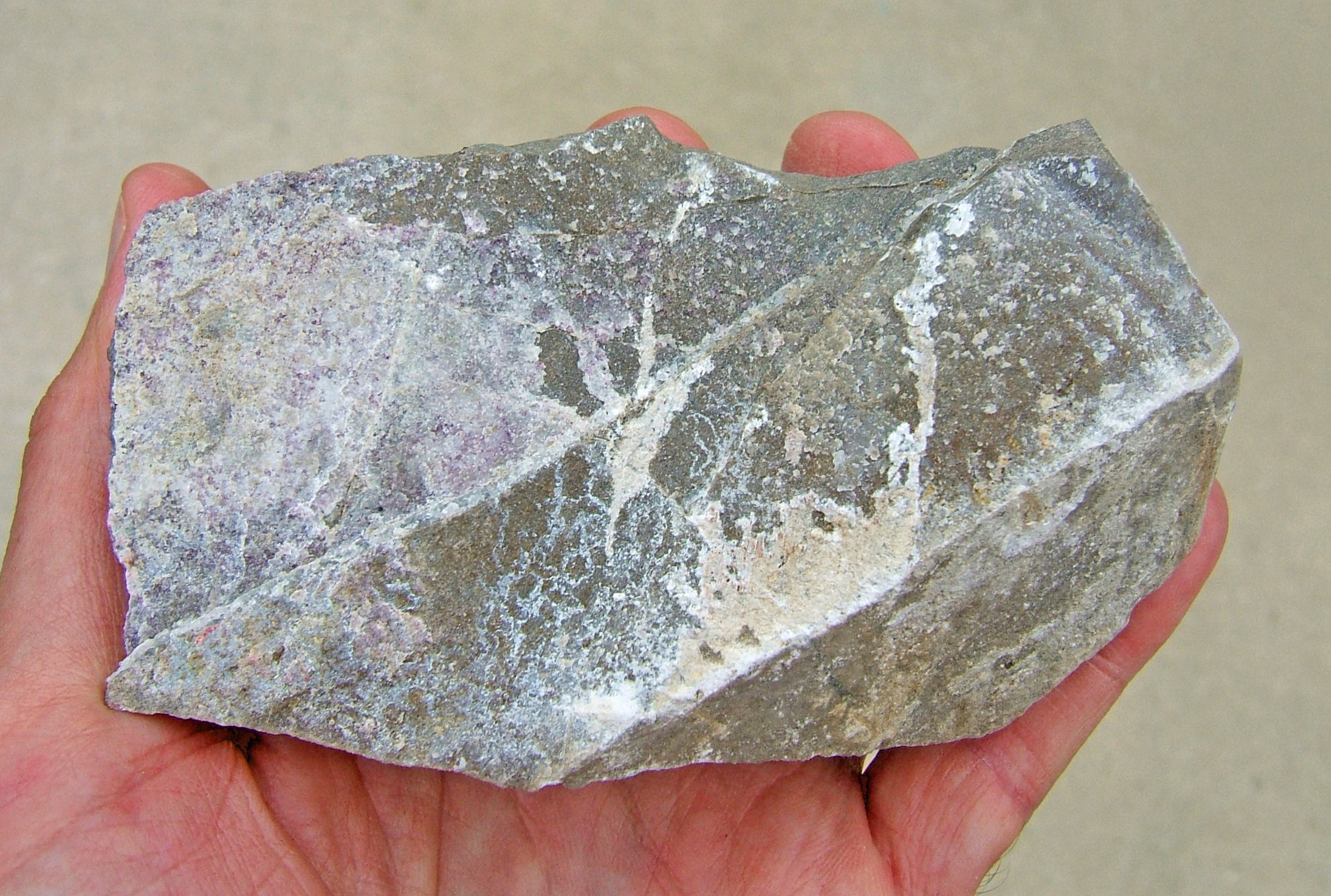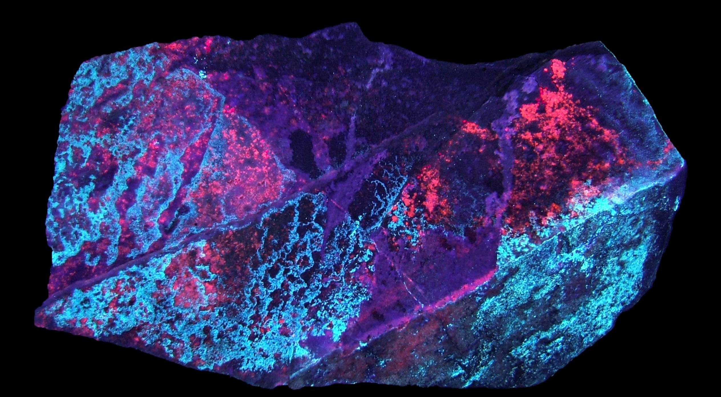 Brightly fluorescent hydrozincite and calcite from the historic Columbia Mine, Marion, Kentucky. Under shortwave UV (254nm) the hydrozincite shows a spectacular veined blue/white response, and the calcite fluoresces a beautiful red/pink color. The specimen was collected in 2015 during a night dig sponsored by the Ben E. Clement Mineral Museum.
