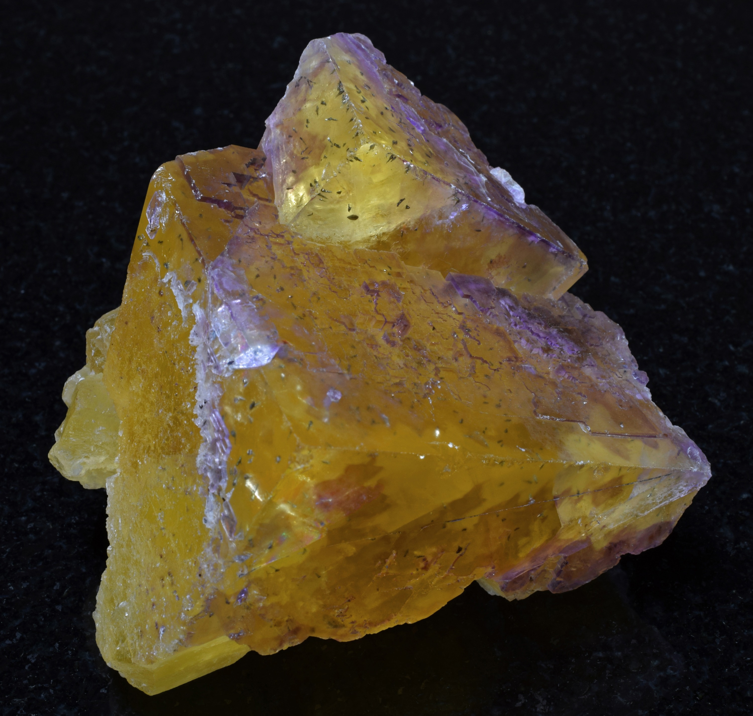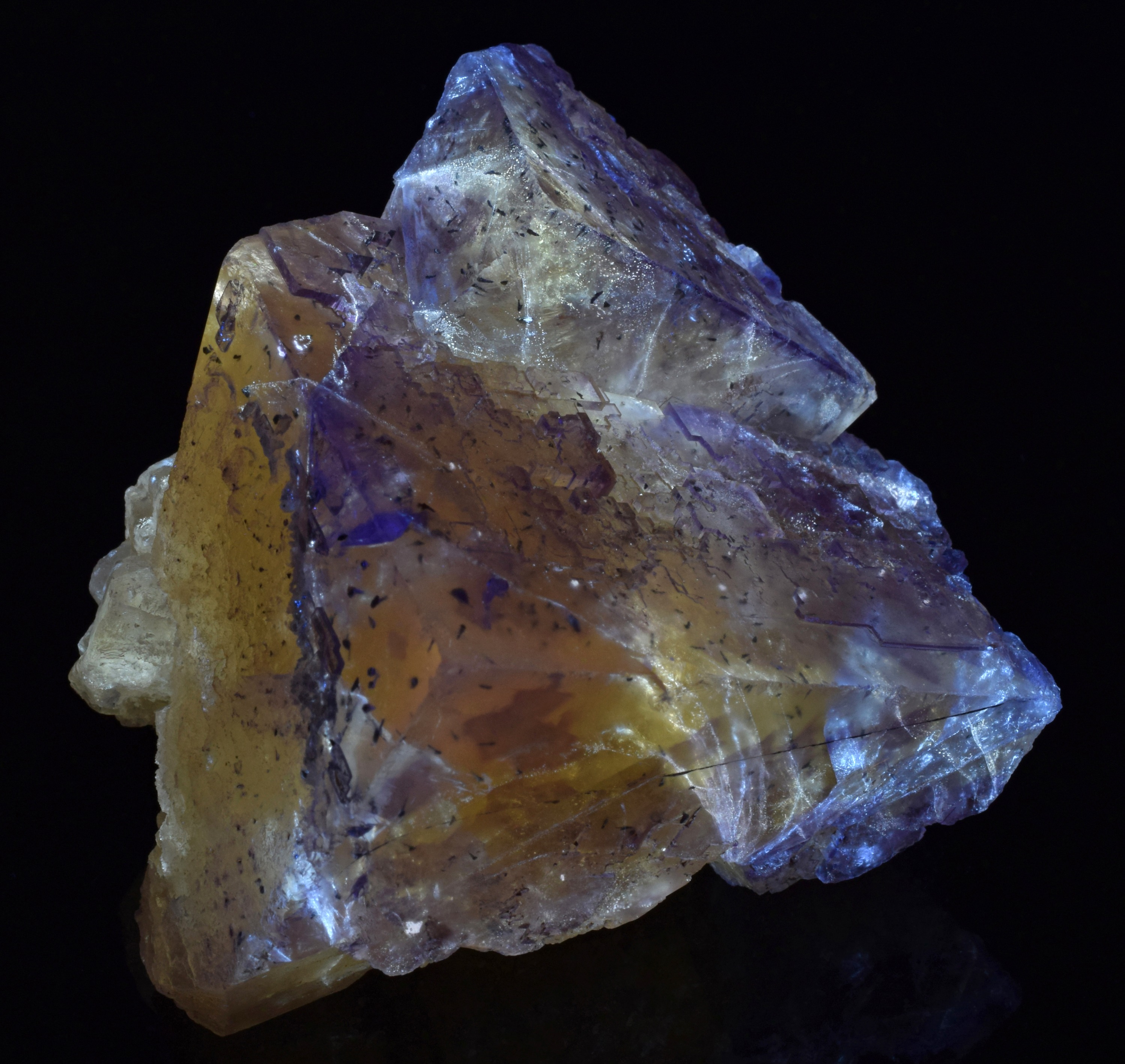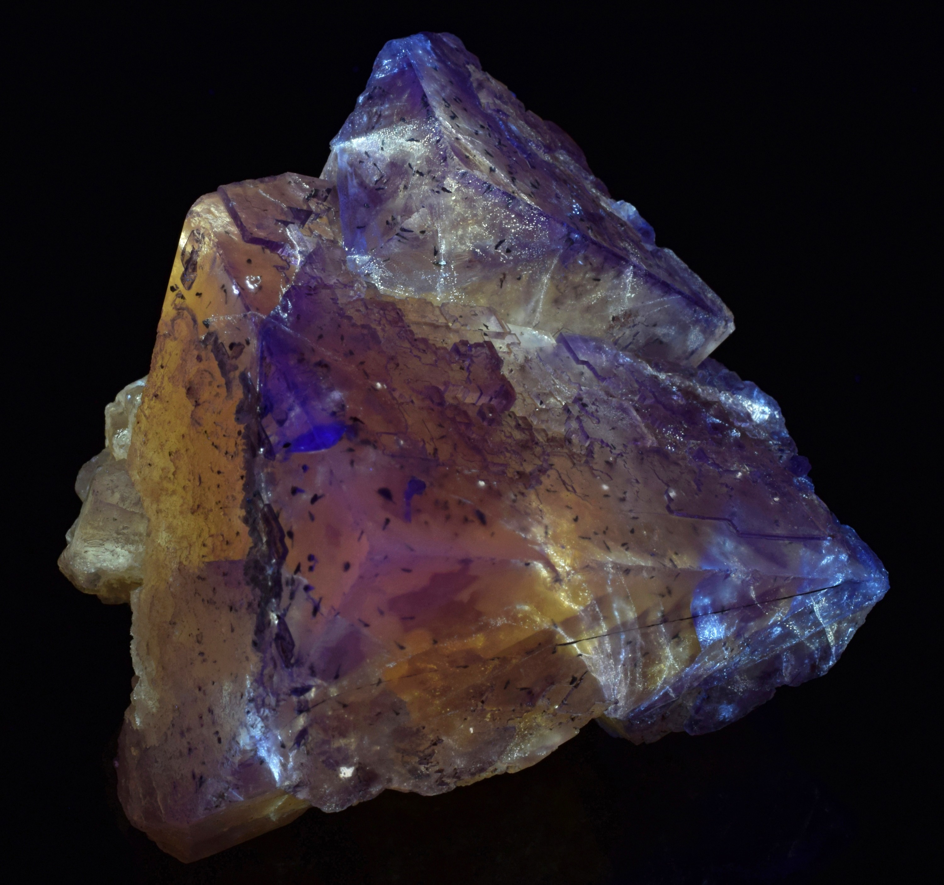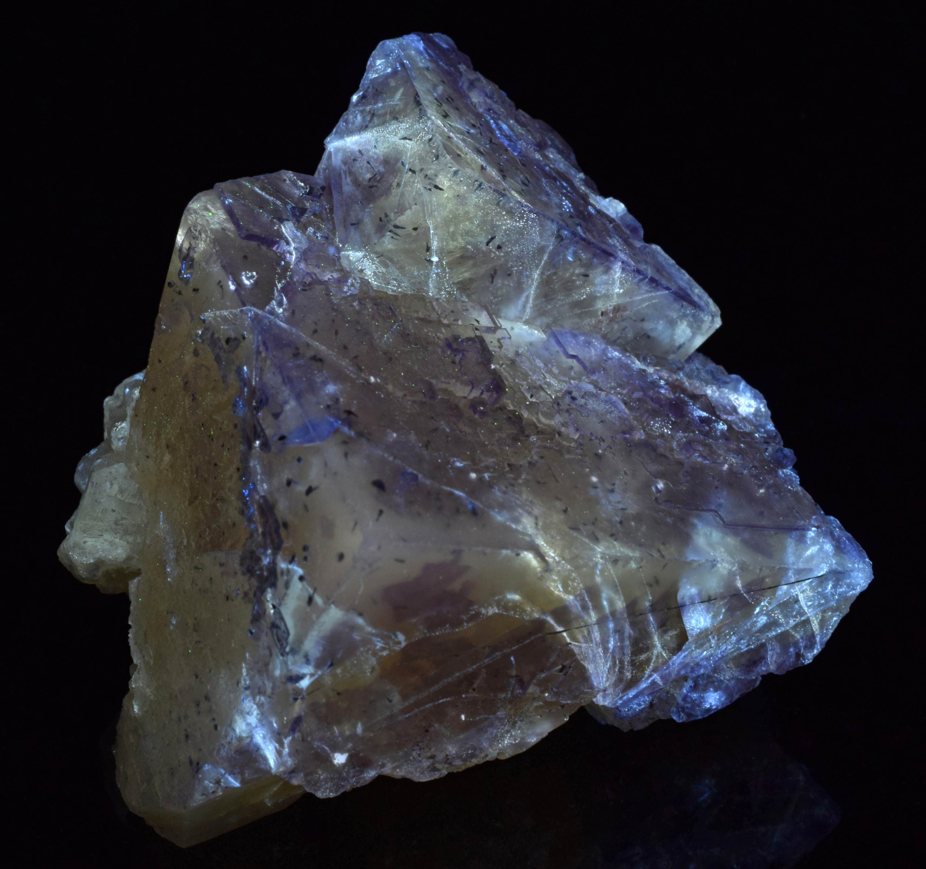 This pair of yellow fluorite cubes from Cave-In-Rock, Hardin County, Illinois, show a very interesting multi-wave fluorescent response due to the presence of wispy hydrocarbon (petroleum) inclusions within the fluorite crystals. Under all wavelengths, the hydrocarbon inclusions show a bright, filamentous, web-like pattern of white fluorescence. Hydrocarbon inclusions are common in fluorite from the Illinois - Kentucky Fluorspar District.