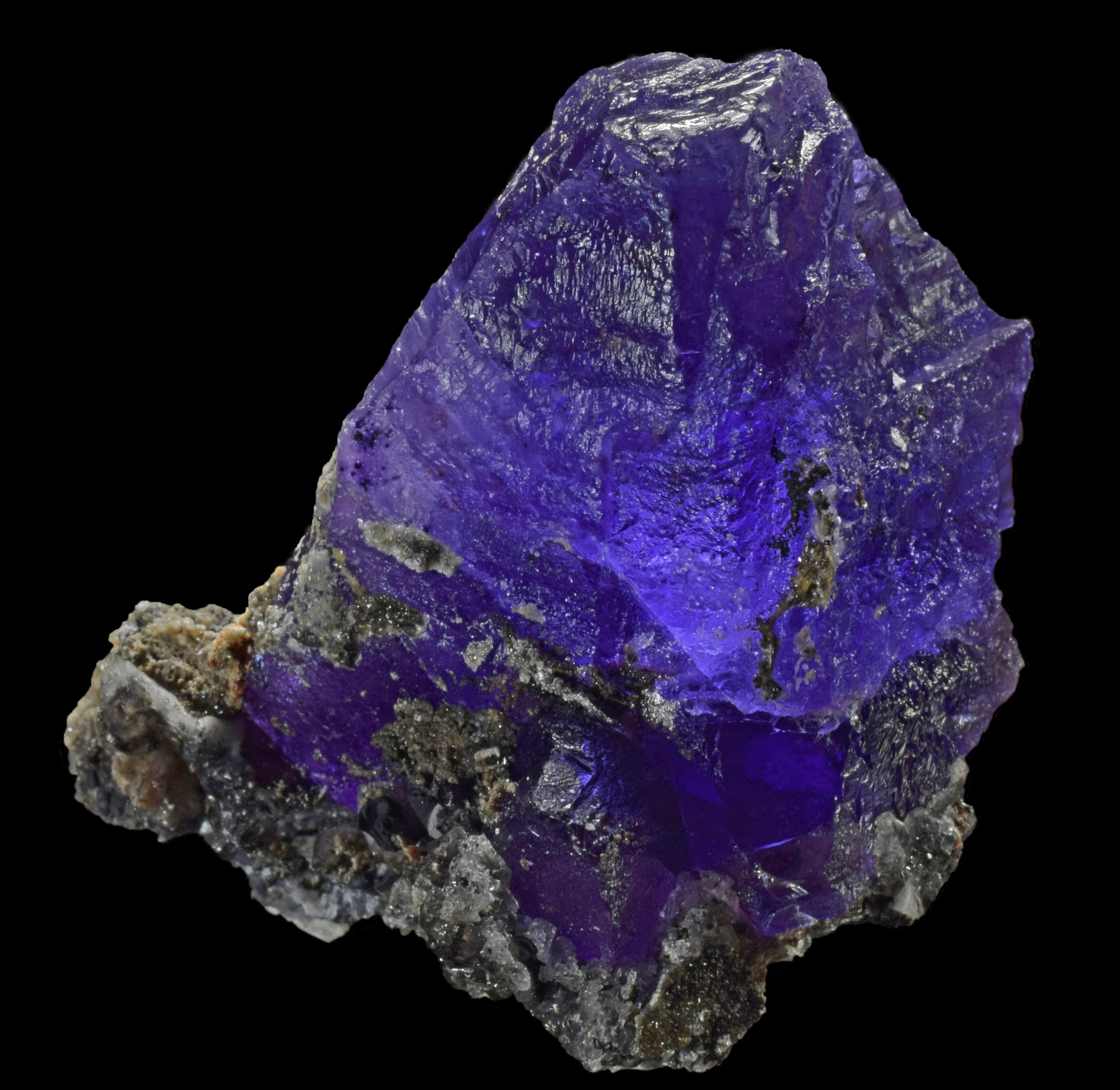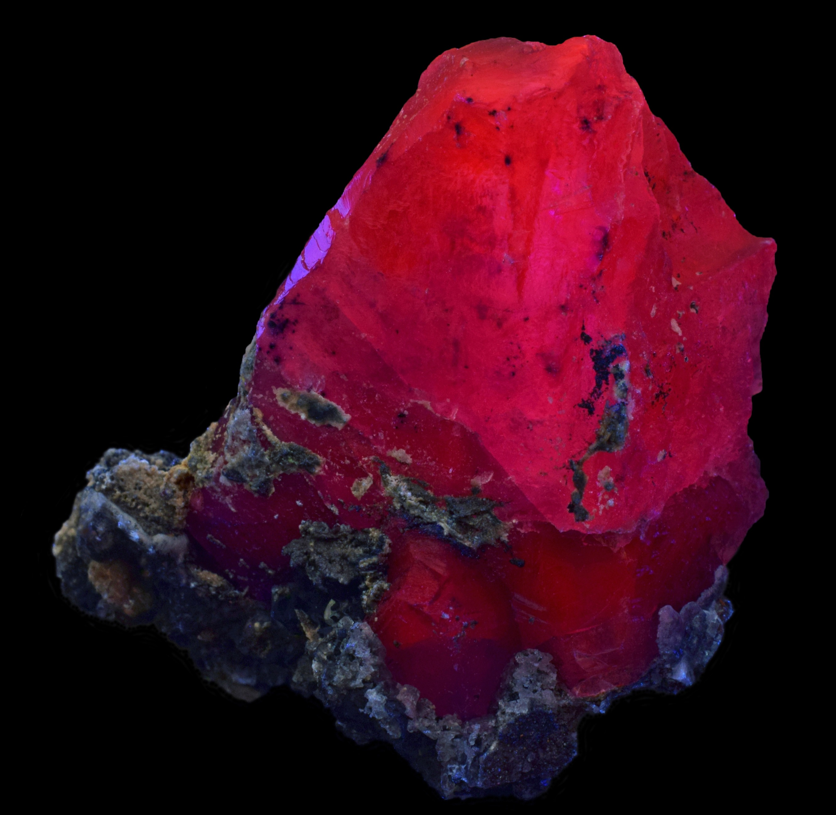 A small percentage of purple fluorite from the Ojuela Mine in Mapimi, Durango, Mexico, shows a beautiful, rich, red fluorescence under longwave UV. This is a very rare and unusual fluorescent response for fluorite, as blue, purple and white are the most common colors of fluorescence seen in this mineral. This is a fine example of red fluorescent fluorite from Mapimi, Mexico. Under visible light, this specimen is a transparent purple color, looking very similar to gem amethyst. Under longwave UV, however, the fluorite fluoresces a deep cherry red.