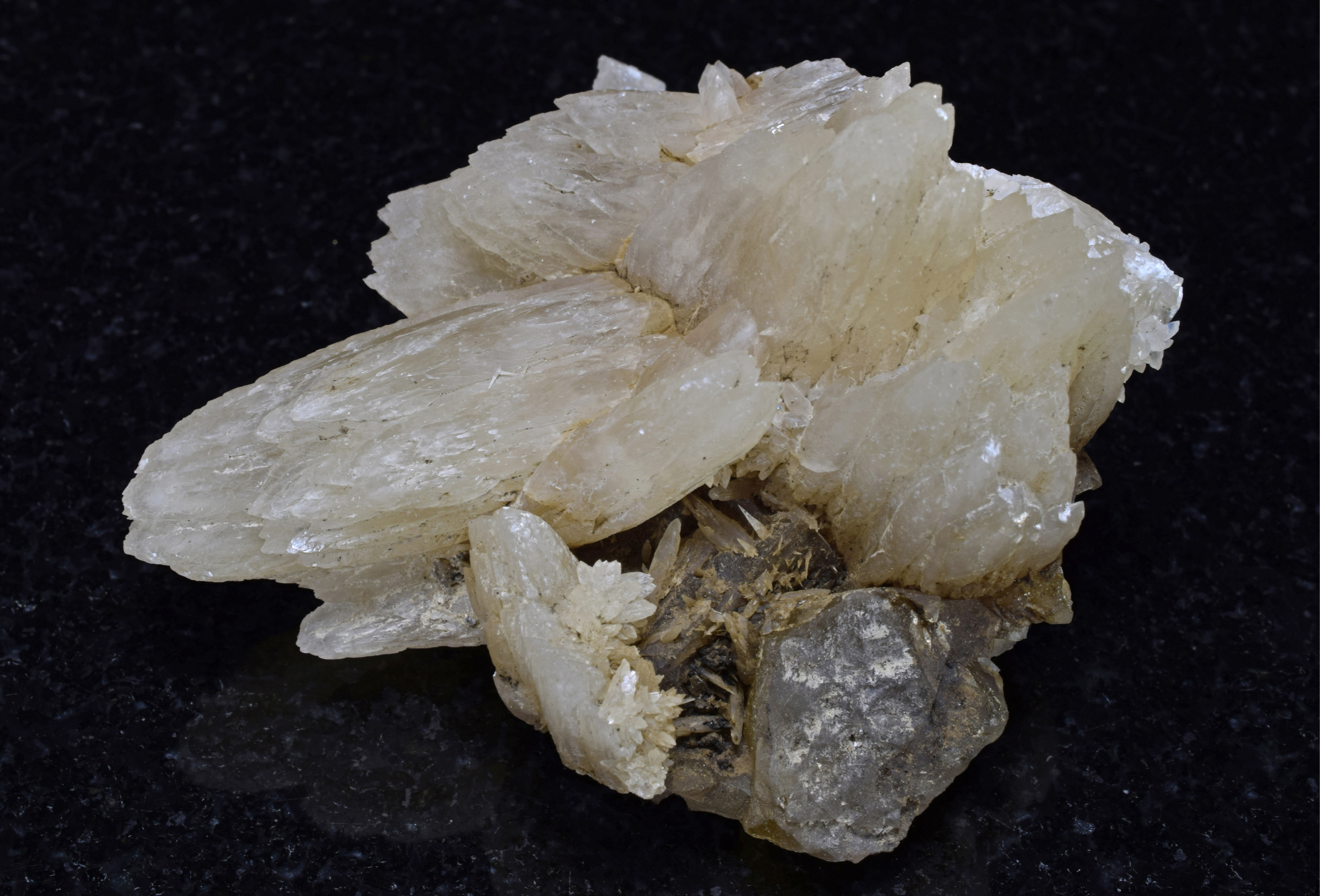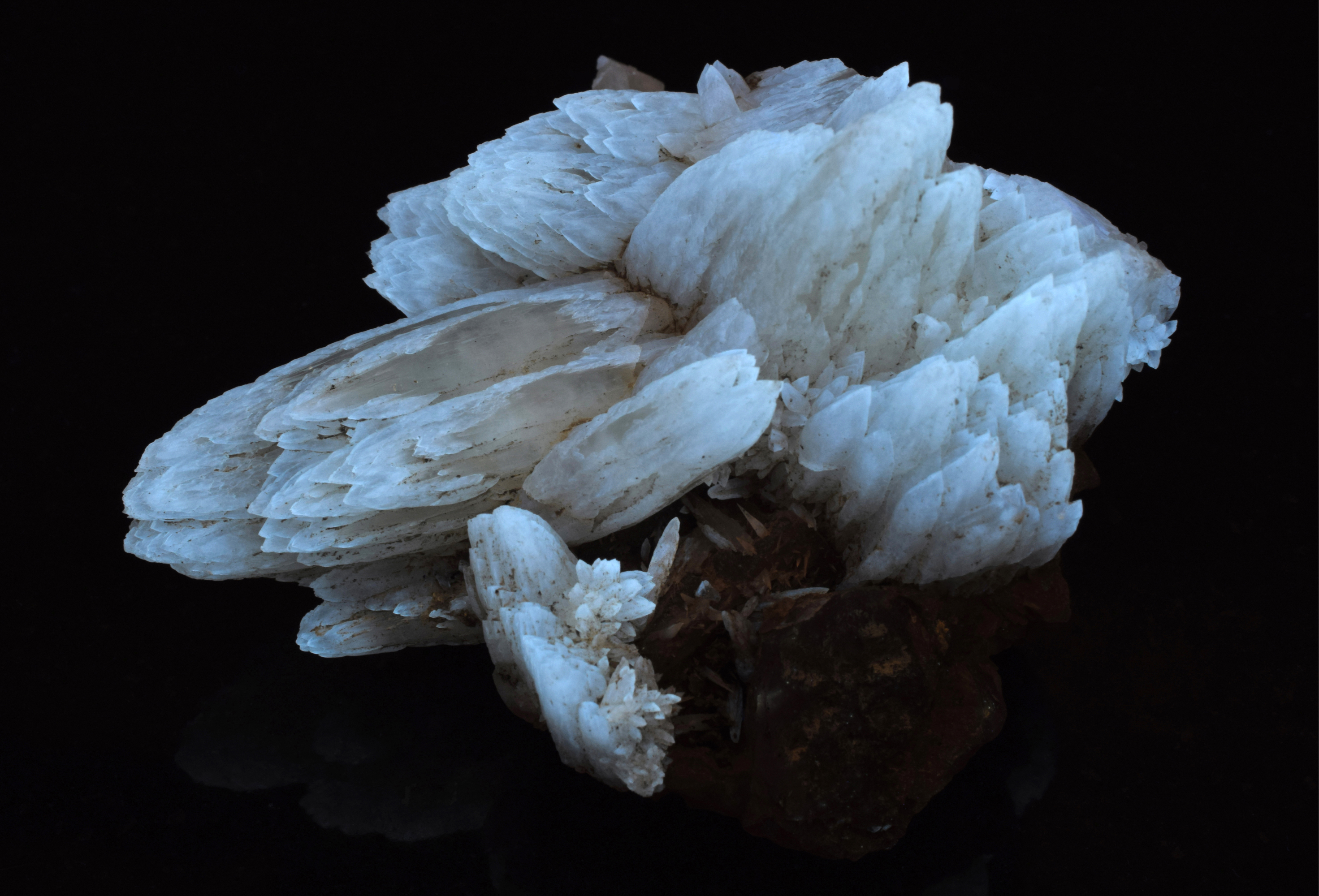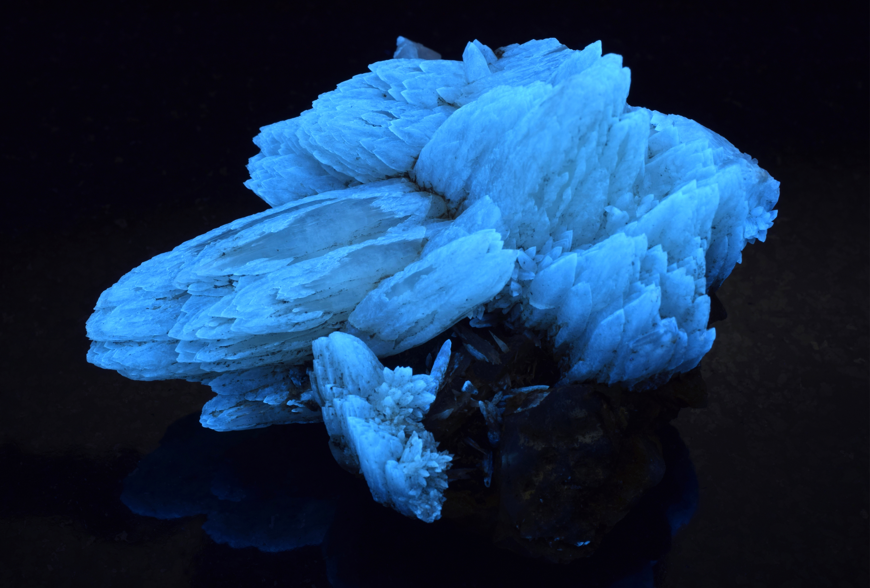 Wheat sheaf bundles of parallel growth calcite crystals on a yellow/brown fluorite matrix, from Cave-In-Rock, Hardin County, Illinois. Under shortwave UV, the calcite shows a bright blue/white, fluorescent response with brief dim phosphorescence. Under longwave UV, the response is a warmer white. The fluorite matrix is poorly fluorescent.