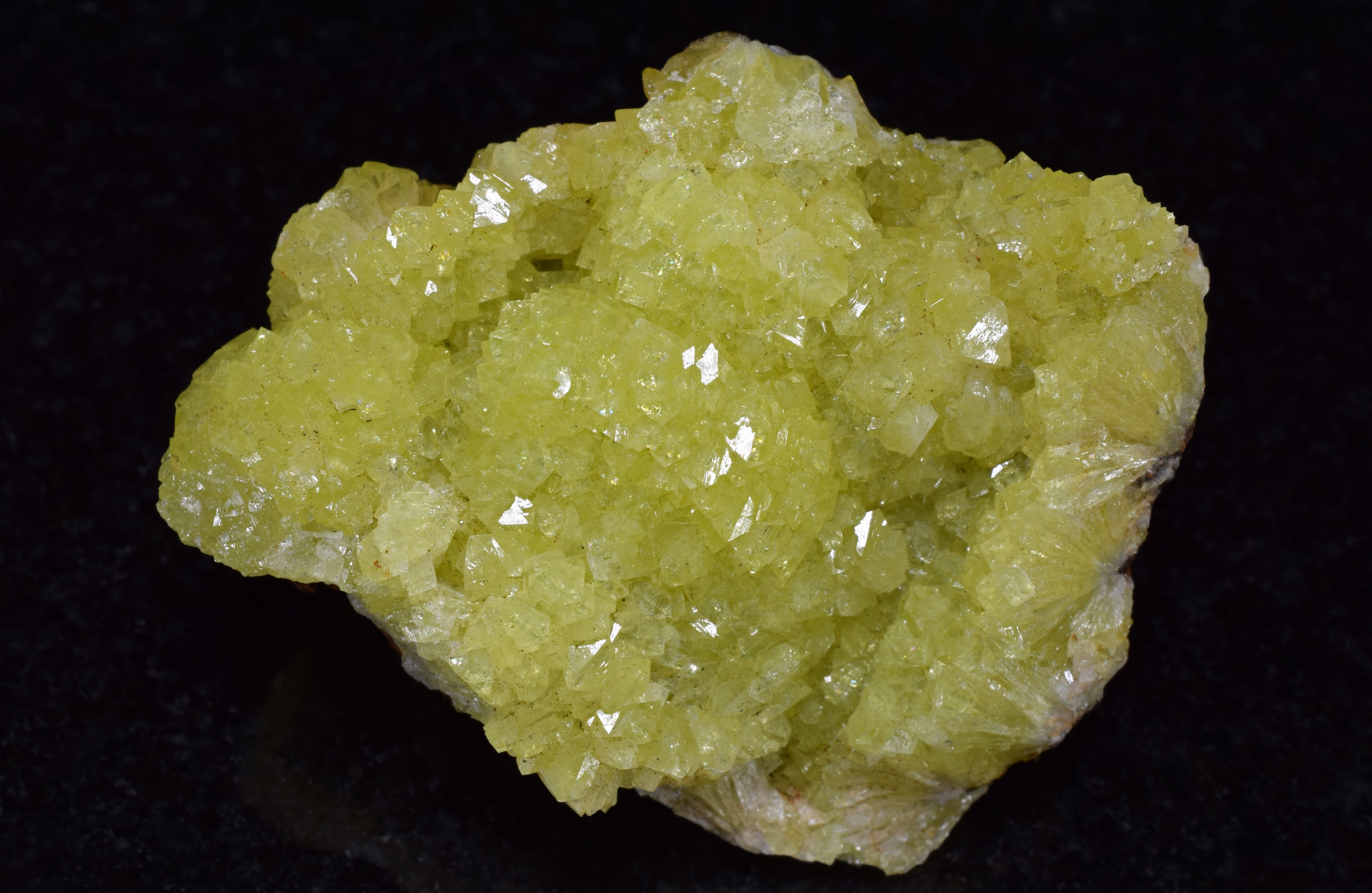 This is an exceptionally bright fluorescent adamite specimen from the Ojuela Mine, Mapimi, Durango, Mexico. Under visible light, yellow/green adamite crystals are seen on a contrasting red/brown gossan matrix. This specimen is brightly fluorescent under both shortwave and longwave UV, with the shortwave fluorescence rivaling some of the Franklin willemites.