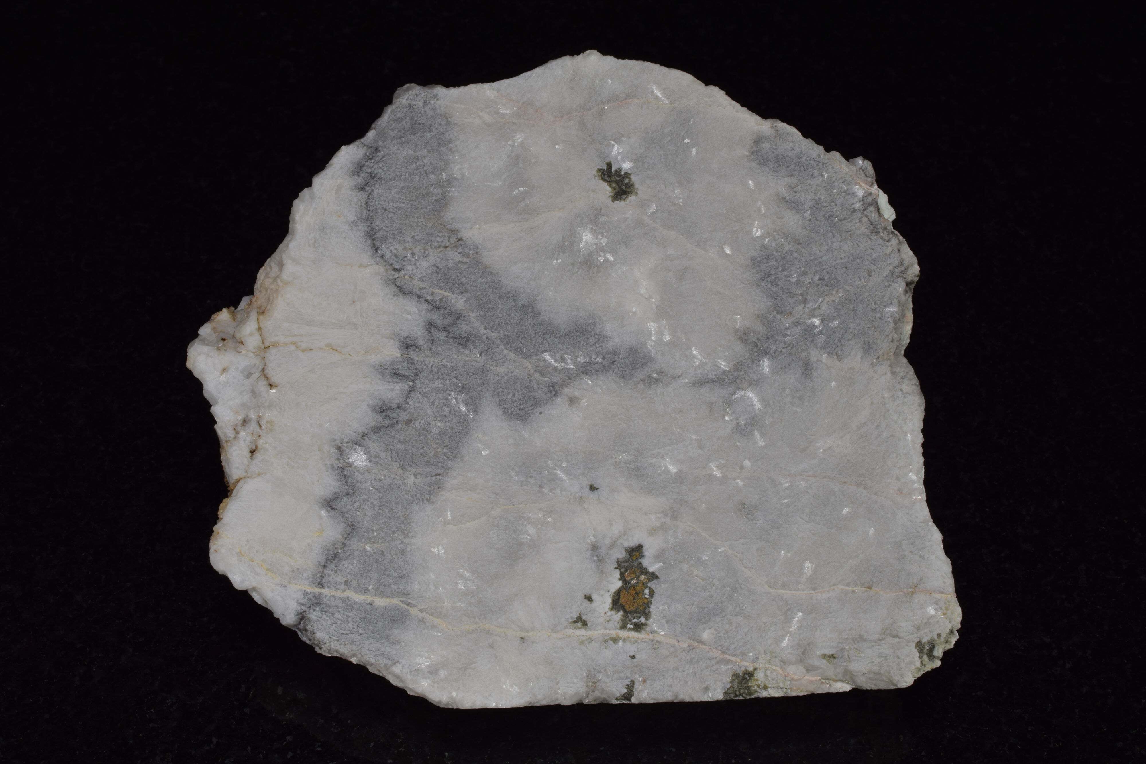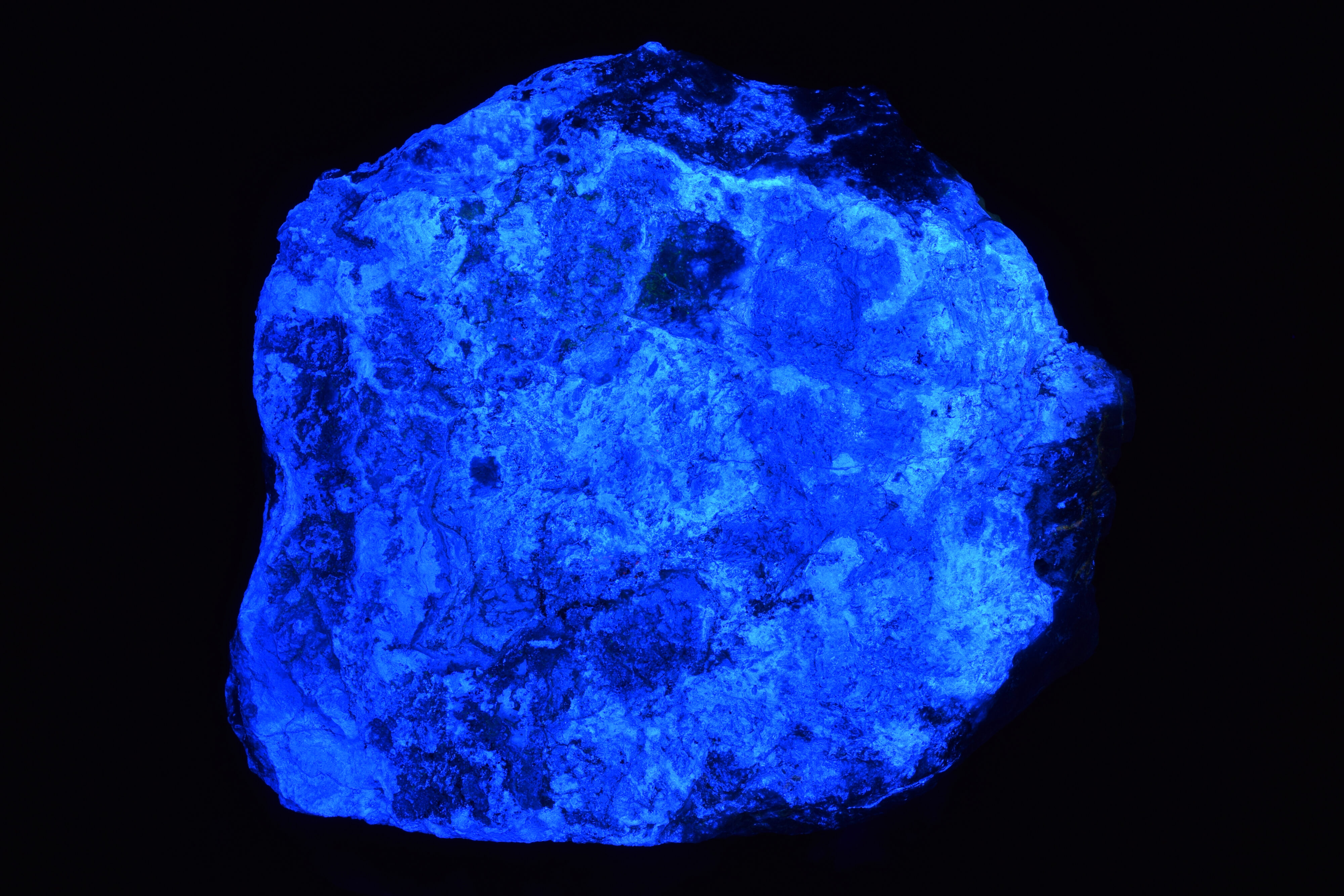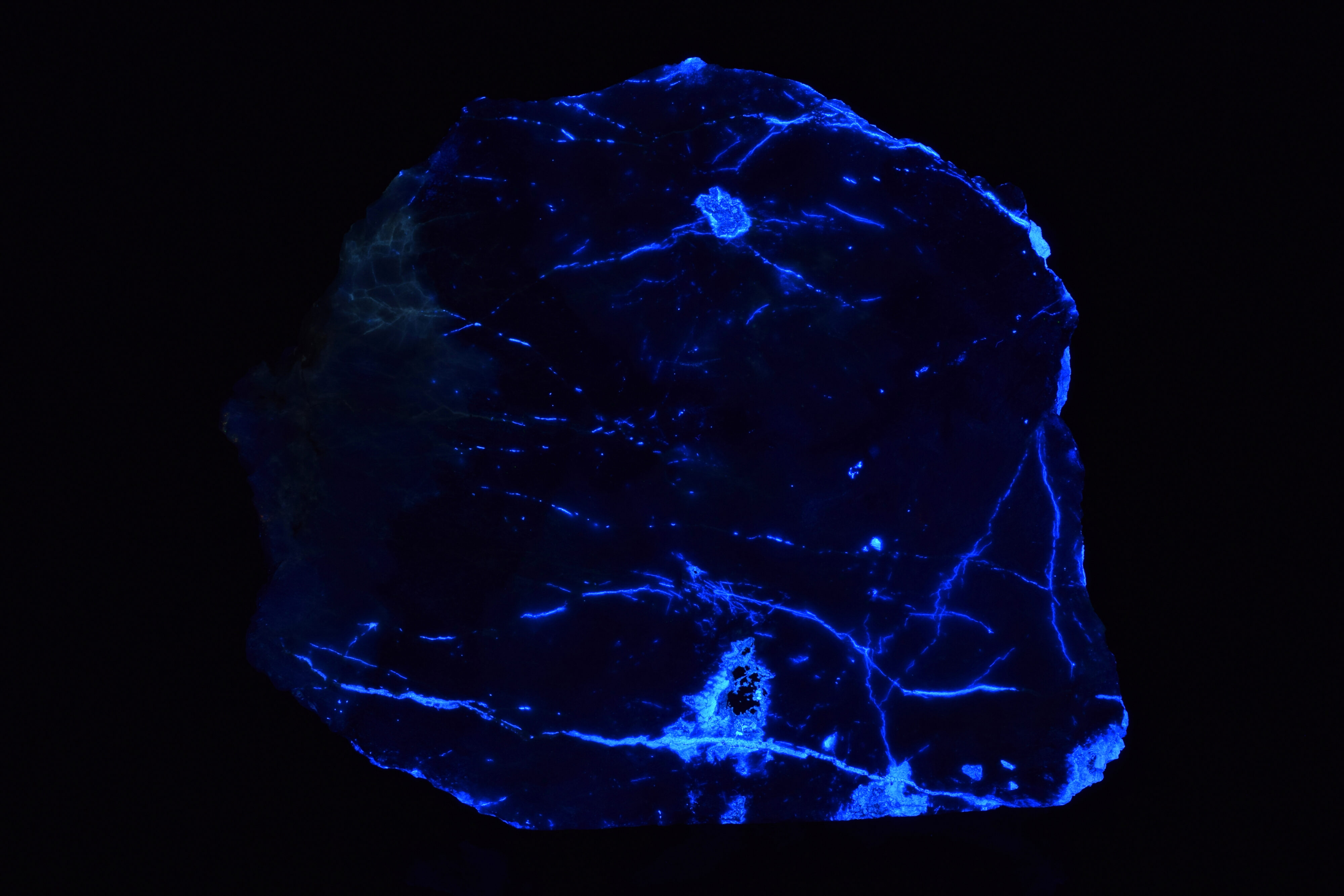 Normally I am not a big fan of cutting or polishing rocks, as I prefer them in their original, natural condition. I will make an exception with this one though. It is from Goodsprings, Clark County, Nevada, and is a cut end slab of dolomitized limestone with an outer coating of brightly fluorescent hydrozincite. Hydrozincite is a zinc carbonate hydroxide, and occurs as an oxidation product of zinc ores, typically forming masses or crusts. Under shortwave UV the hydrozincite fluoresces bright blue/white. The interior cut surface reveals fluorescent veins of hydrozincite following the internal cracks in the limestone host rock.