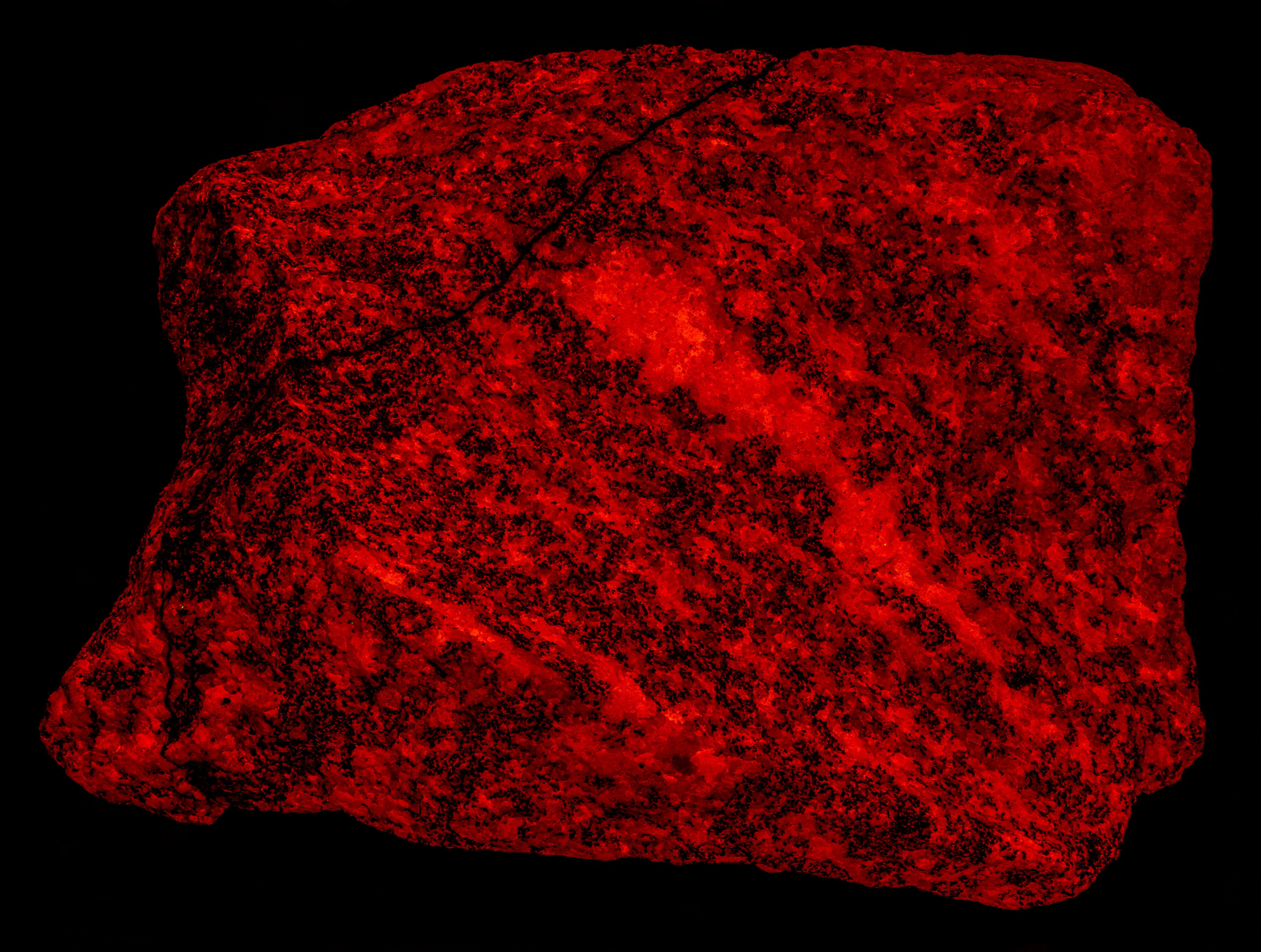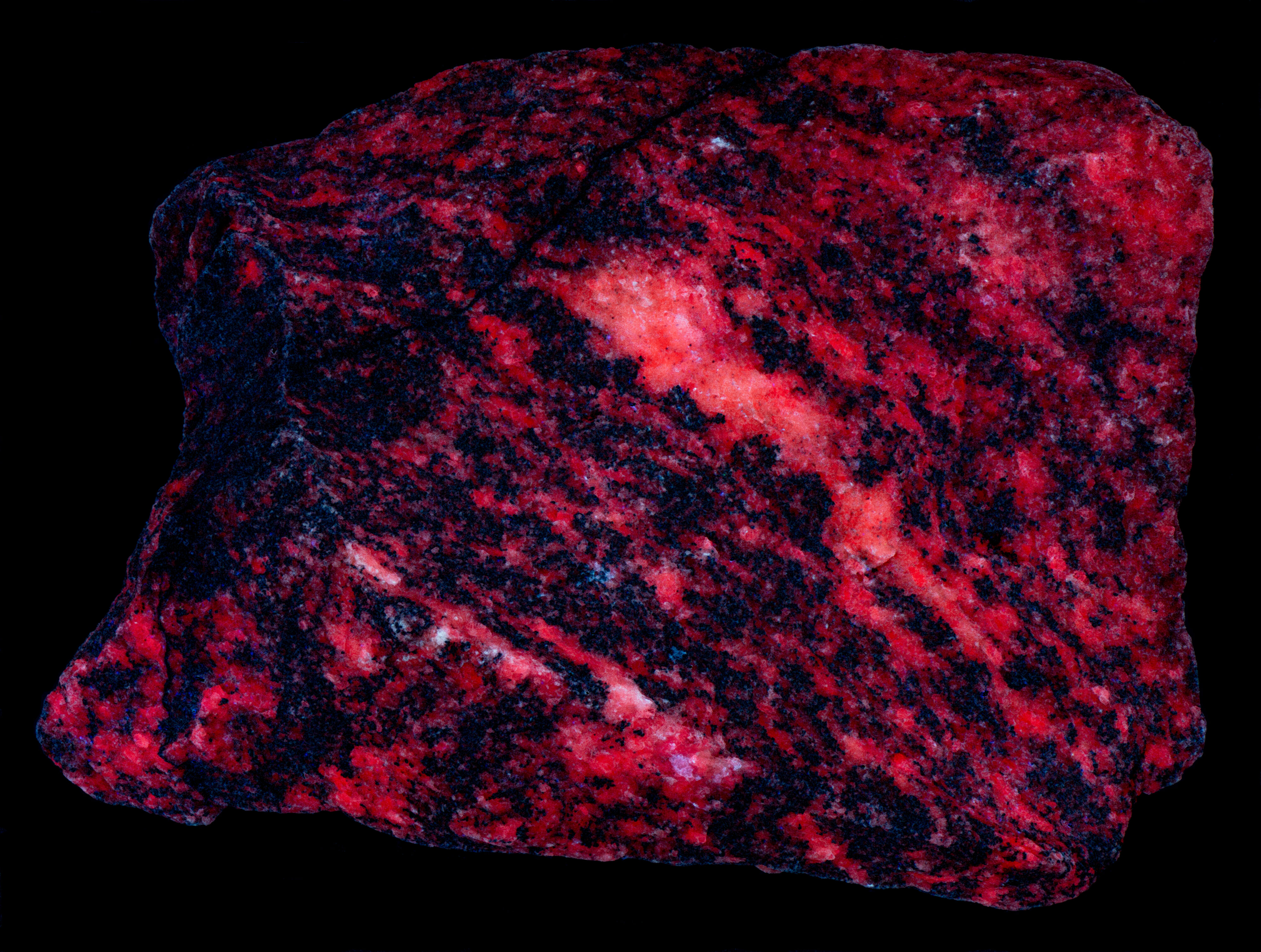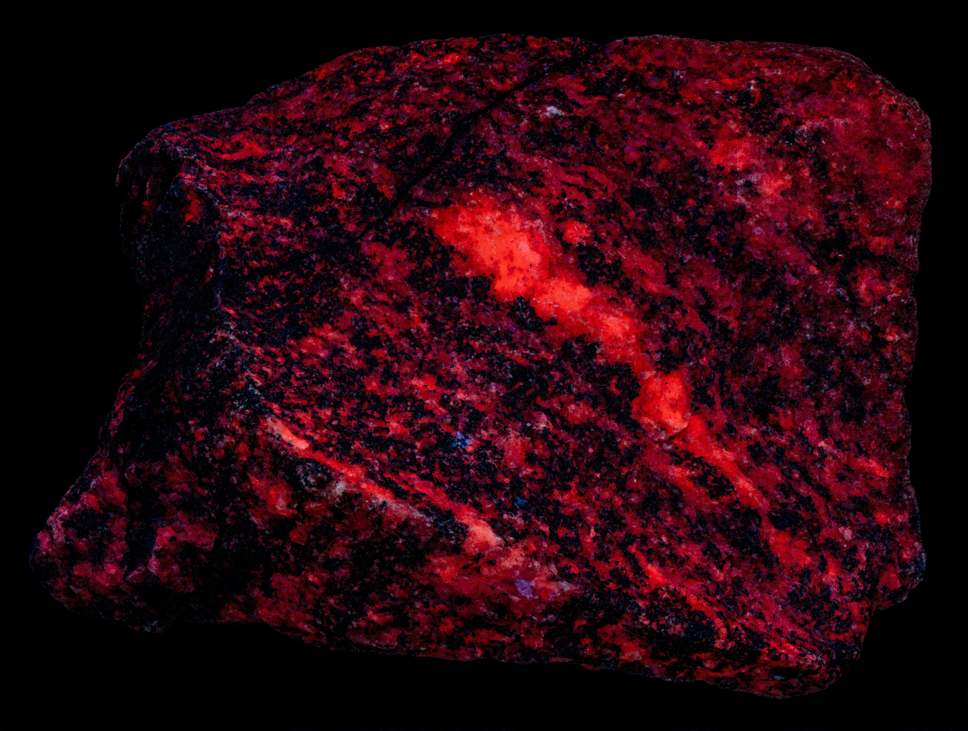 A banded Calcite (CaCO3) and Dolomite (CaMg(CO3)2) specimen from the Lake Dump, Langban Mine, Varmland County, Sweden. The calcite fluoresces orange red under all wavelengths of UV light. The dolomite is dark red under shortwave UV light. It is considerably dimmer under longwave and midwave UV light. Neither mineral fluoresces in the ultraviolet region like many other red fluorescent calcites.