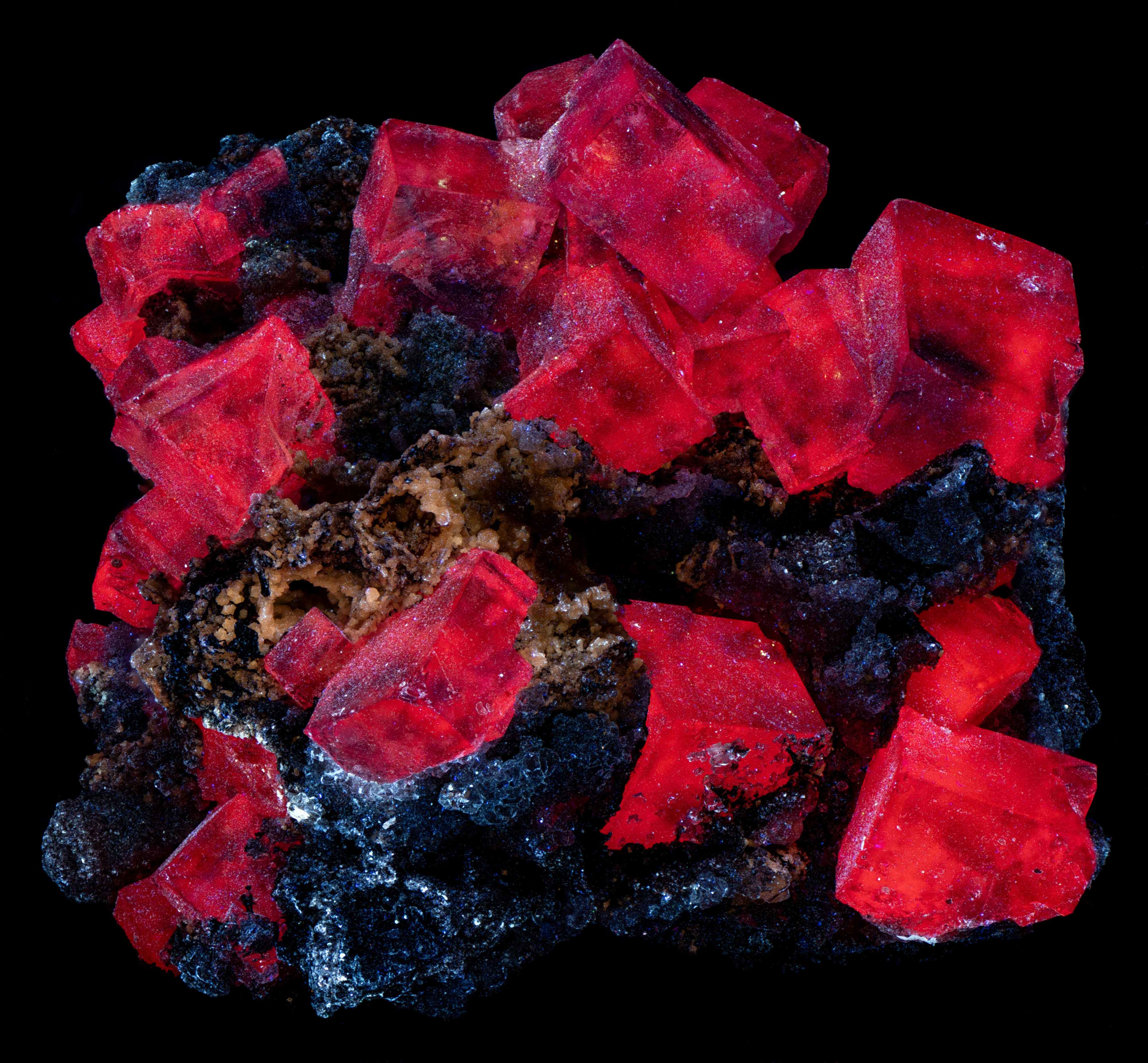 This is a specimen of purple fluorite cubes from Ojuela Mine, Mapimi, Durango, Mexico. The fluorite fluoresces bright red under longwave UV light. It’s fluorescence is dimmer under midwave light and non-fluorescent under shortwave light.