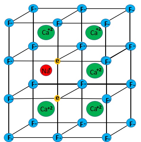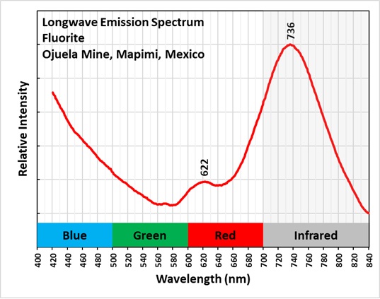 The longwave emission spectrum of the bright red fluorescence has a broad peak at 736 nm and a smaller peak at 622 nm. The emission spectra indicates that the red and near infrared fluorescence is a combination of two types of activation. Details of the two mechanisms are discussed in Gaft and others (2020). One mechanism is the presence of M-centers. An M-center forms when two nearby fluorine ions (F-) are missing and are replaced by electrons. The M-center is stabilized by replacement of a calcium ion by a sodium ion. The M-centers are formed by naturally occurring radiation that caused the formation of crystal lattice defects. The fluids that deposited the fluorite were radioactive, but there is no residual radioactivity. The radioactivity also caused the purple color of the fluorite. The purple color is caused by colloidal calcium, not the M-center. According to Gaft and others, the M-center activates a broad emission peak with a maximum at 750 nm and a smaller peak at 635 nm.