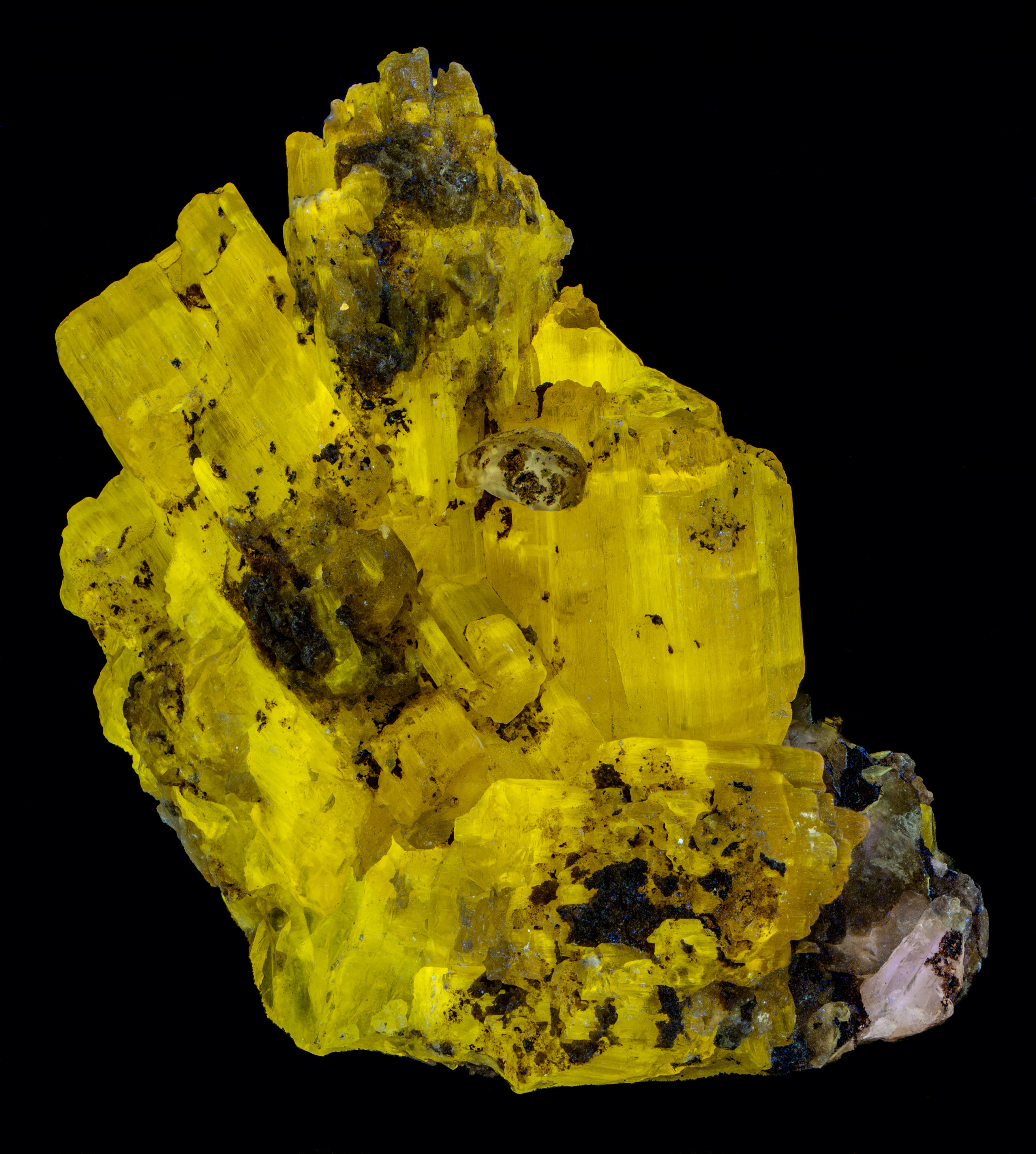 This phosgenite specimen fluoresces bright yellow under longwave UV illumination. The yellow fluorescence is dimmer under midwave light, and it is non-fluorescent under shortwave light. The longwave emission spectrum is a broad peak with a maximum at 540 nm. Phosgenite fluorescence is intrinsic, it is activated by atoms of lead in its crystal lattice. It is not caused by an impurity activator.