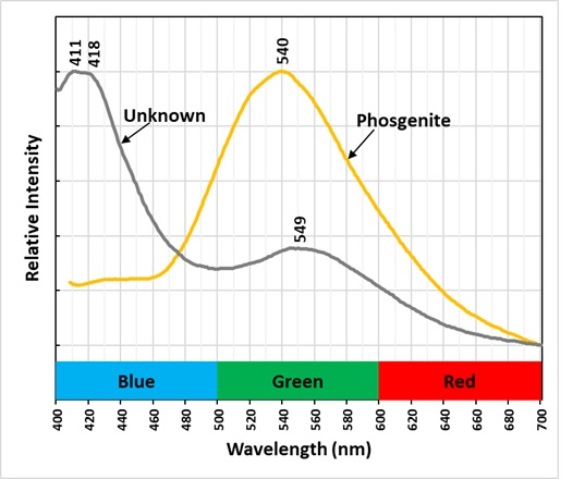 In the lower right corner of the specimen is a white, fluorescent mineral under longwave light. The white fluorescence is dimmer under midwave and shortwave light. The longwave emission spectrum of this unknown mineral has two close peaks at 411 nm and 418 nm and a broader peak with a maximum at 549 nm. Possible mineral ID’s for this white fluorescent are cerussite (PbCO3) or anglesite (PbSO4) which also form in the oxidized zone of lead ore deposits from the alteration of galena.