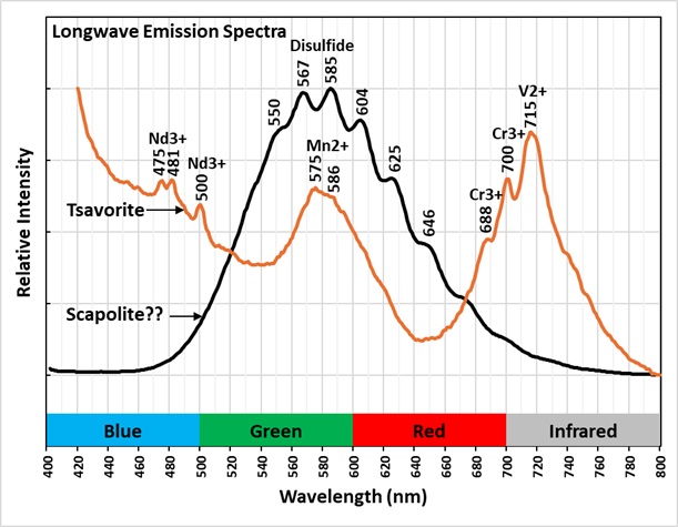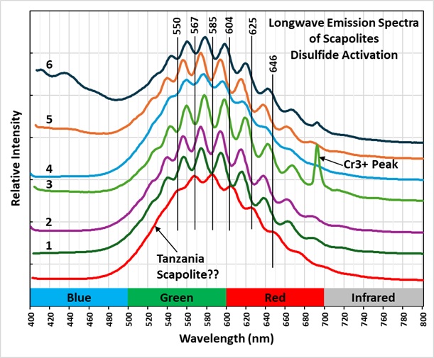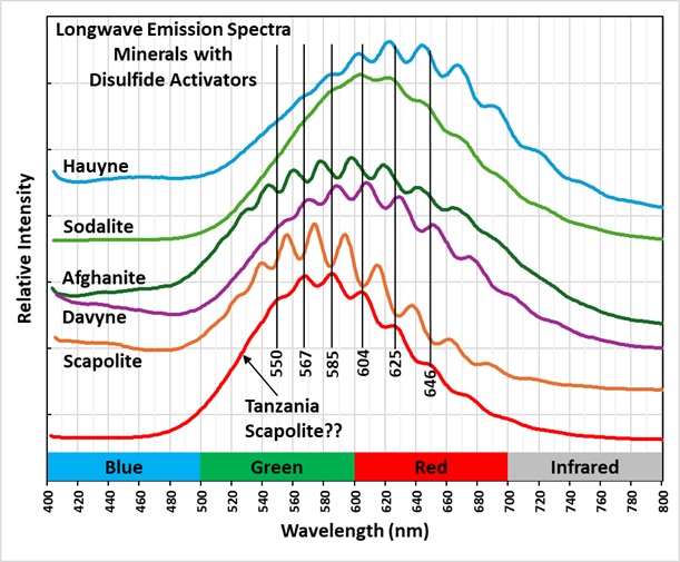 These spectral comparisons suggest that the yellow fluorescent mineral may not be scapolite, but another mineral. Scapolite is a solid-solution series between the end members marialite (Na4Al3Si9O24Cl) and meionite (Ca4Al6Si6O24CO3). The different emission spectrum of the Tanzania scapolite may be caused by a mixture of marialite and meionite or the difference may be caused by cation and anion impurities that change coordination with the disulfide ion and therefore change the emission spectrum.