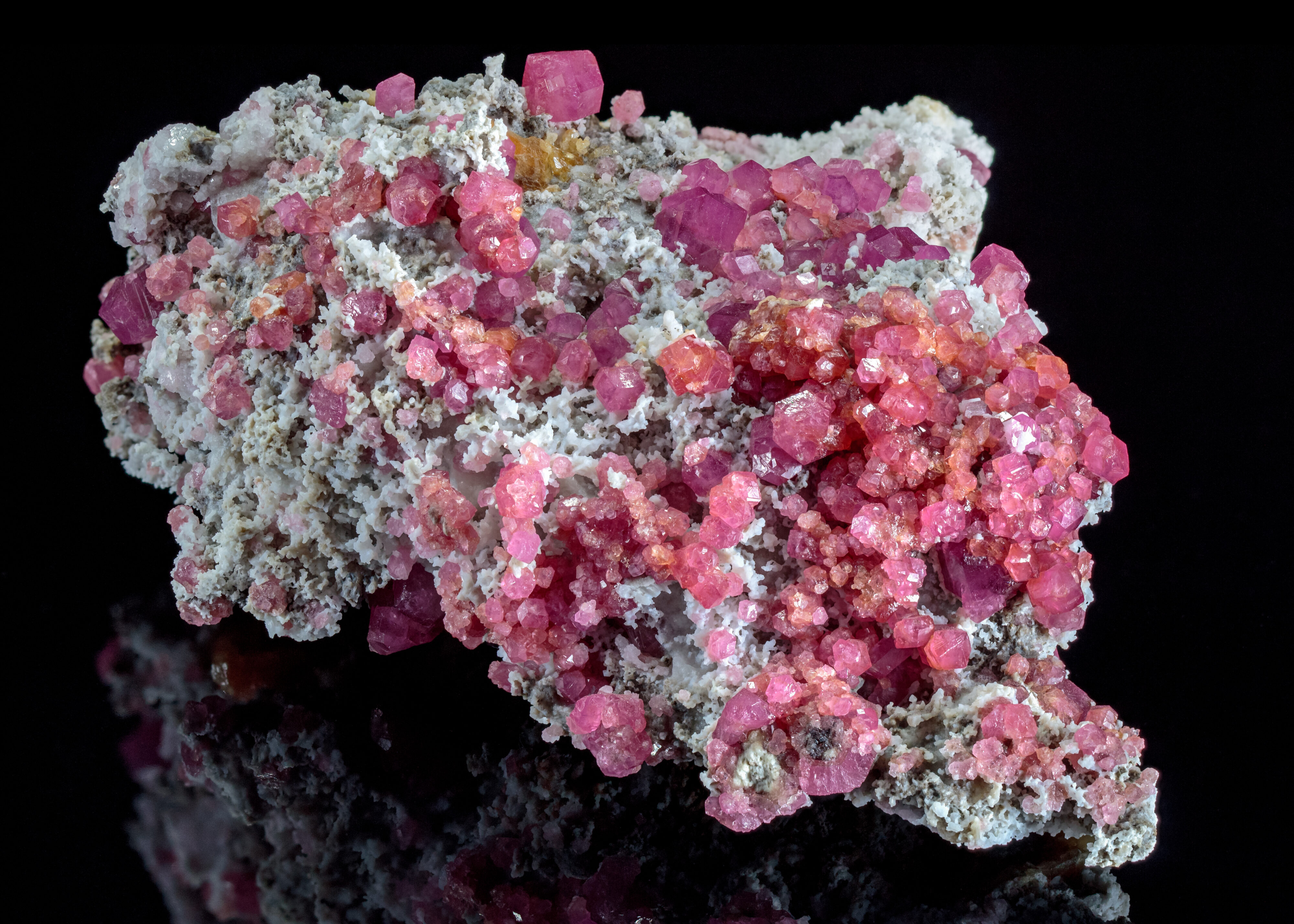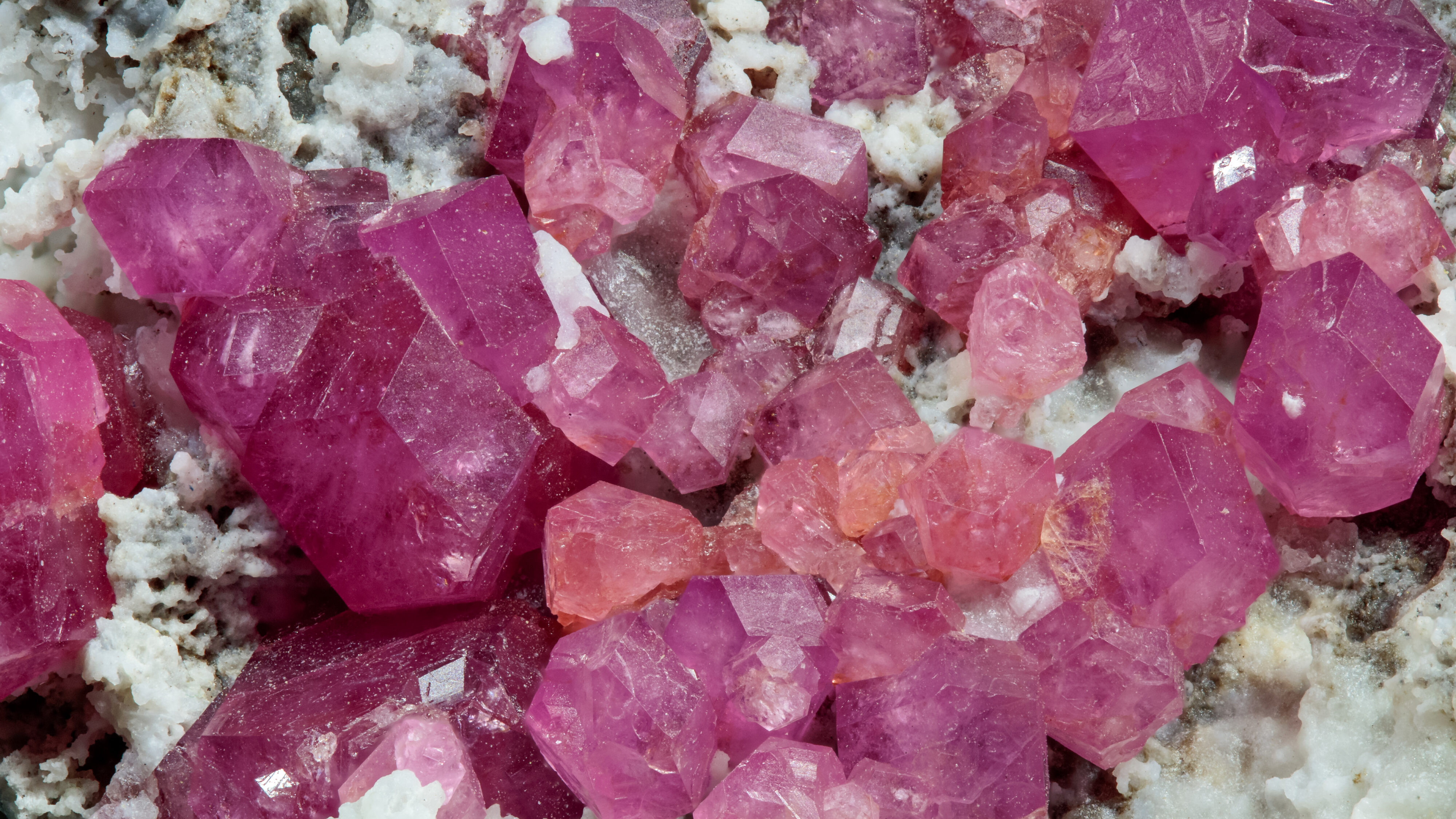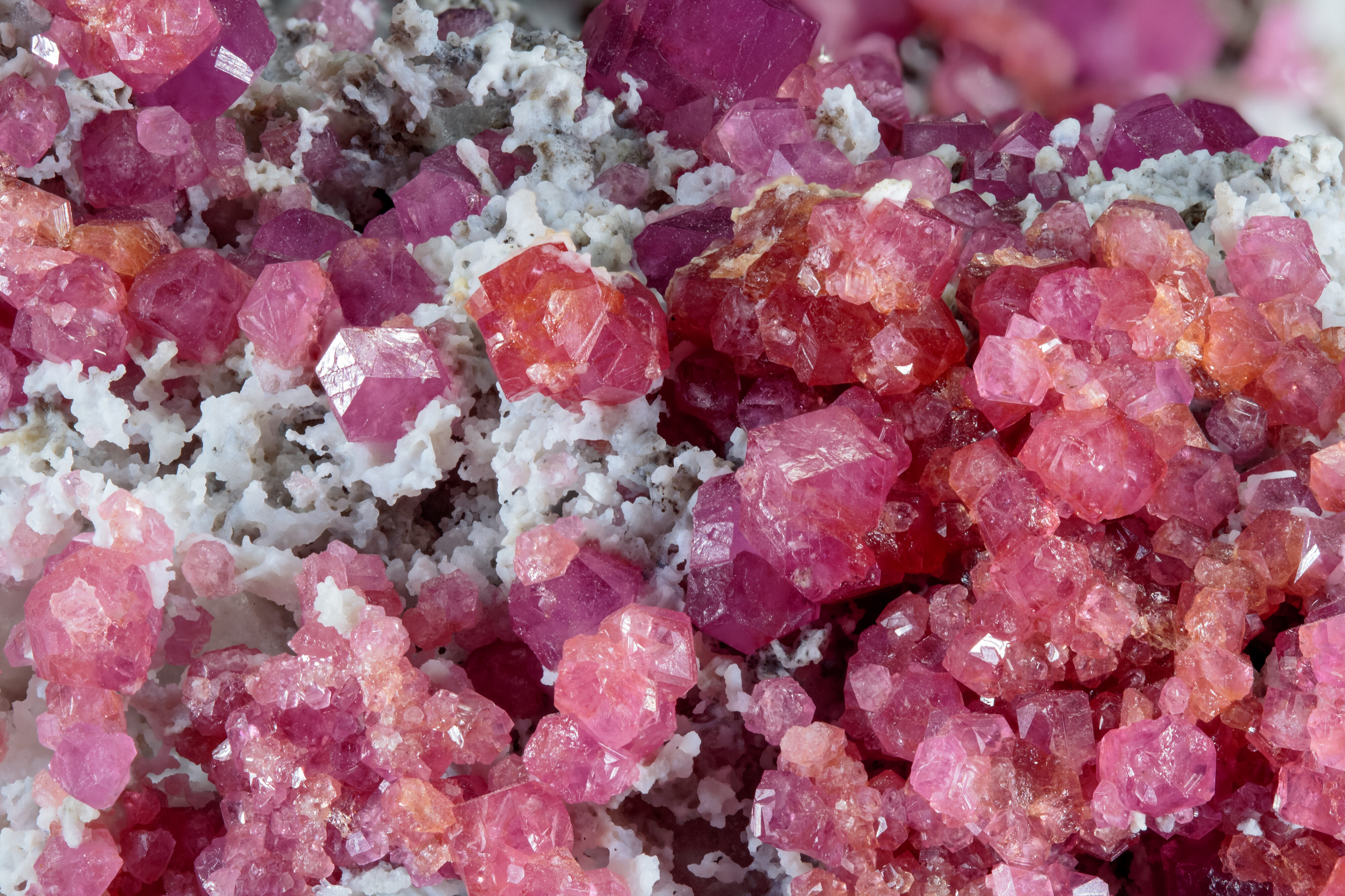 Pink grossular dodecahedrons and yellow non-fluorescent vesuvianite in a matrix of quartz and calcite, from the famous deposit in Sierra de Cruces. The garnets are dim fluorescent red in longwave and midwave, likely from Cr3+ impurities. Also included are macro closeups.