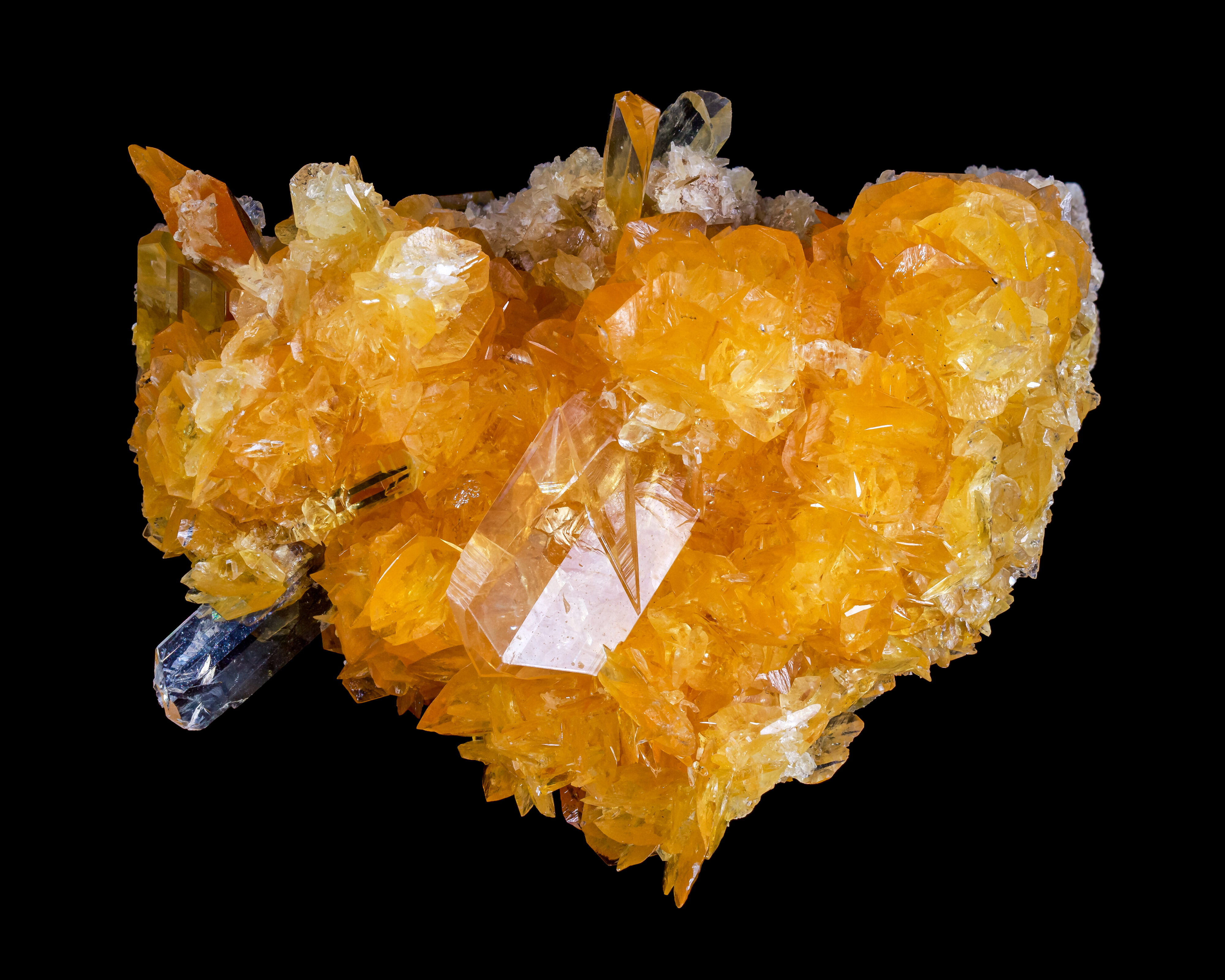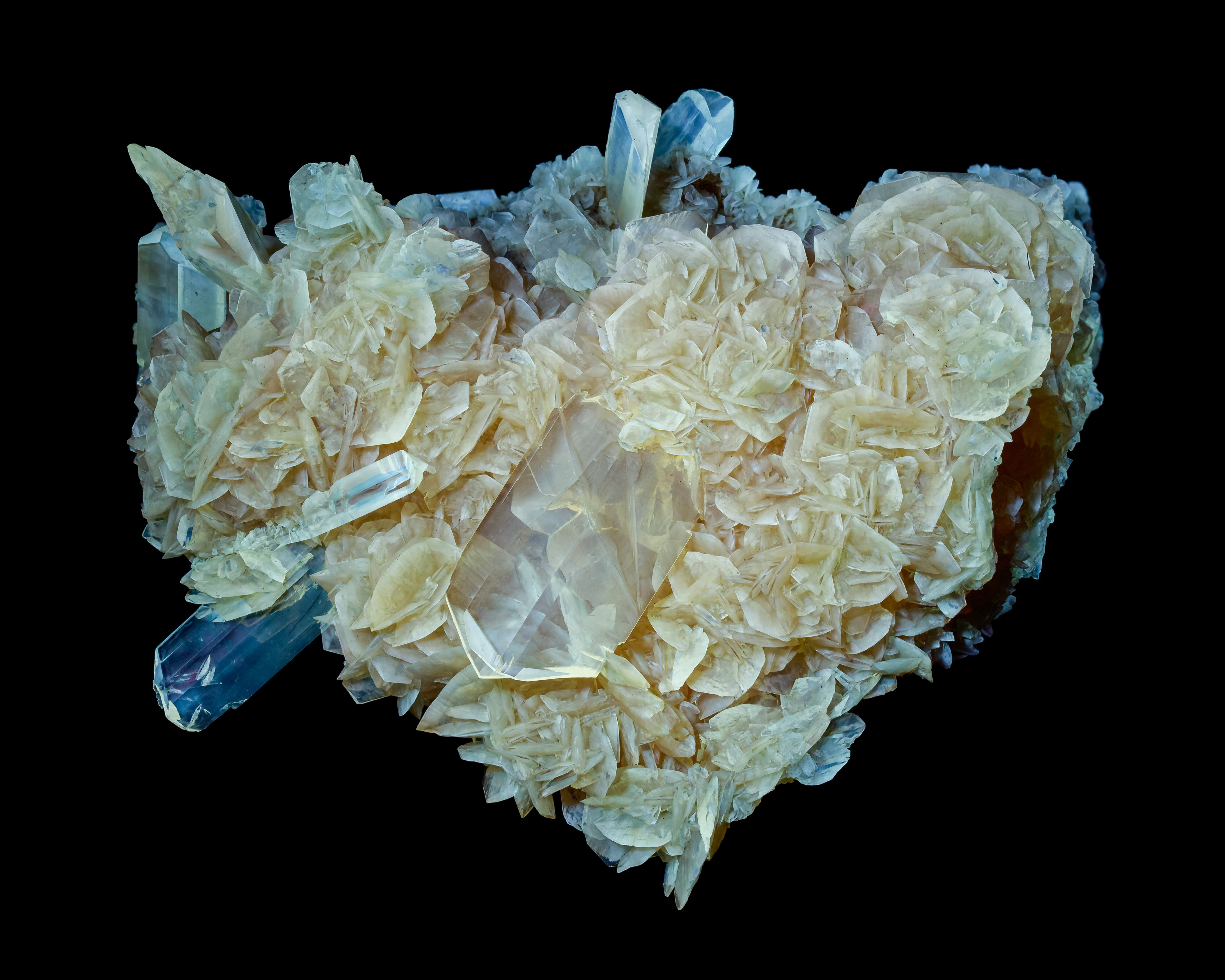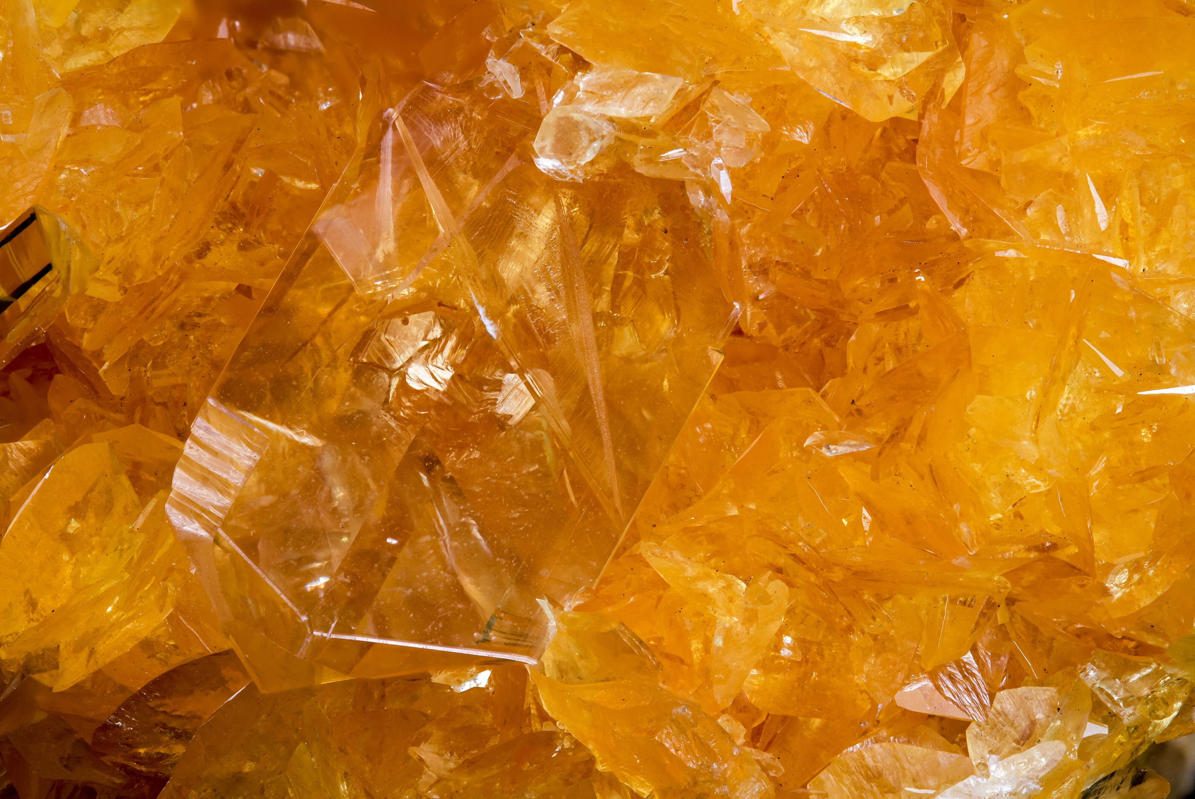 Rosettes and larger twinned crystals of translucent golden selenite, fluorescing pale yellow in LW. The crystals are also phosphorescent for several seconds in the same color (not pictured). A macro closeup is included with FOV 30mm.