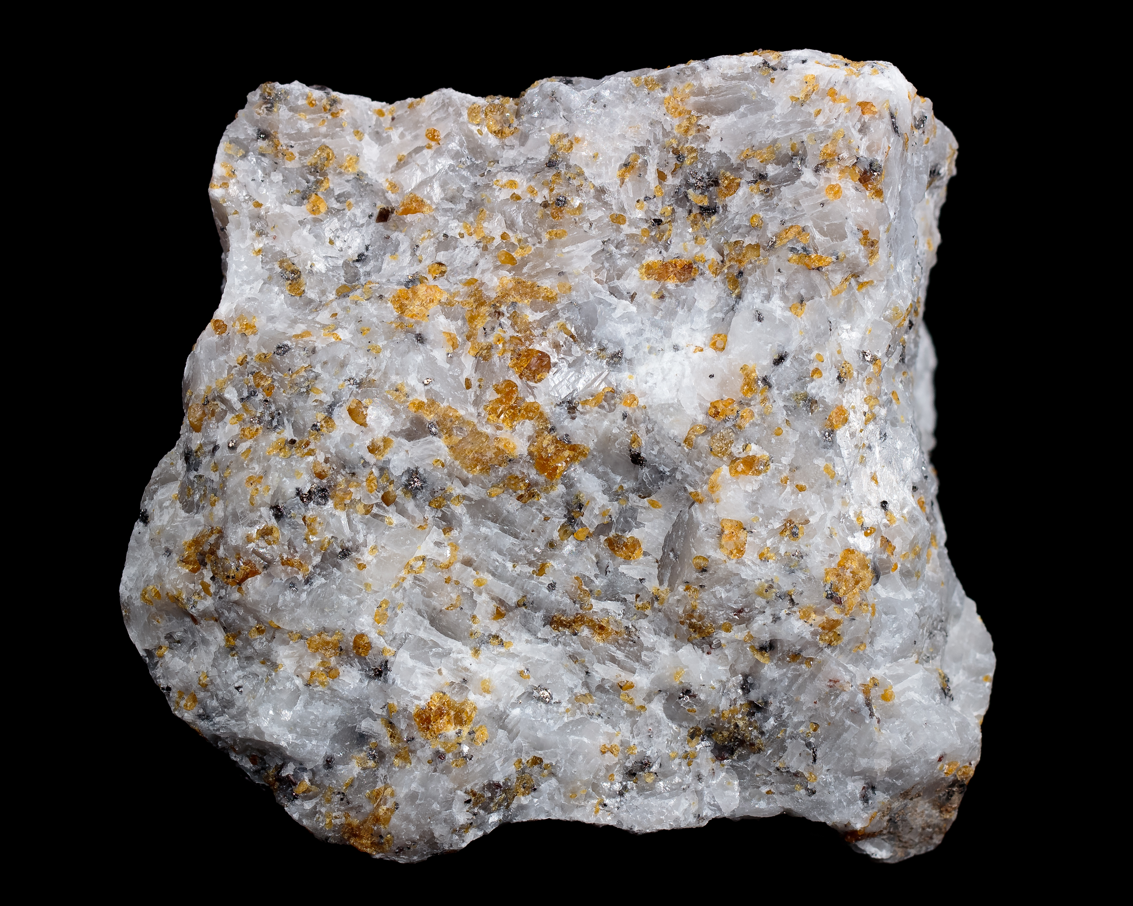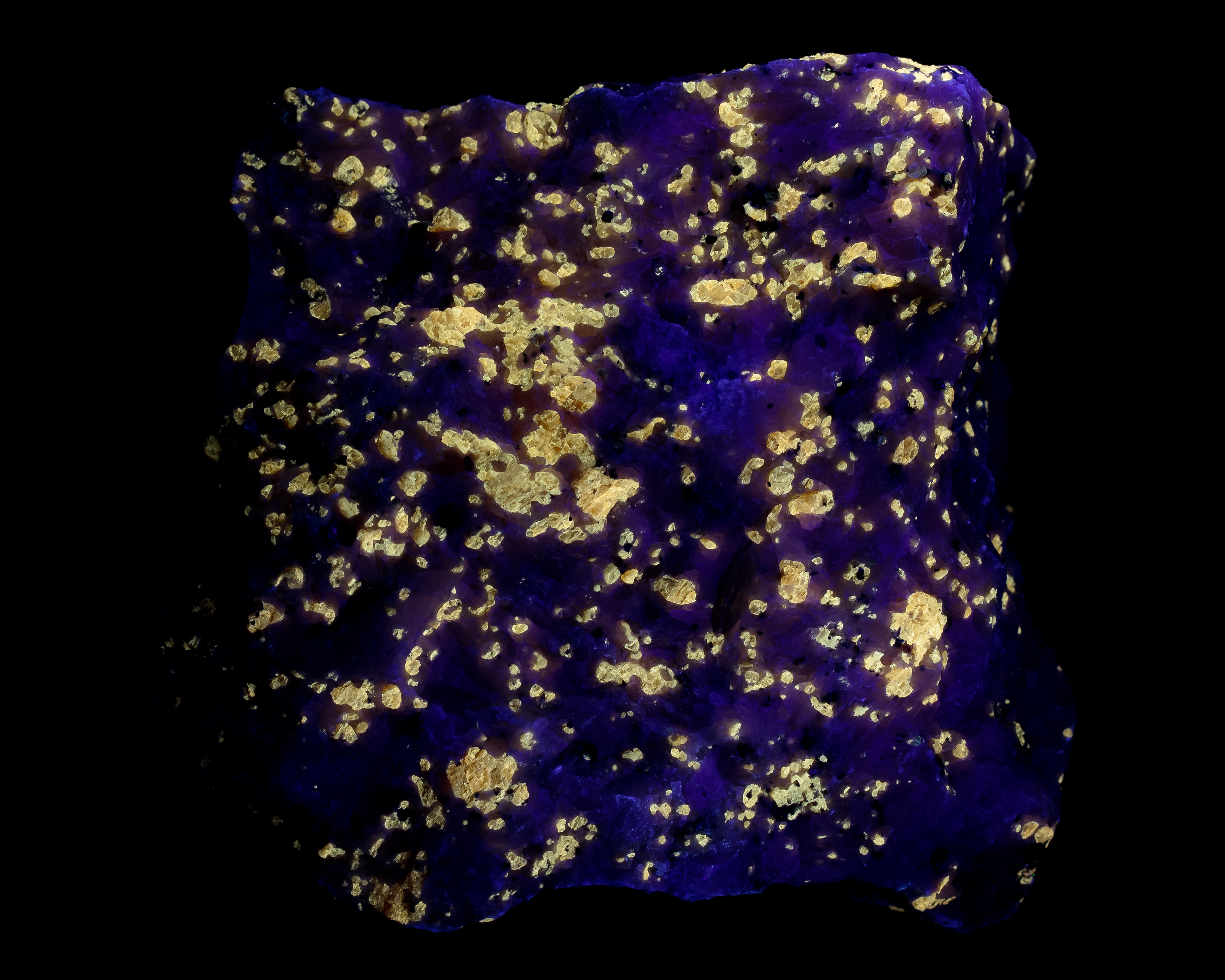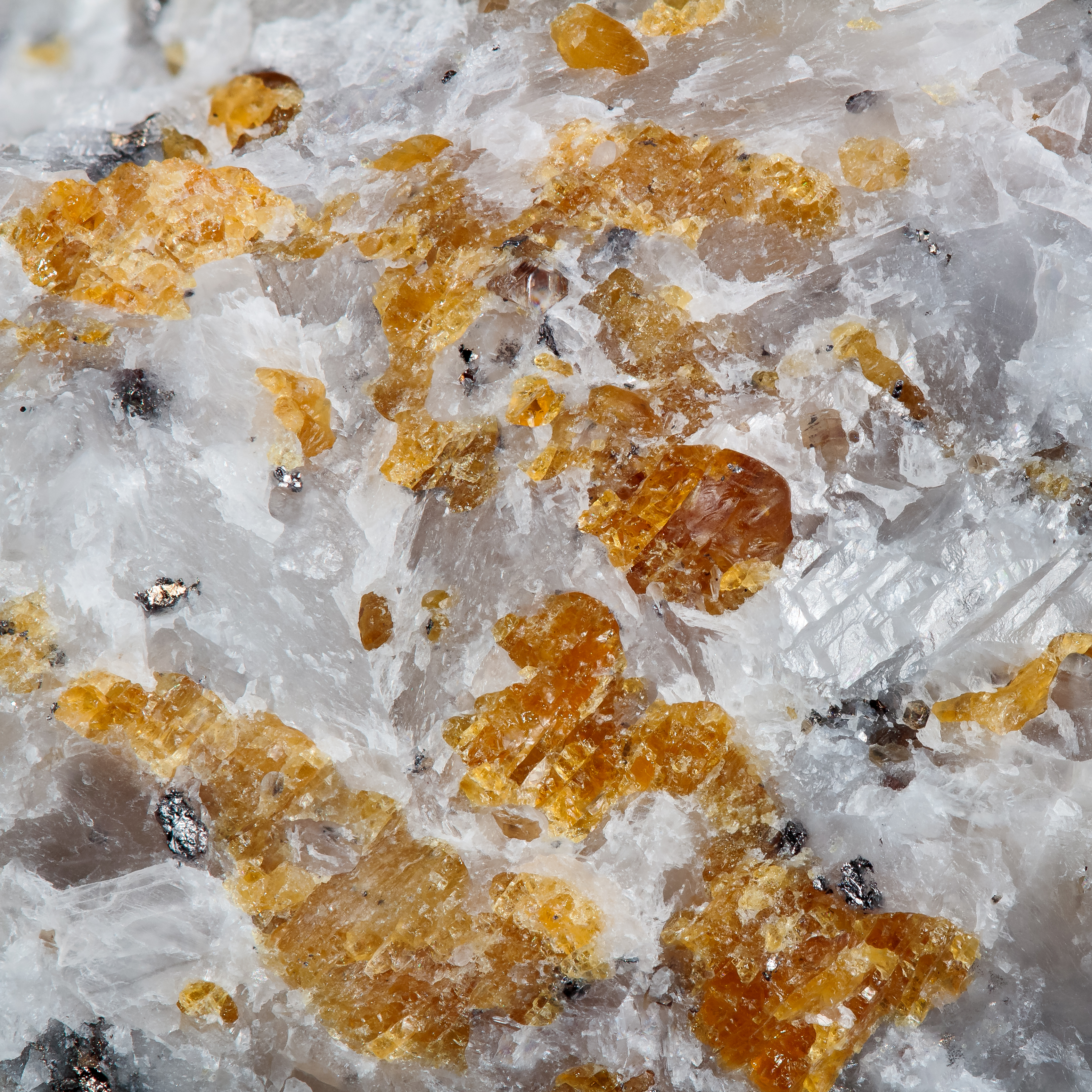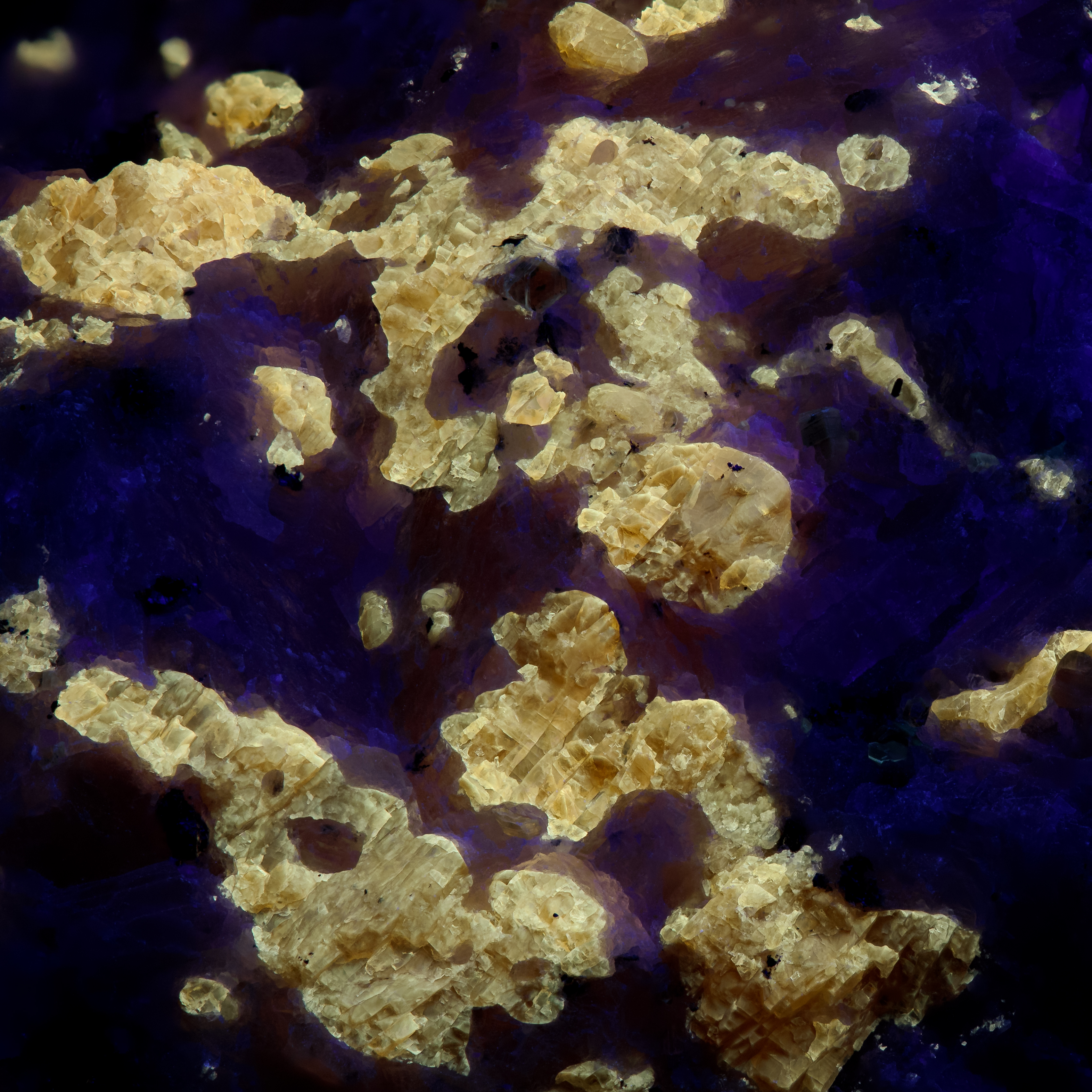 Orange grains of norbergite up to 4mm in marble, fluorescing pale yellow in SW. The marble fluoresces a faint blue. A macro closeup is also included with FOV 20mm.