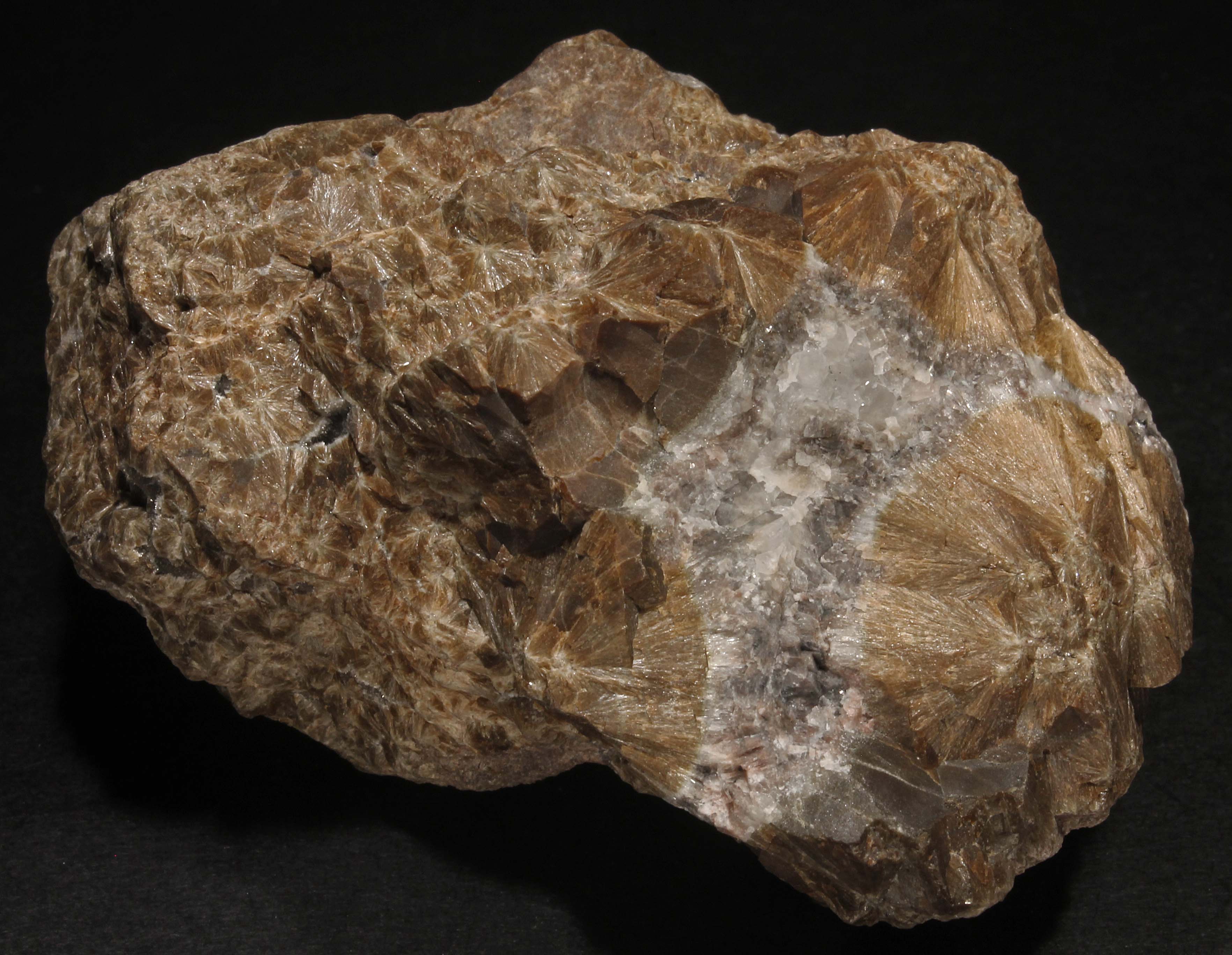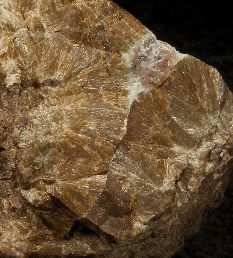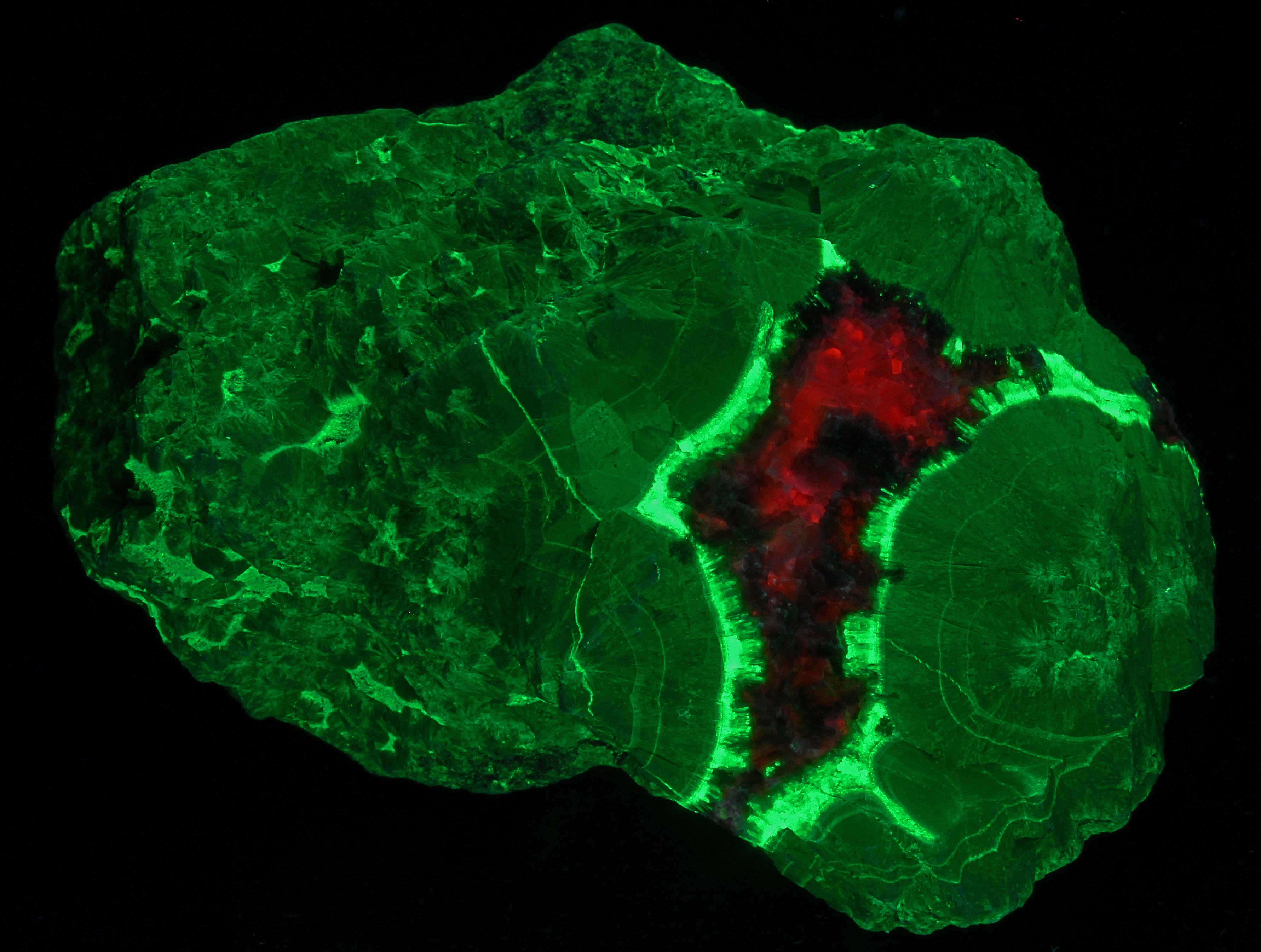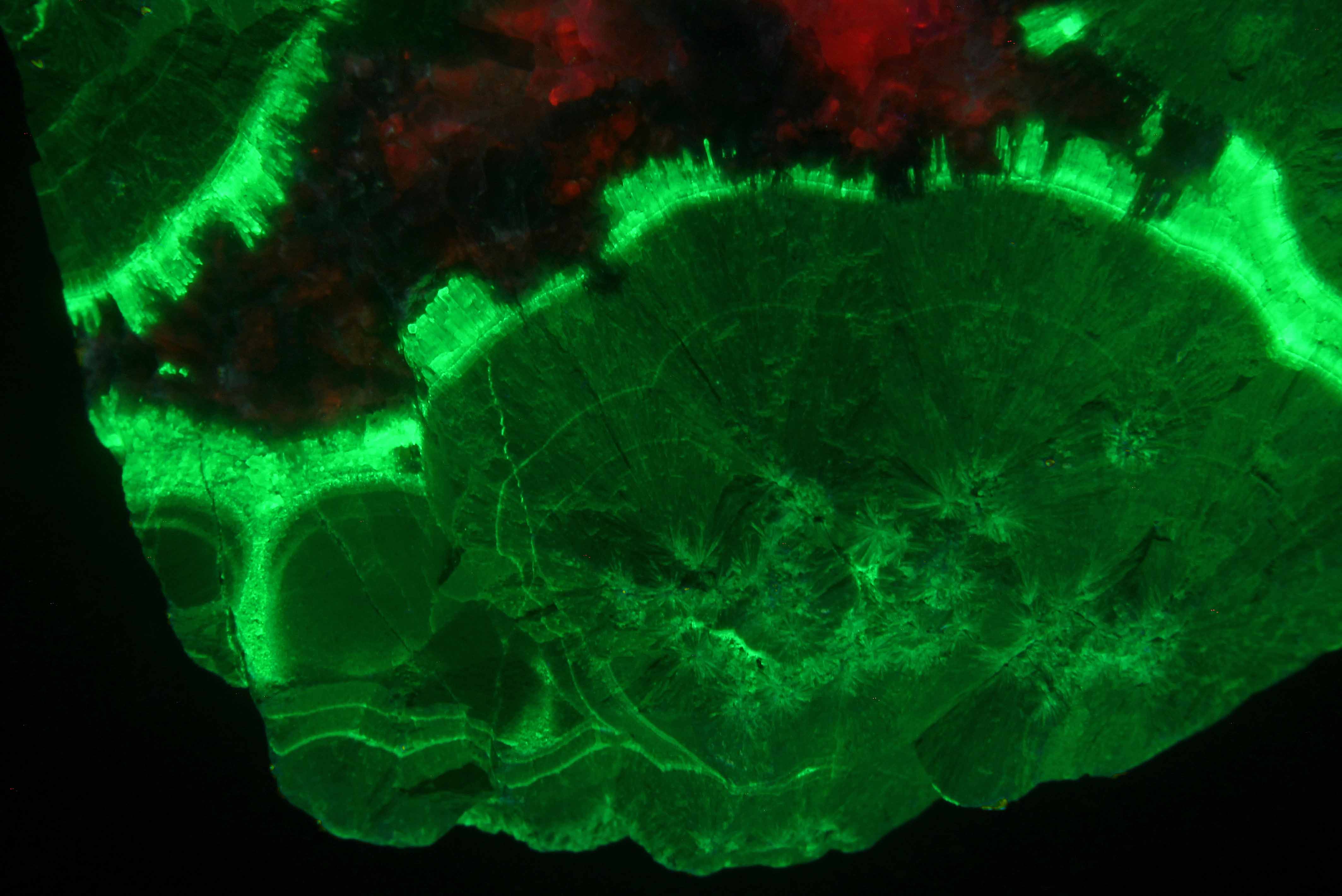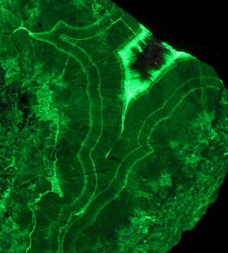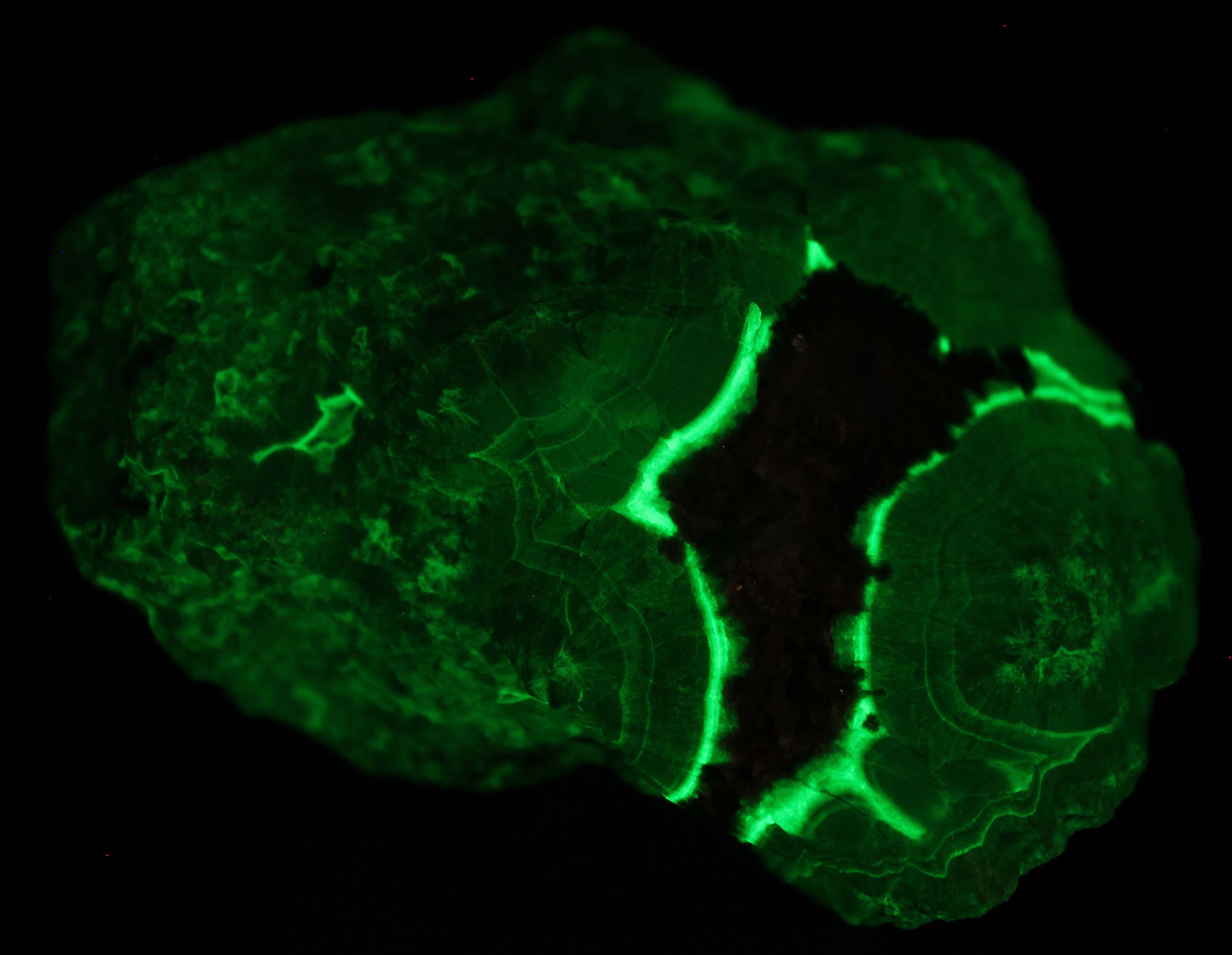 Radial brownish Willemite concretions with a 2nd generation growth of white crystals. These fluoresce very bright and willemite has intense and long-lasting green phosphorescence. This particular growth of willemite produces beautiful fluorescence with pretty geometries and contrasts of greens.