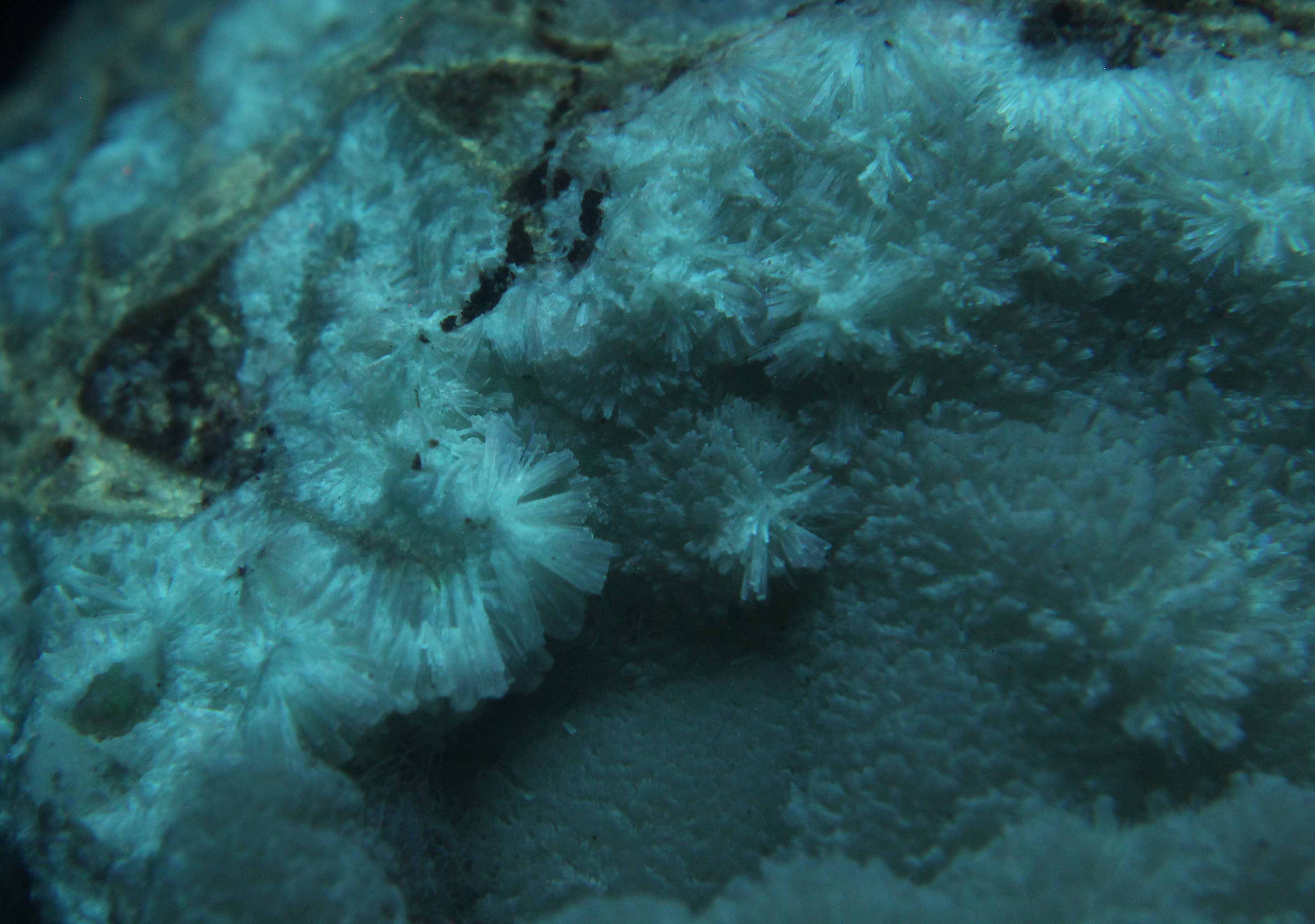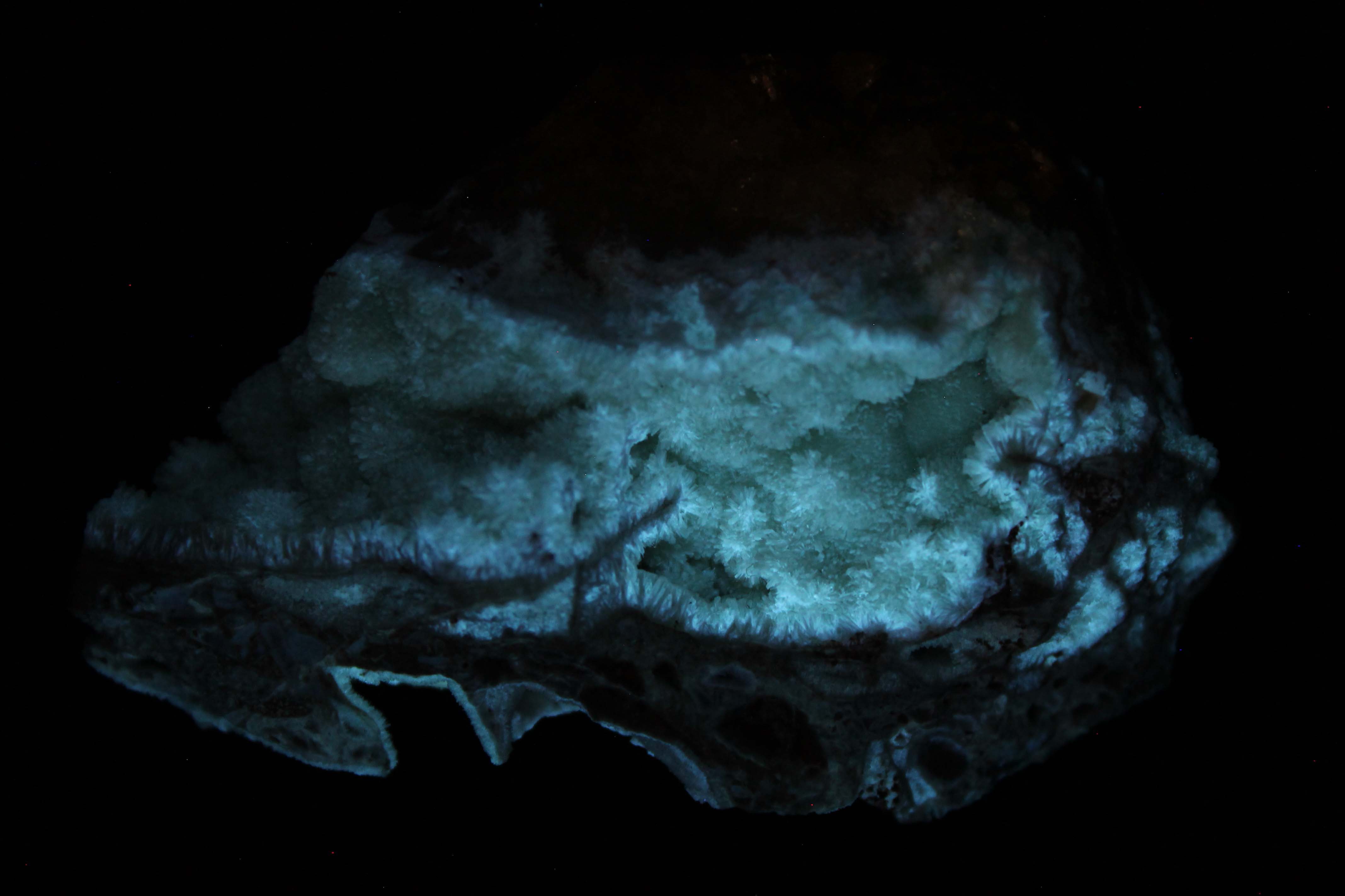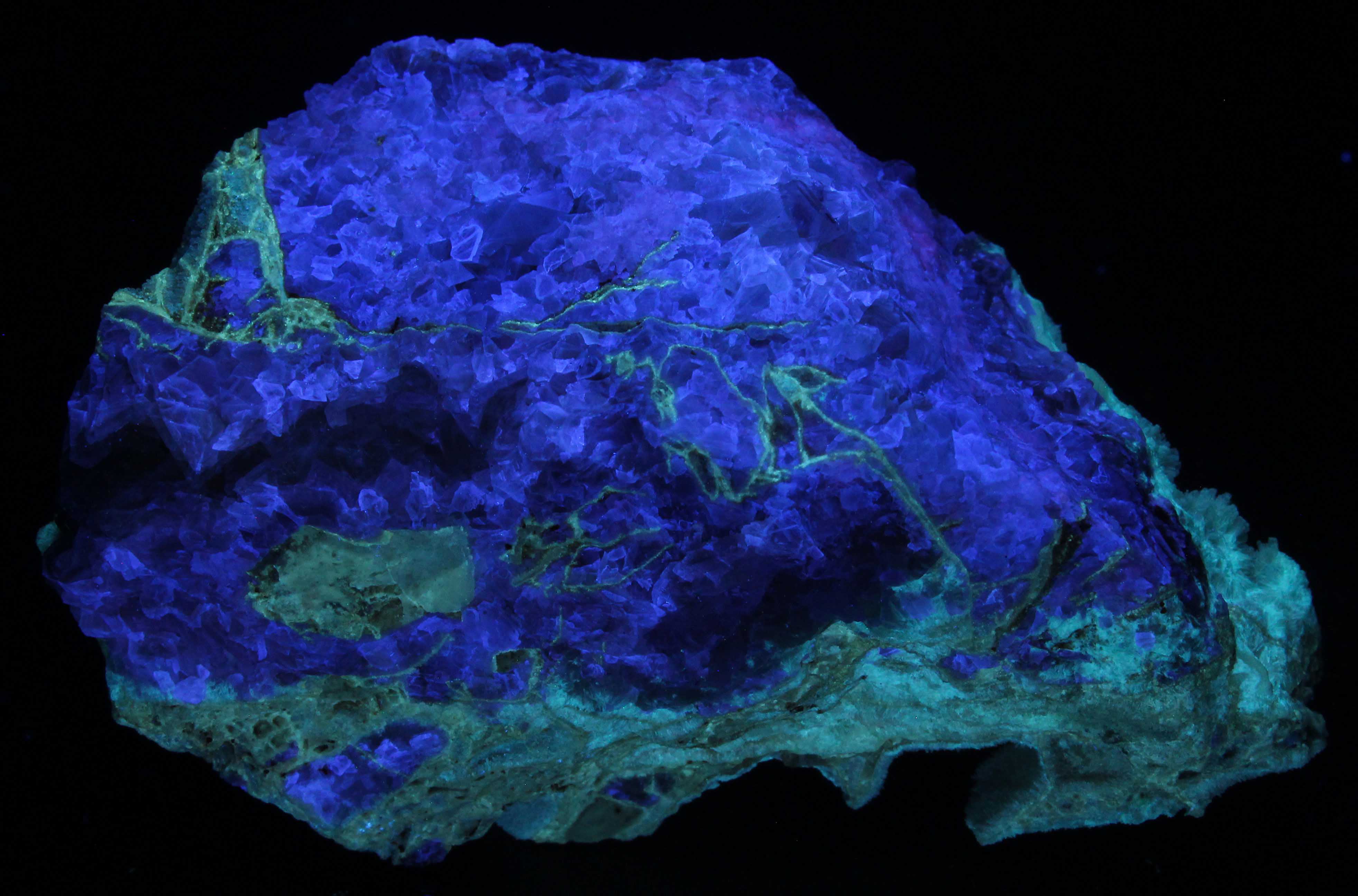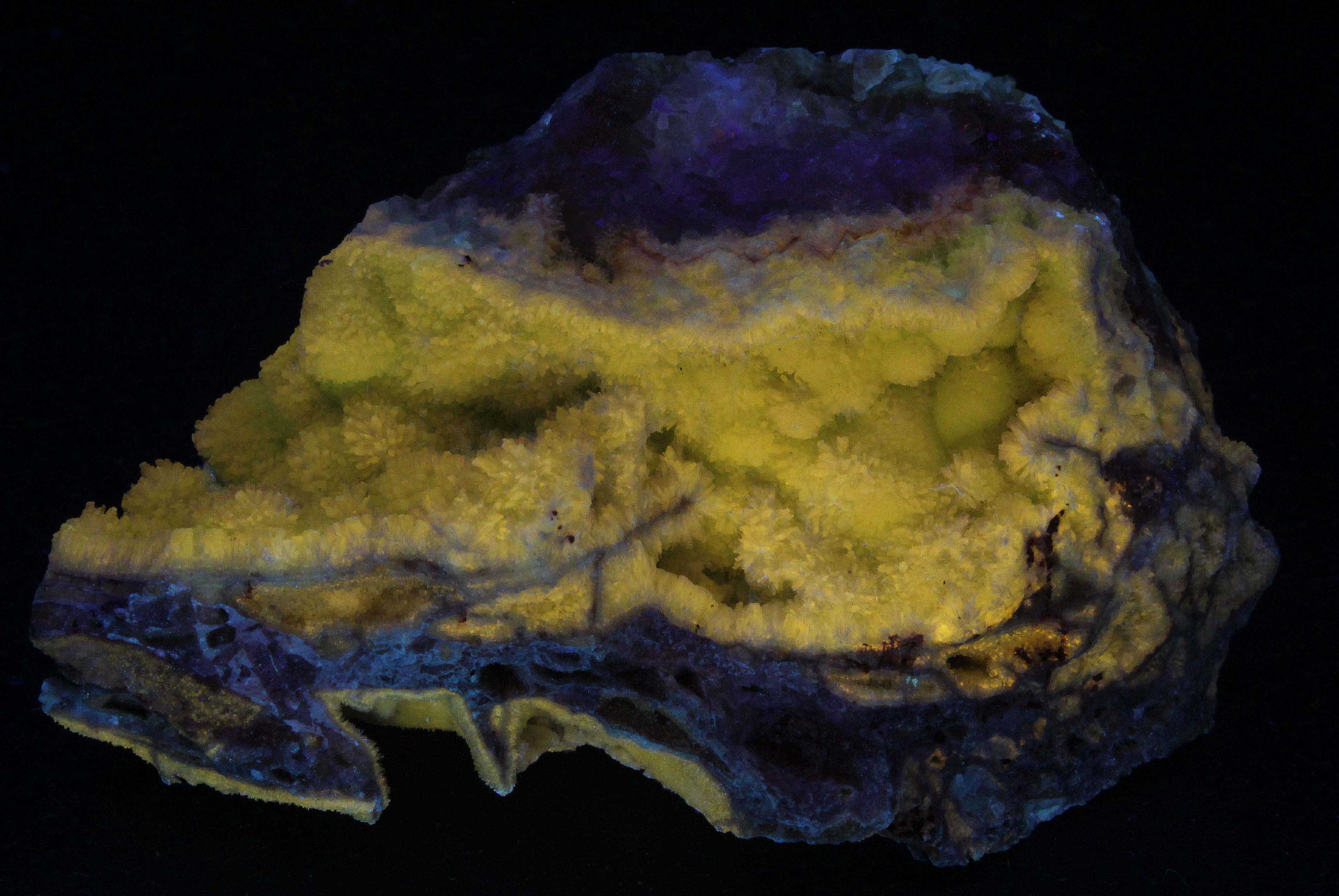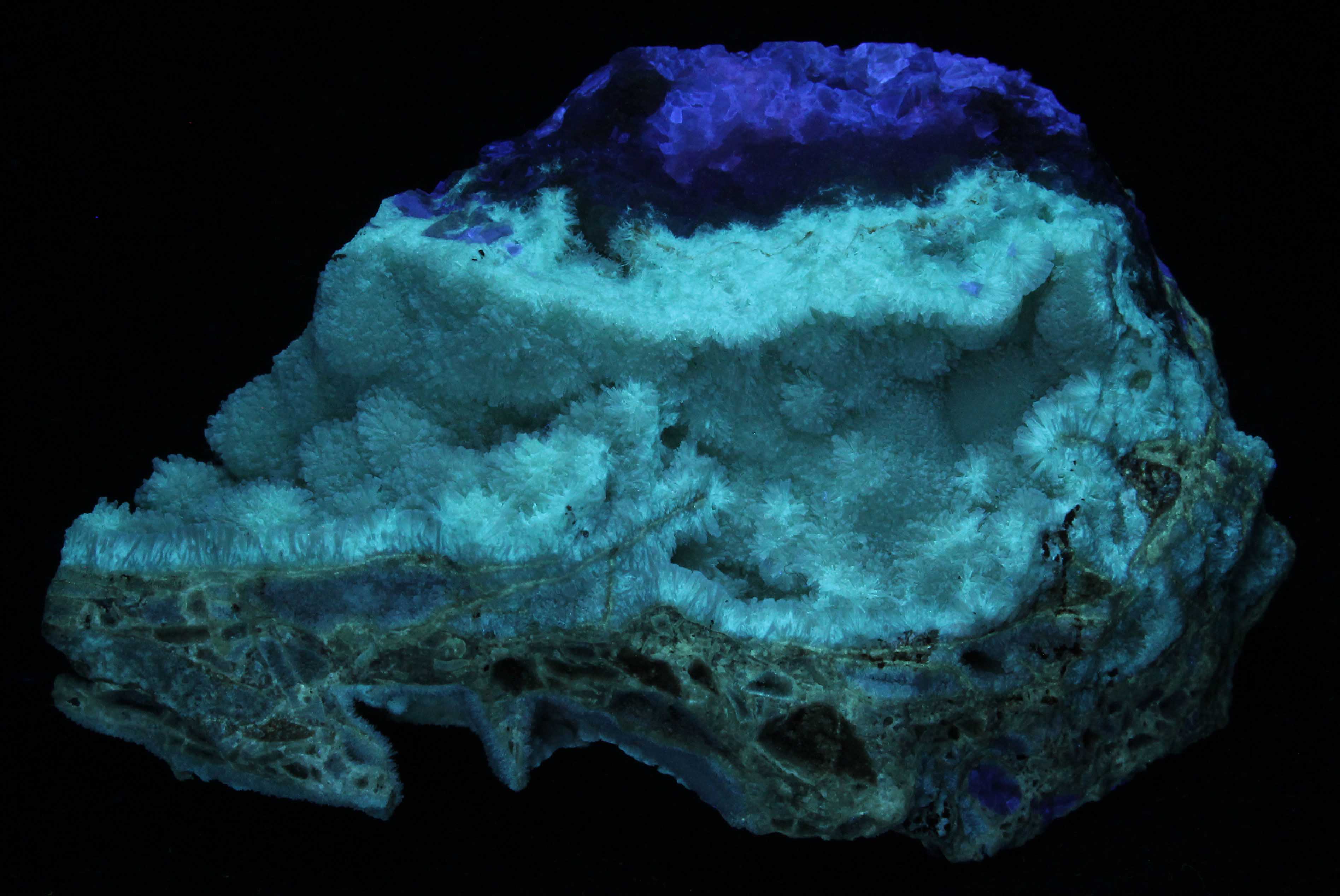 Smithsonite covers the other side. Hundreds of white and tan crystals of about 1mm fluoresce a vivid blue under SW. Purple hue is also evident. MW and LW are not significant. Strongly phosphorescent after SW. Purchased at the Vienna Mineral show for 20€. (
