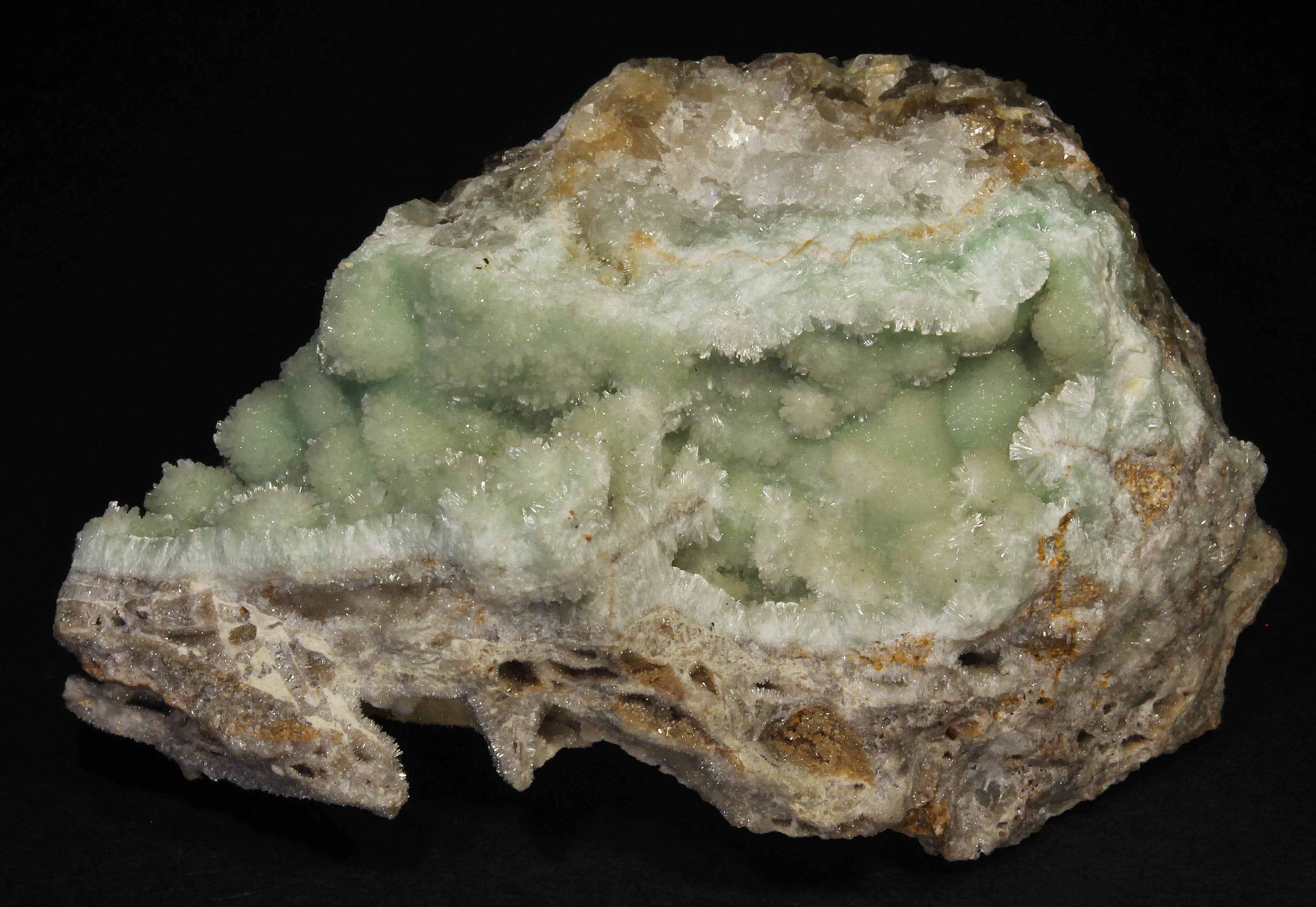 Green Willemite and white, tan Smithsonite as described in Robbins (1994). Willemite covers about half of the surface of the specimen and consists of several crystals (most of them sub-millimeter). There are several cavities/vugs.