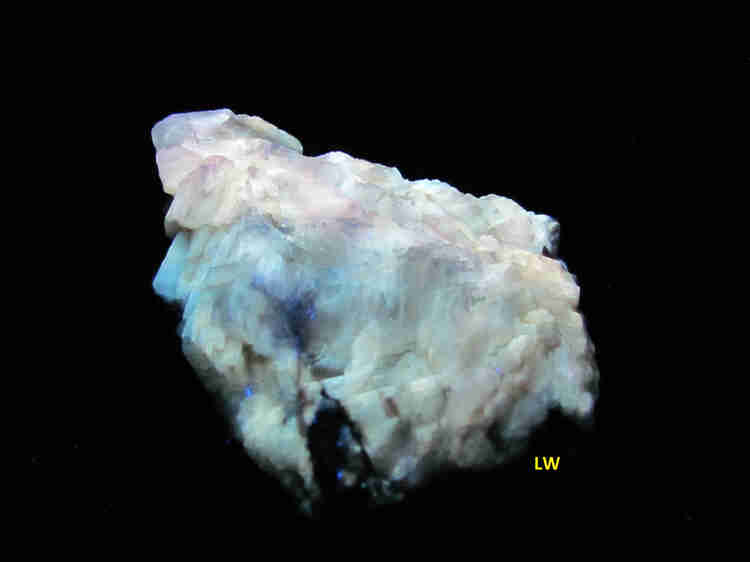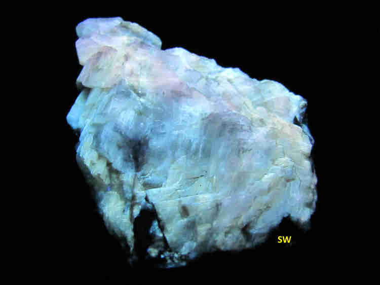 This fine example of fluorescent Alabama calcite was found in limestone riprap in the City of Birmingham and was likely quarried somewhere nearby, as there are many limestone quarries in the area. It illustrates the rich and subtle mix of pastel colors that one typically sees in so many of Alabama\'s fluorescent calcites, and it is exceptionally bright. Shown here are the LW and SW UV fluorescences and the view under room light.