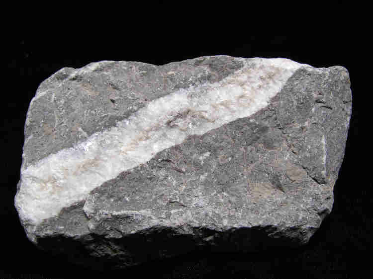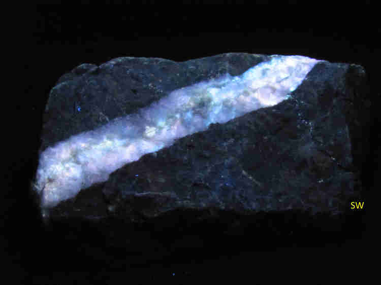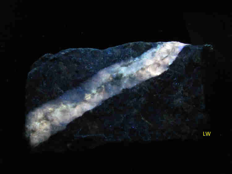 This is a roughly rectangular block of limestone with a calcite vein running diagonally through it, a pattern that I find especially appealing. The colors and color variations are typical of specimens from widely distributed locations around the state. Both LW and SW UV fluorescences are shown, along with a room-light photo.