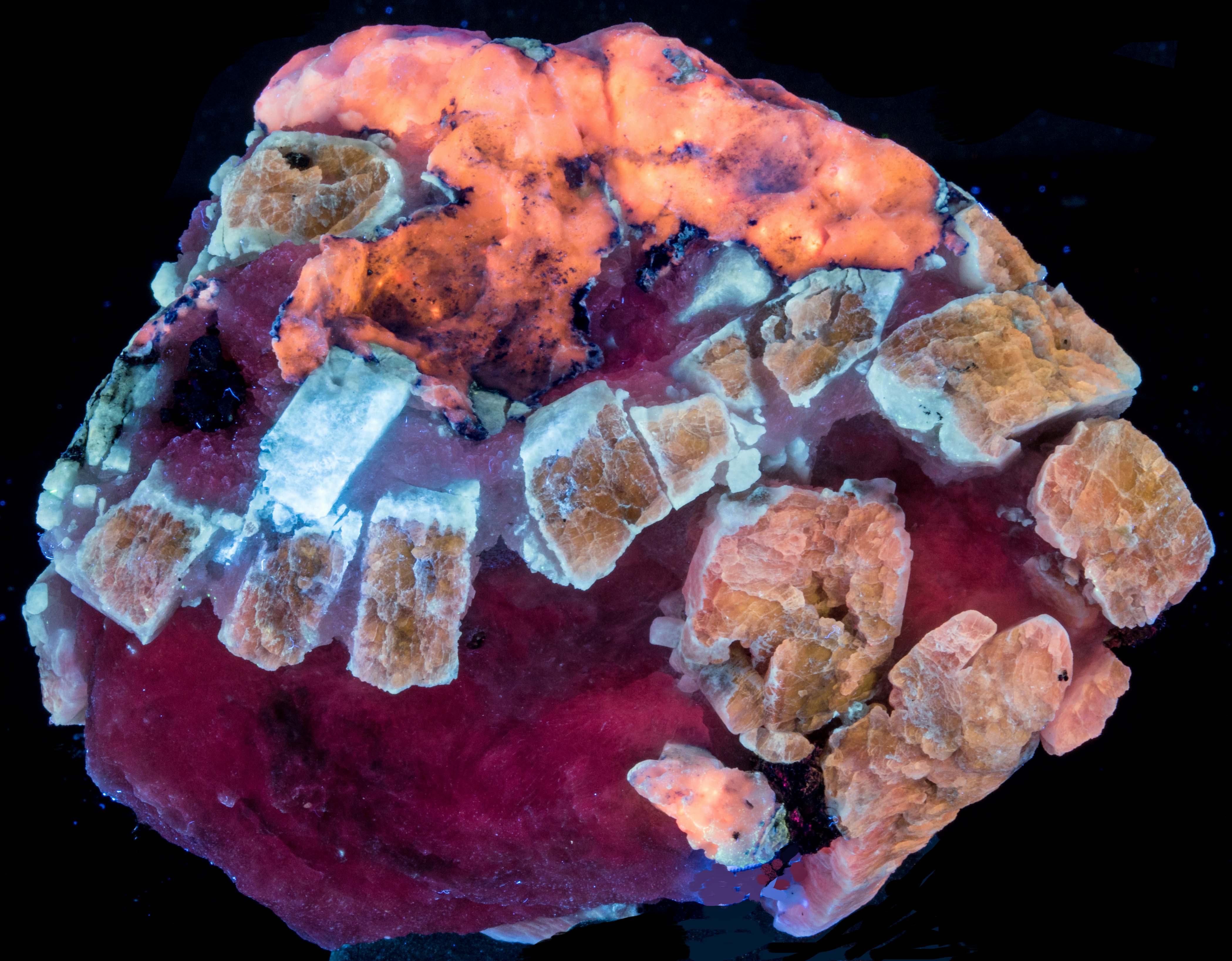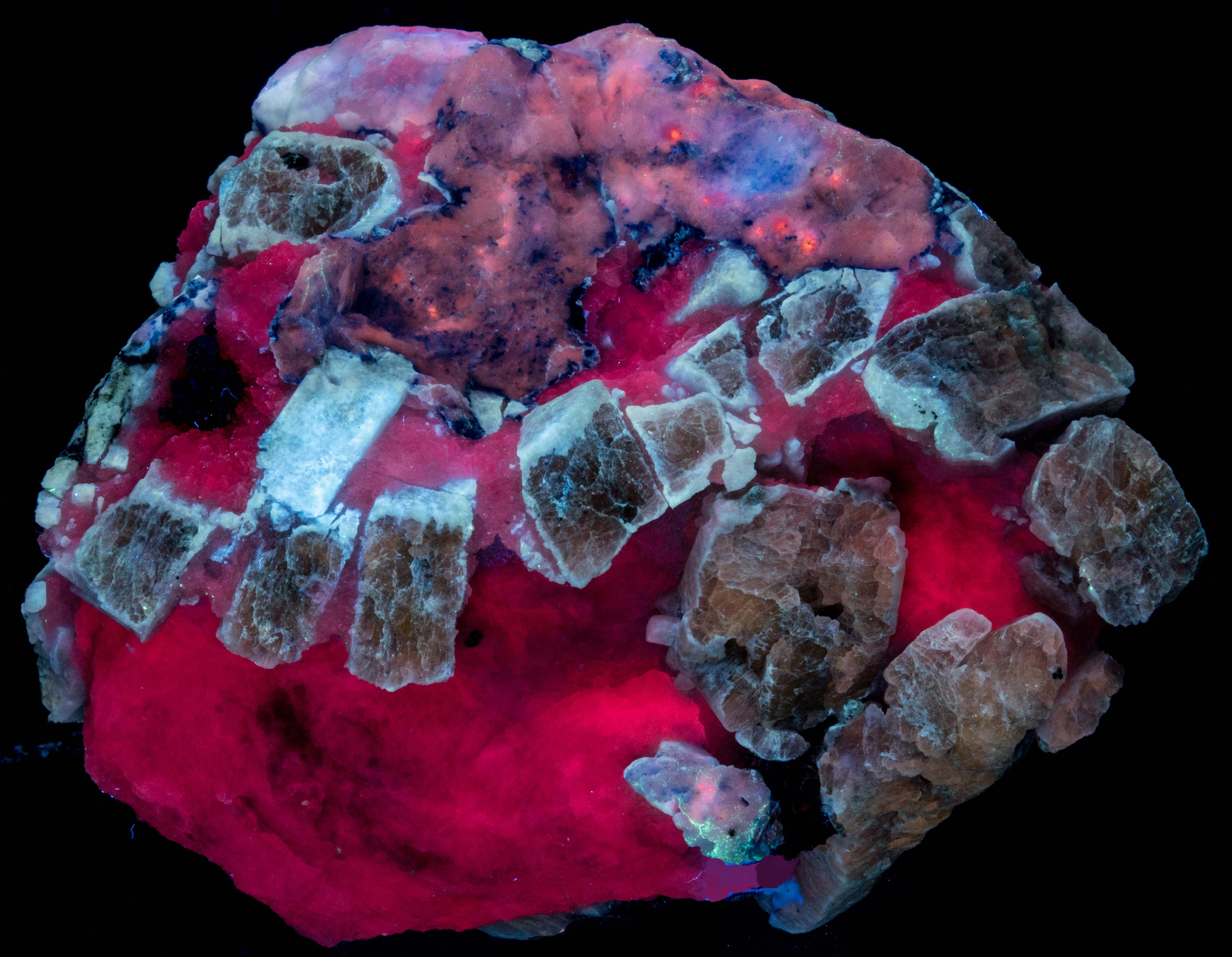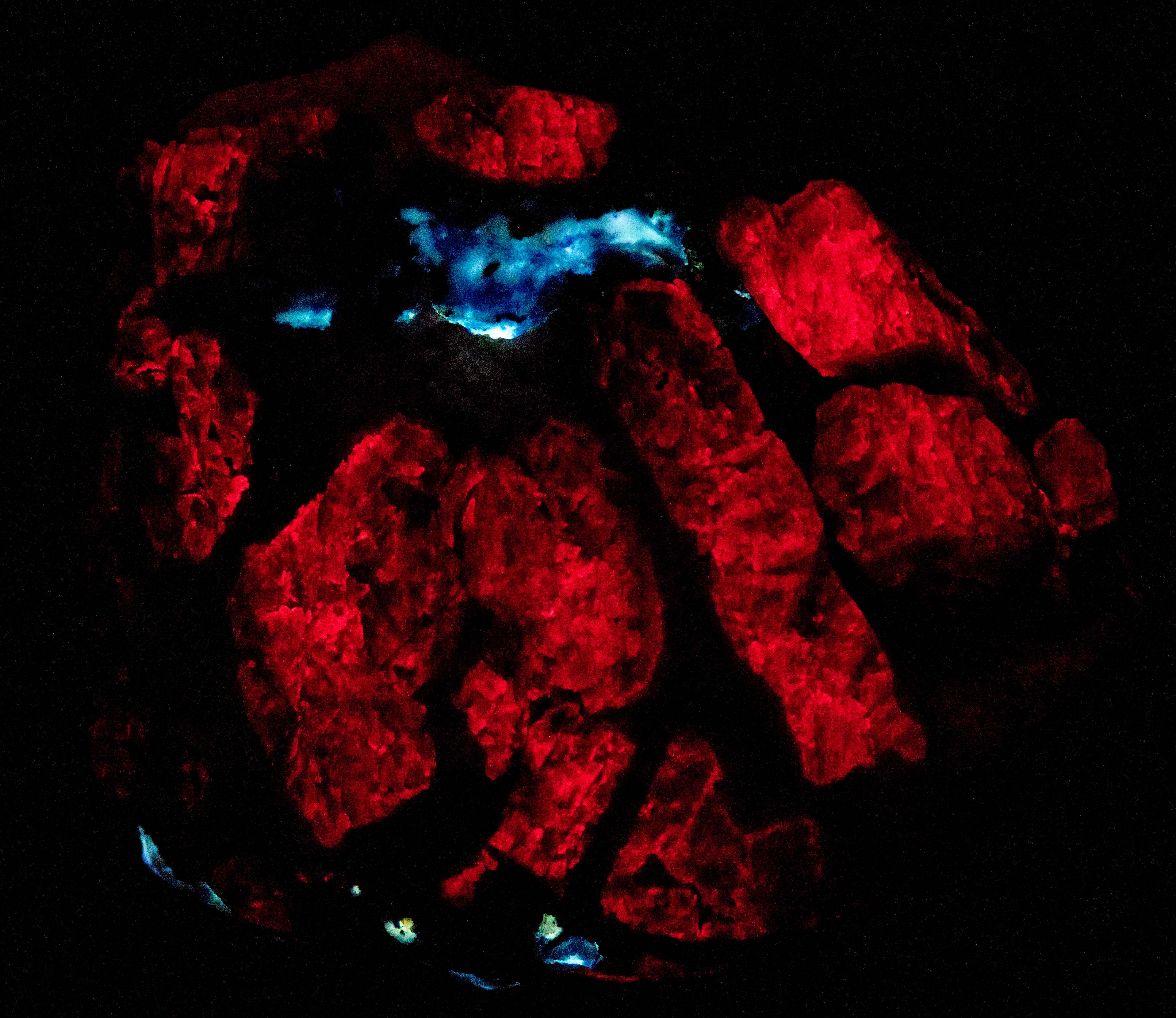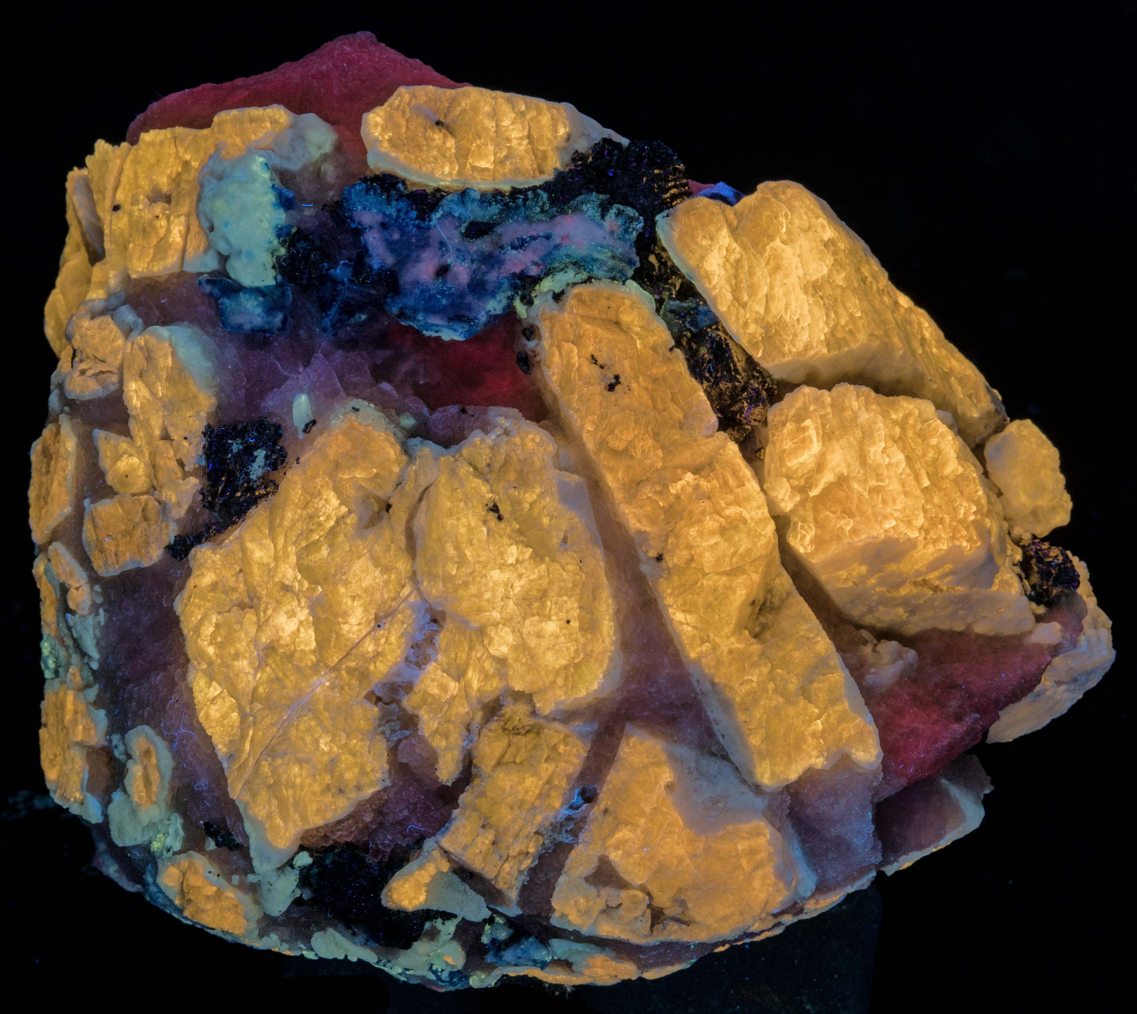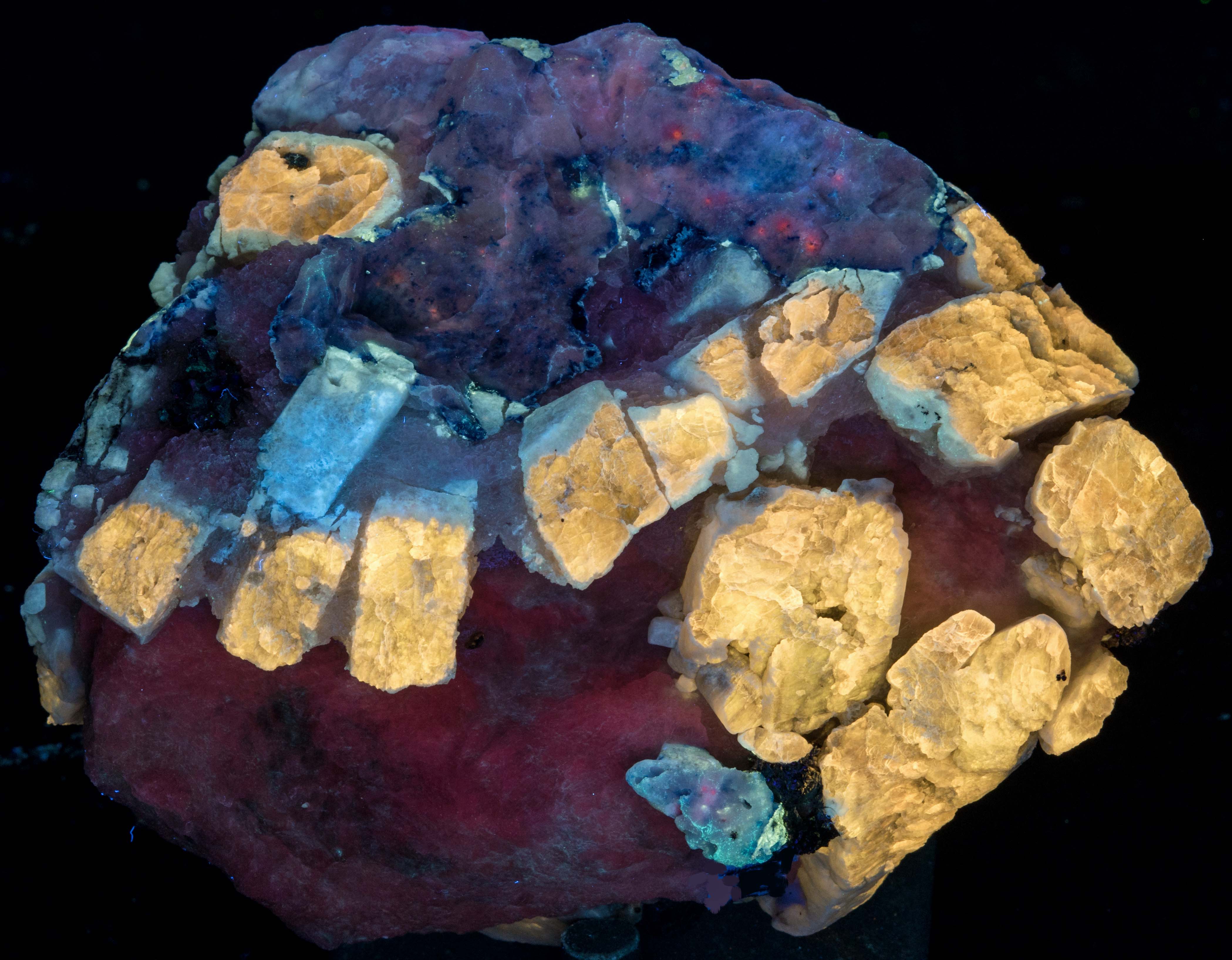 The first image demonstrates fluorescence under "Fullwave" UV illumination, which comprises longwave (LW), midwave (MW), and shortwave (SW) UV lights. Sodalite appears yellow orange in this context, with notable variation in its mass—some portions display afterglow while others do not. Trace titanium substituting for aluminum is responsible for activating the afterglow in sodalite. Certain areas have undergone alteration due to radiation from embedded uraninite grains, resulting in brighter yellow fluorescence under LW and a redder hue under SW light. These spots are tenebrescent and lack afterglow. Additional fluorescent minerals include calcite (red), forsterite (yellow brown), and diopside (bluish white).