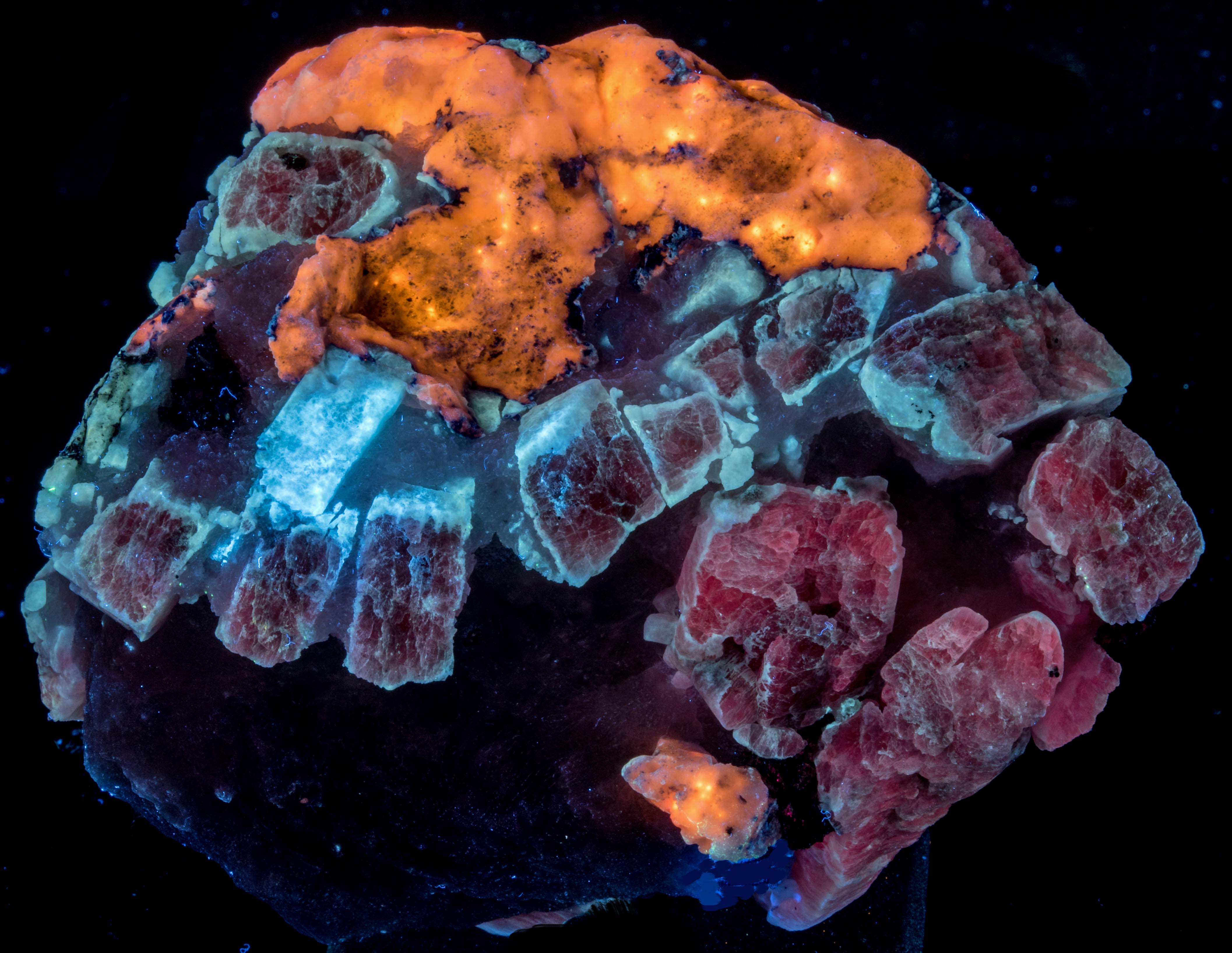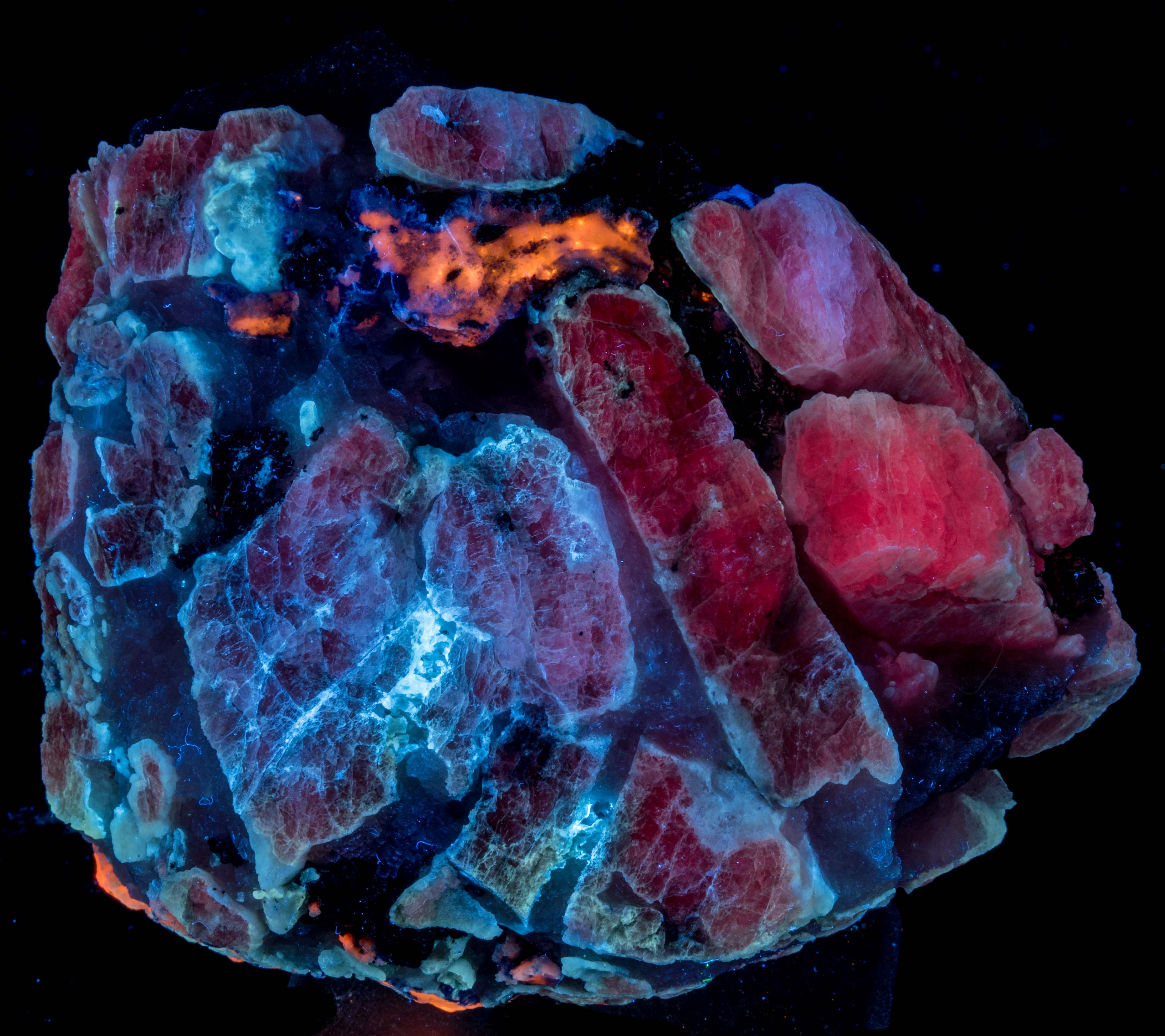 The second image highlights the specimen’s response to longwave UV light: sodalite emits a yellow-orange glow, attributed to disulfide ions. Diopside fluoresces blue, white, likely activated by titanium, while forsterite produces an unusual red fluorescence under LW light, presumably due to manganese. Forsterite also exhibits Brief Intense Phosphorescence (BIP) when exposed to a longwave light swept across the specimen, further suggesting manganese activation. Ordinarily, Afghan forsterite displays weak to moderate white to pinkish fluorescence under LW illumination. A common feature at Sar-e-Sang includes crystals with diopside coatings and forsterite cores.