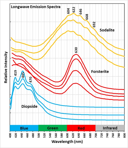 The third image presents longwave emission spectra measured on sodalite, forsterite, and diopside using 365 nm filtered LED flashlights for LW excitation. Sodalite shows a broad peak from 500 nm to 750 nm, with vibronic peaks at 604, 622, 646, 668, and 692 nm, characteristic of disulfide activation. Forsterite\'s spectrum features a broad peak centered at 630 nm, indicating manganese activation. Diopside displays peaks at 419, 445, and 470 nm, consistent with titanium as an activator, though other activators may be involved.