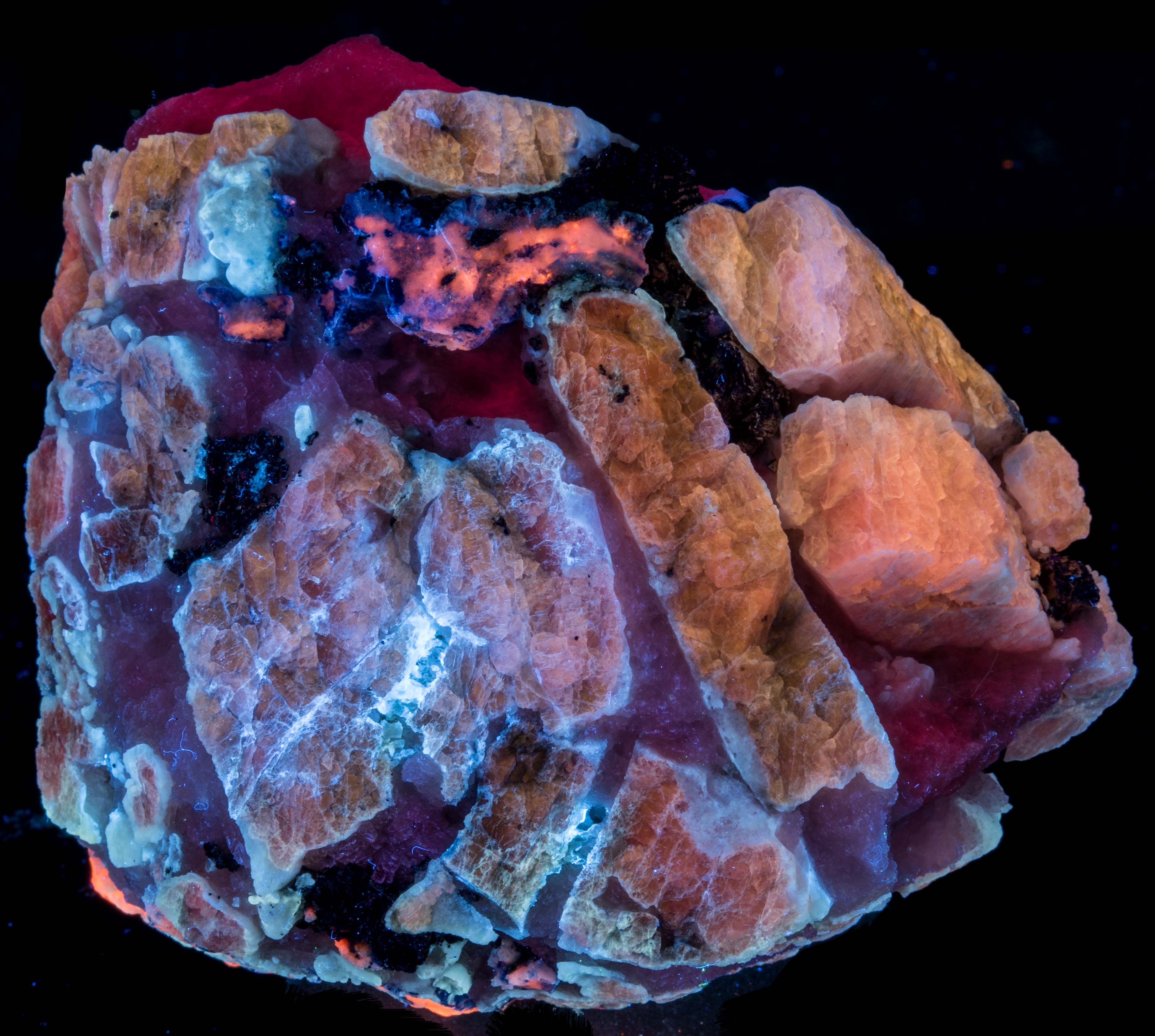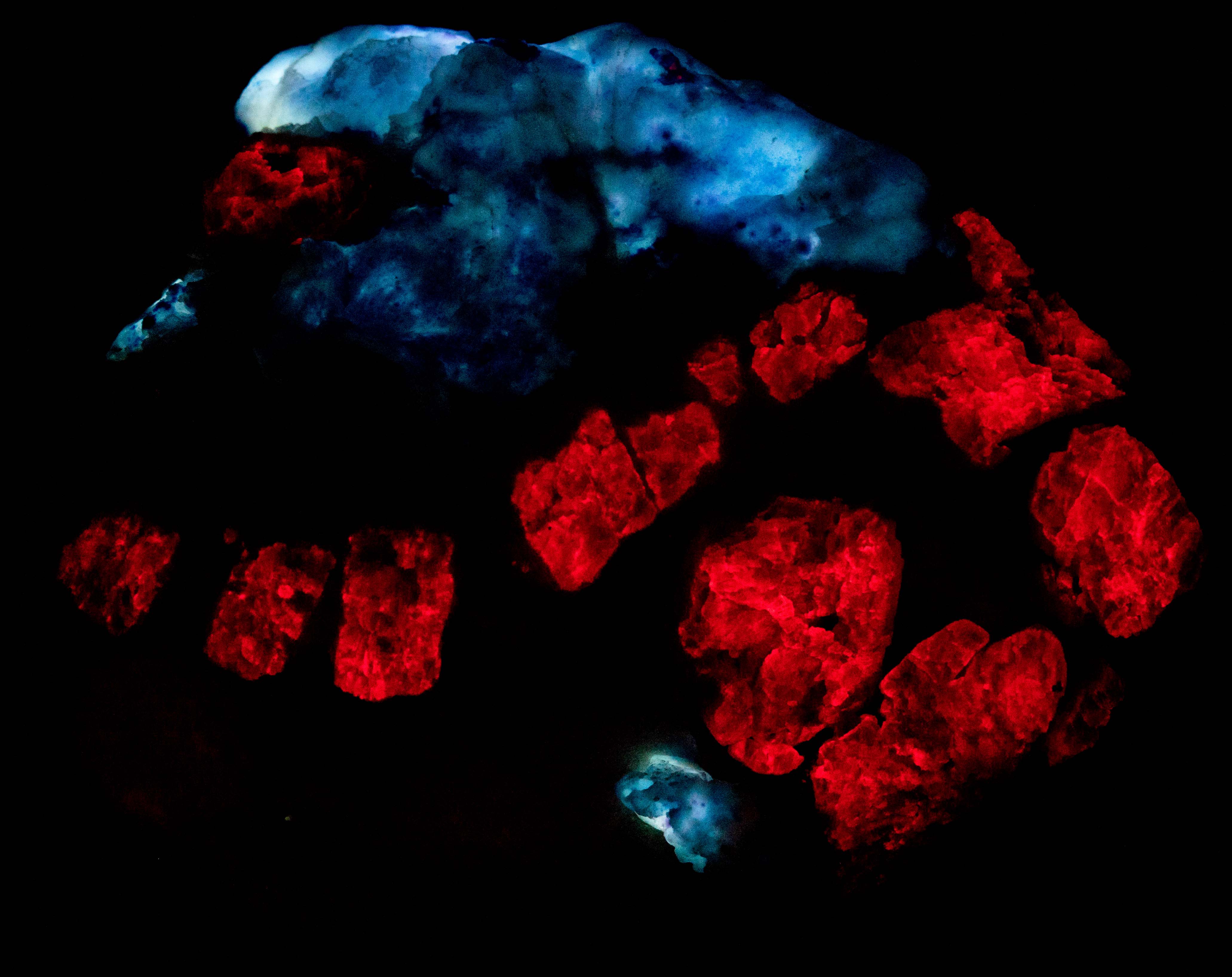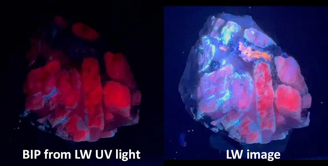 The seventh image shows afterglow following SW UV exposure. Sodalite’s afterglow is notably bright and long-lasting, occurring after brief SW UV exposure. Forsterite’s red afterglow is less intense but is also long-lasting. The forsterite afterglow requires 30–60 seconds of intense SW exposure; activation often involves a 35W or greater UV light source held close to the specimen.