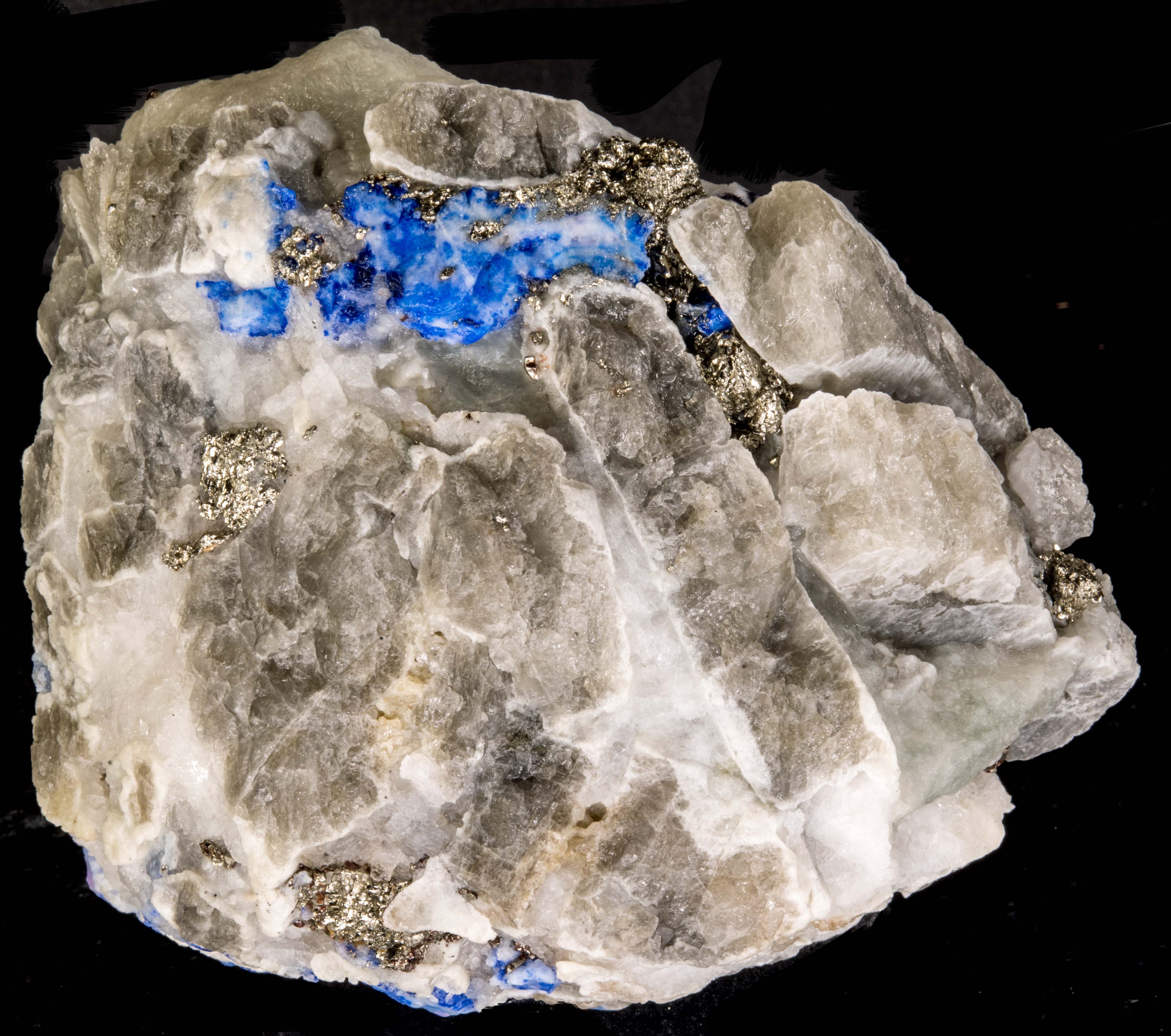 This specimen originates from Sar-e-Sang, Badakhshan Province, Afghanistan and contains forsterite (Mg2(SiO4)) exhibiting an atypical red afterglow, confirmed by XRD analysis.