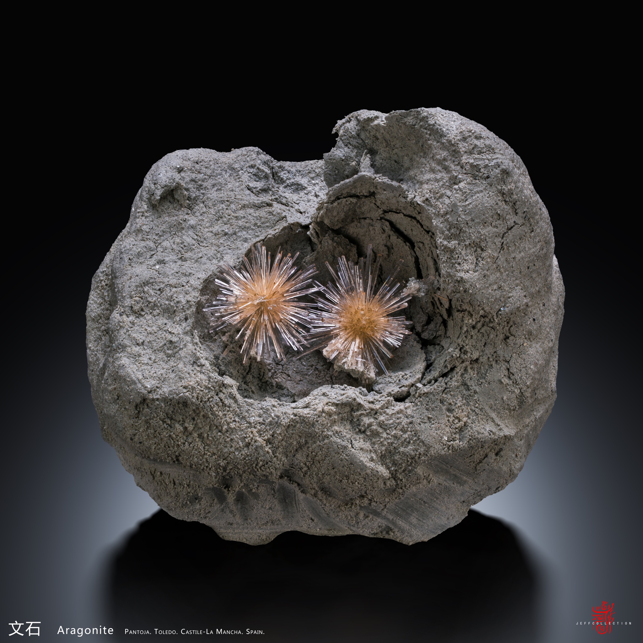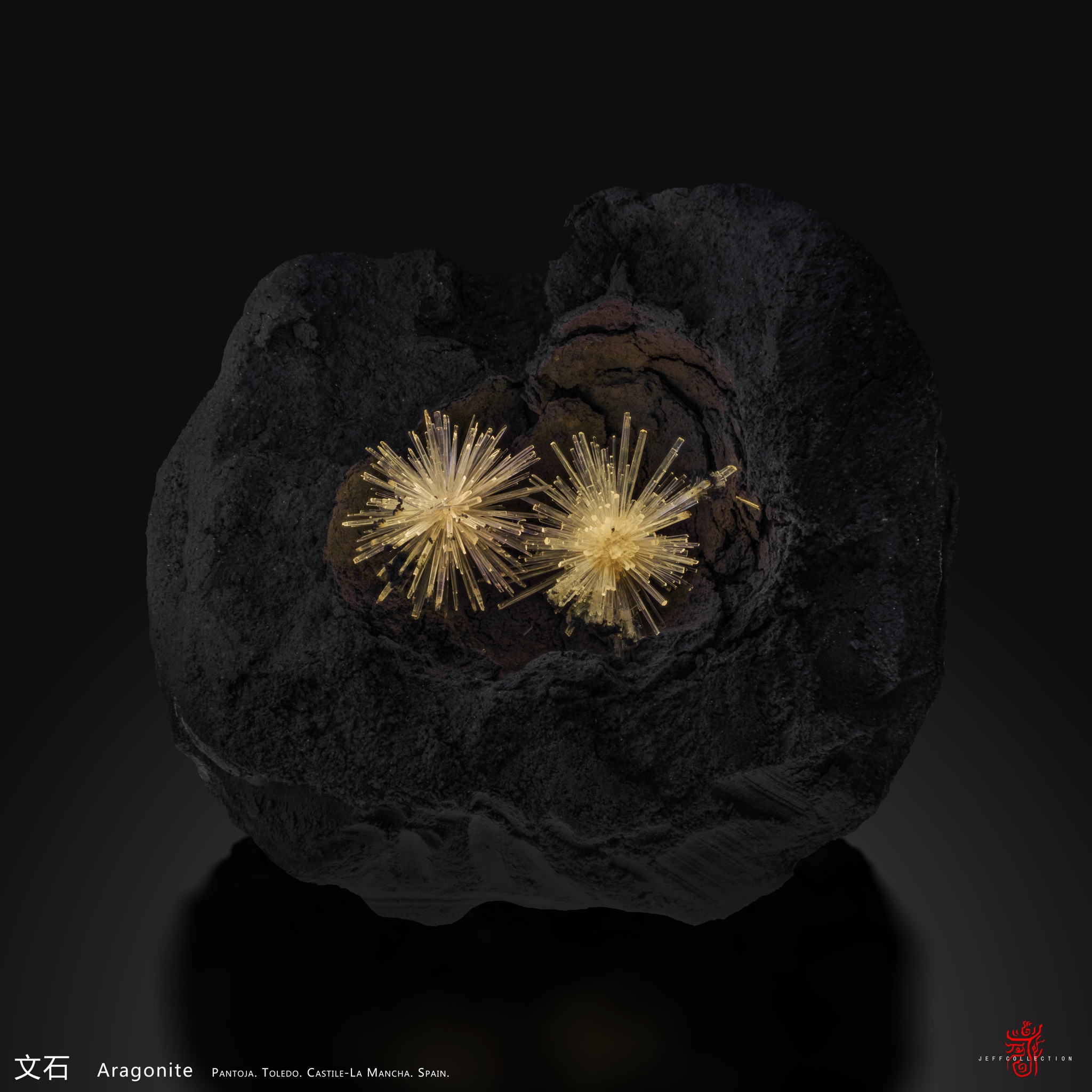 Aragonite crystals on matrix. Fluorescent yellow under longwave UV light.