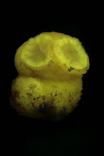 Photo under combined LW and MW-UV (both fluorescence photos) and under white light.