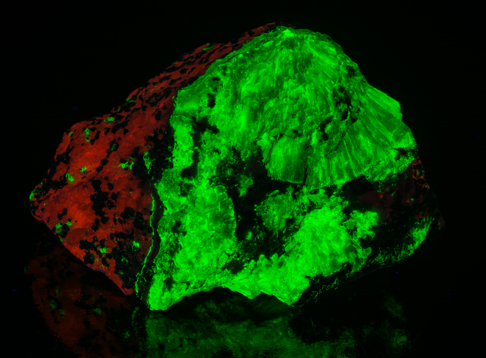 Willemite = green, Calcite= red/org - Second pic shows the extreme phosphorescence....
