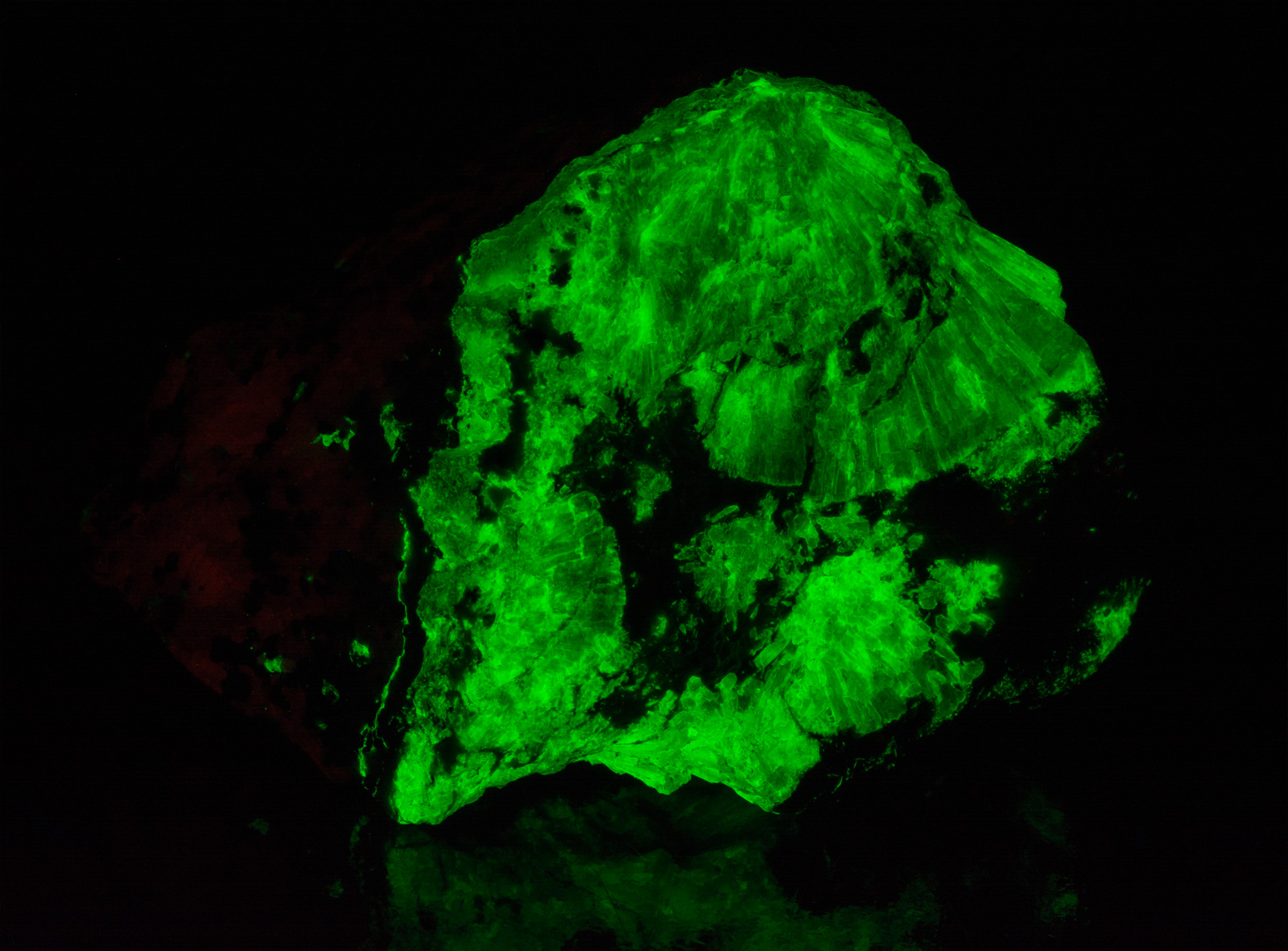 As explained by Earl Verbeek, resident Franklin FLM guru: "The term "radiating willemite" has nothing to do with its fluorescent or phosphorescent properties and refers only to the radiating habit of the mineral. In tight fractures these can take the form of intergrown, flat, radiating rosettes, but in larger openings one can get three-dimensional radiating masses. The latter are locally referred to informally as "cones. " Most radiating willemite from Franklin and Sterling Hill shows bright and prolonged phosphorescence, but some does not where it has been serpentinized; these are usually tan to brown in color. There is also many local willemite that shows wonderful phosphorescence but does not have a radiating habit. "