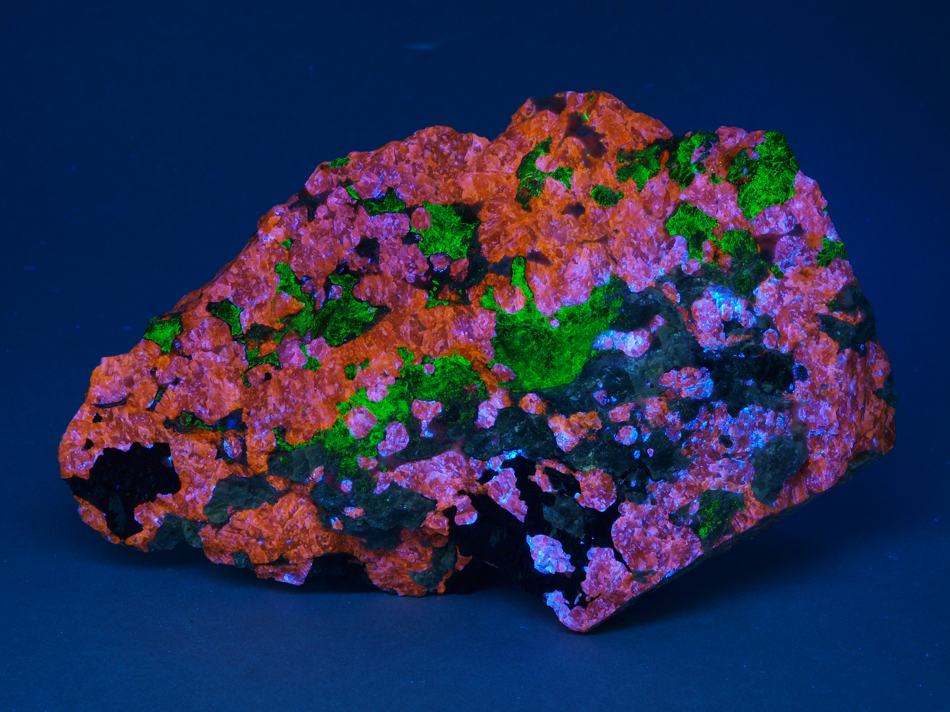Honey-brown sphalerite with reddish brown willemite, black franklinite, greenish grey talc, and minor dark greenish brown serpentine (at right in photo). Note fluorescence of talc. Photographed under combined 190-Watt longwave and a SuperBright shortwave. Sterling Hill Mining Museum specimen SHMM-60, ex Marian Reitenbaugh collection.