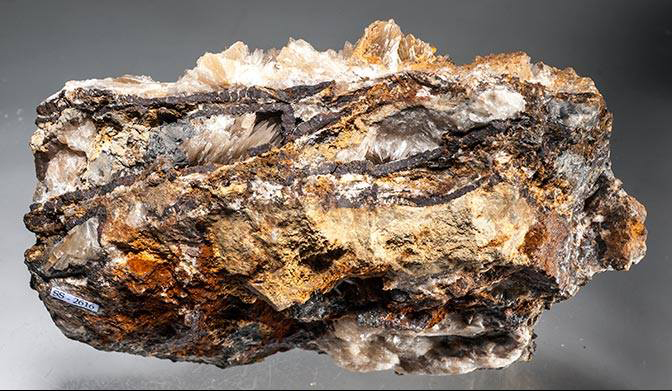 Rare layers of needles of aragonite on a dark matrix from the 1040 and 1080 stopes, between the 430 foot and 500 foot levels in the Sterling Hill Mine, Ogdensburg, Sussex County, New Jersey. The aragonite fluoresces creamy white SW.