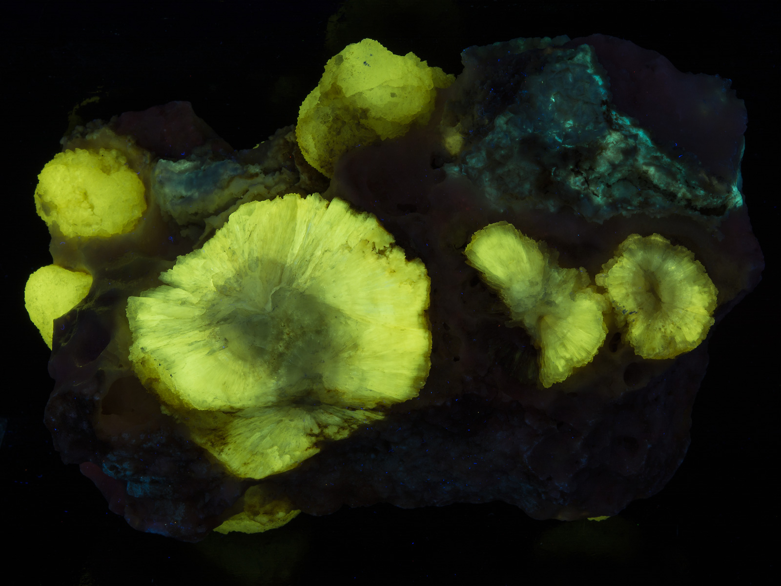 These pieces are from a small discovery by the nephew of the fellow who made the original find. They are described in literature as being "geyser eggs" - semi-translucent white concentric bands of radiating quartz. The quartz is fluorescent a very bright yellow - can easily compete with the brightest apatite from Pakistan, or even powellite from India. Only a few pieces are available as this came from a find in his basement (not in the field). The nodules are embedded in a calcite matrix, slightly fluorescent (etched to reveal the crystals).