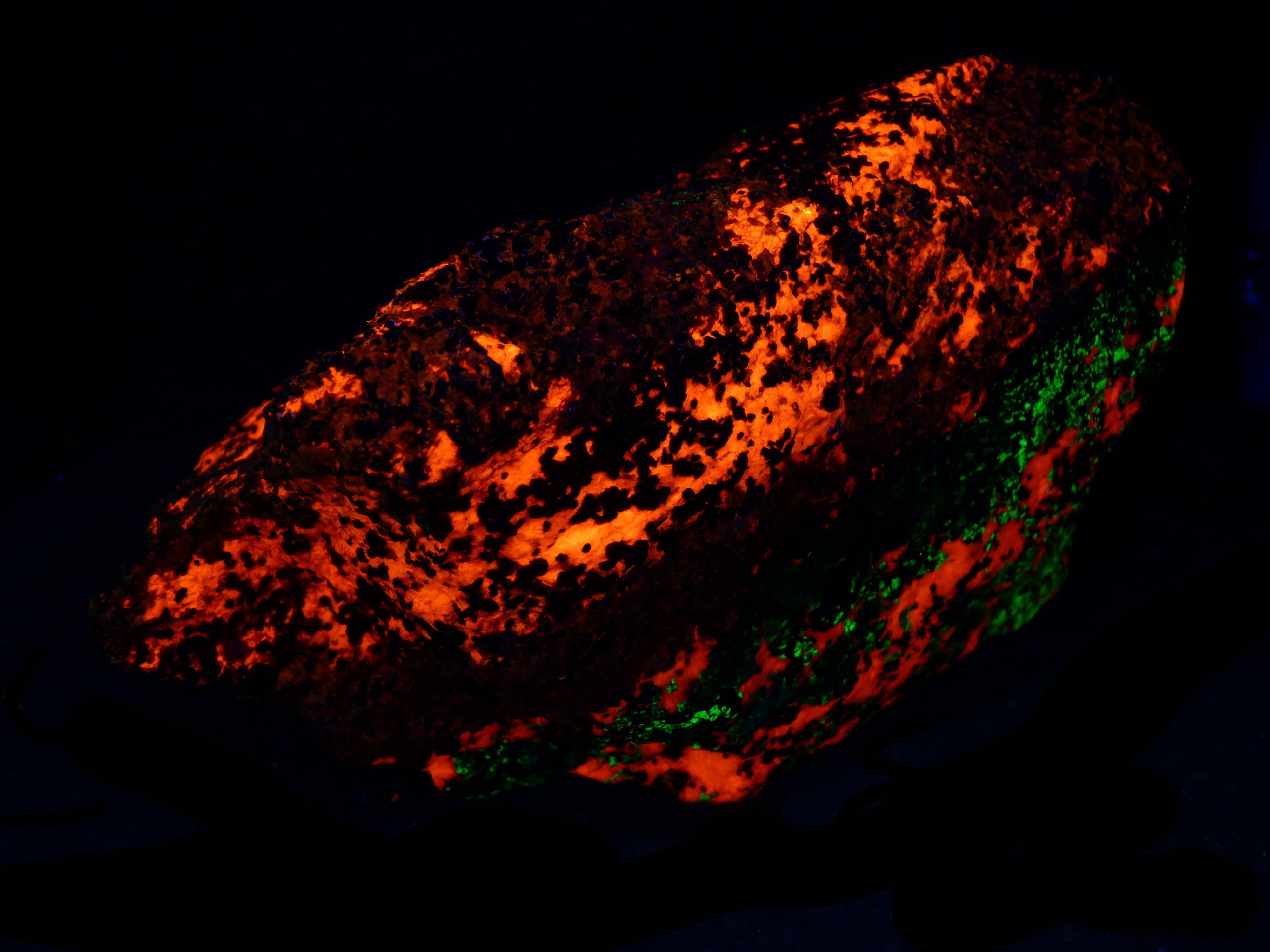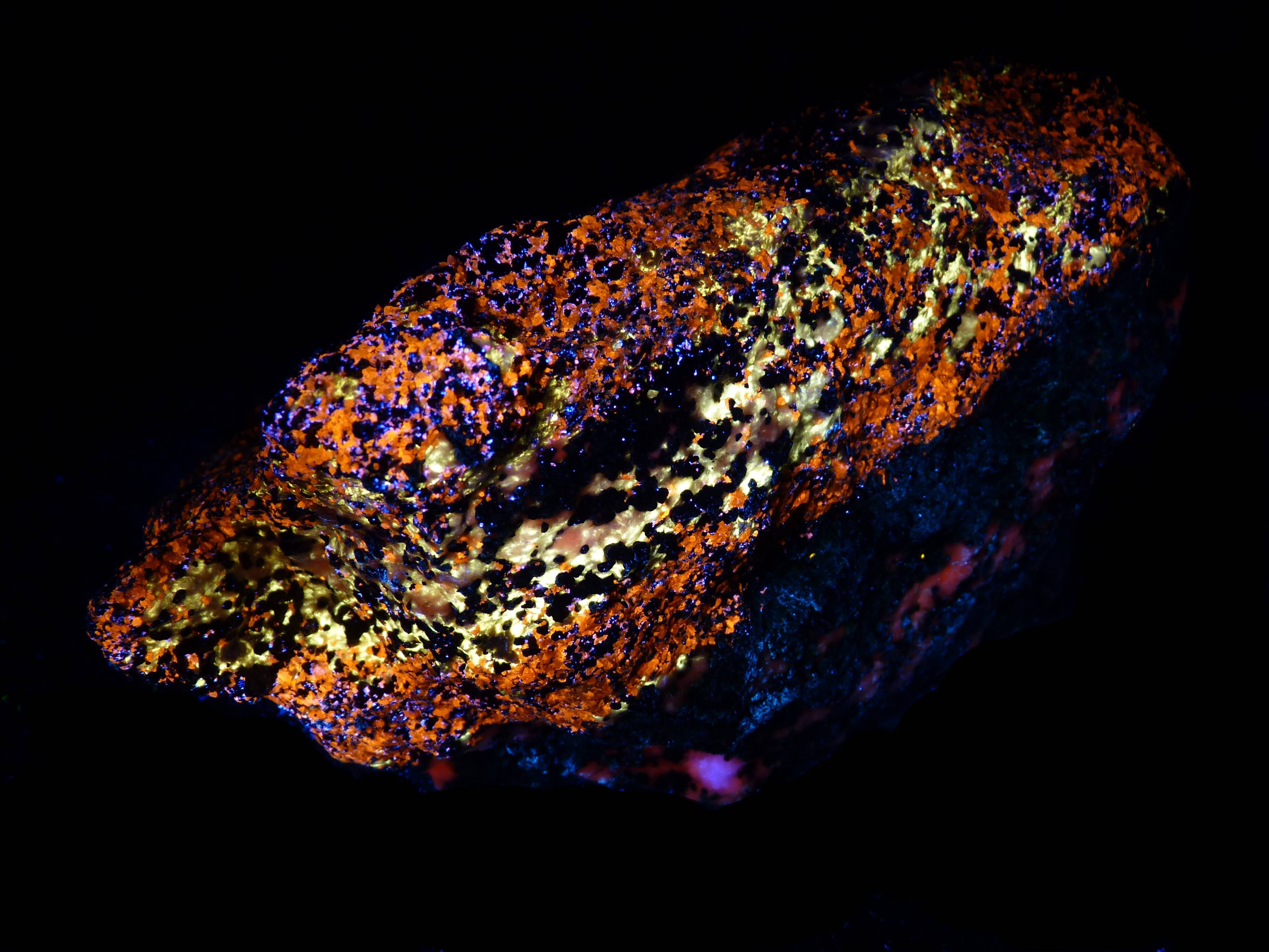 At Sterling Hill, most collectors highly favor searching with shortwave UV, ignoring longwave UV almost entirely. That is too bad because there is plenty to find under strong LW. A great example is the rock pictured here. Hard to miss, you might think. But searching with only SW UV, everybody passed right over it since it looked like a nondescript hunk of calcite. When they saw it glow under 365 nm, they exclaimed, "Where did you find THAT!?" I said, "You stepped on it." Using my powerful LW LED flashlight, I was able to find a lot of this stuff. It\'s a very rich example of orange and pink Sphalerite and the bright blue variety of the same called Cleiophane. But mixed in is a healthy helping of the aforementioned, Yellow-Fluorescing Calcite (YFC). A great, 2001 article about the mineral was written by James Van Fleet and Dr. Earl Verbeek. See: https://works.bepress.com/james_vanfleet/5/