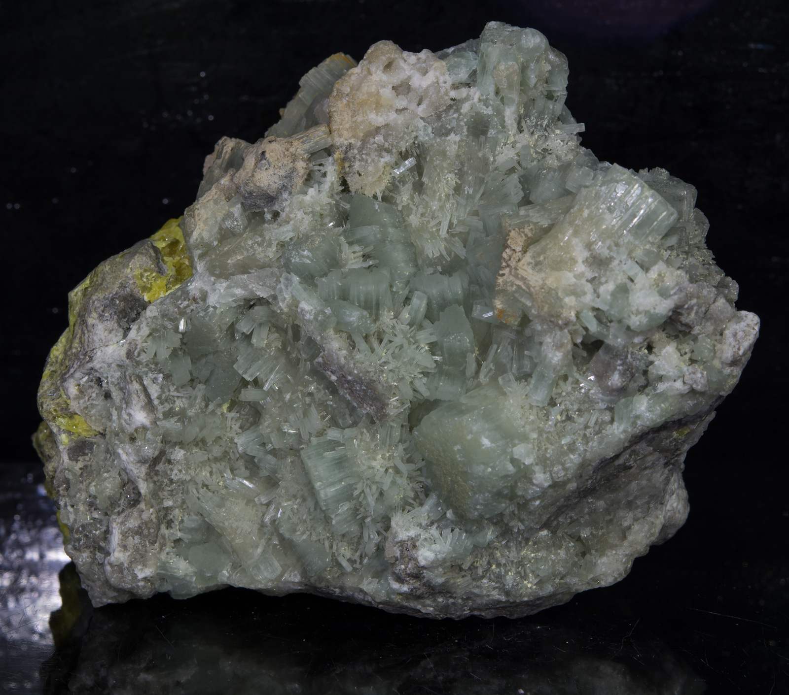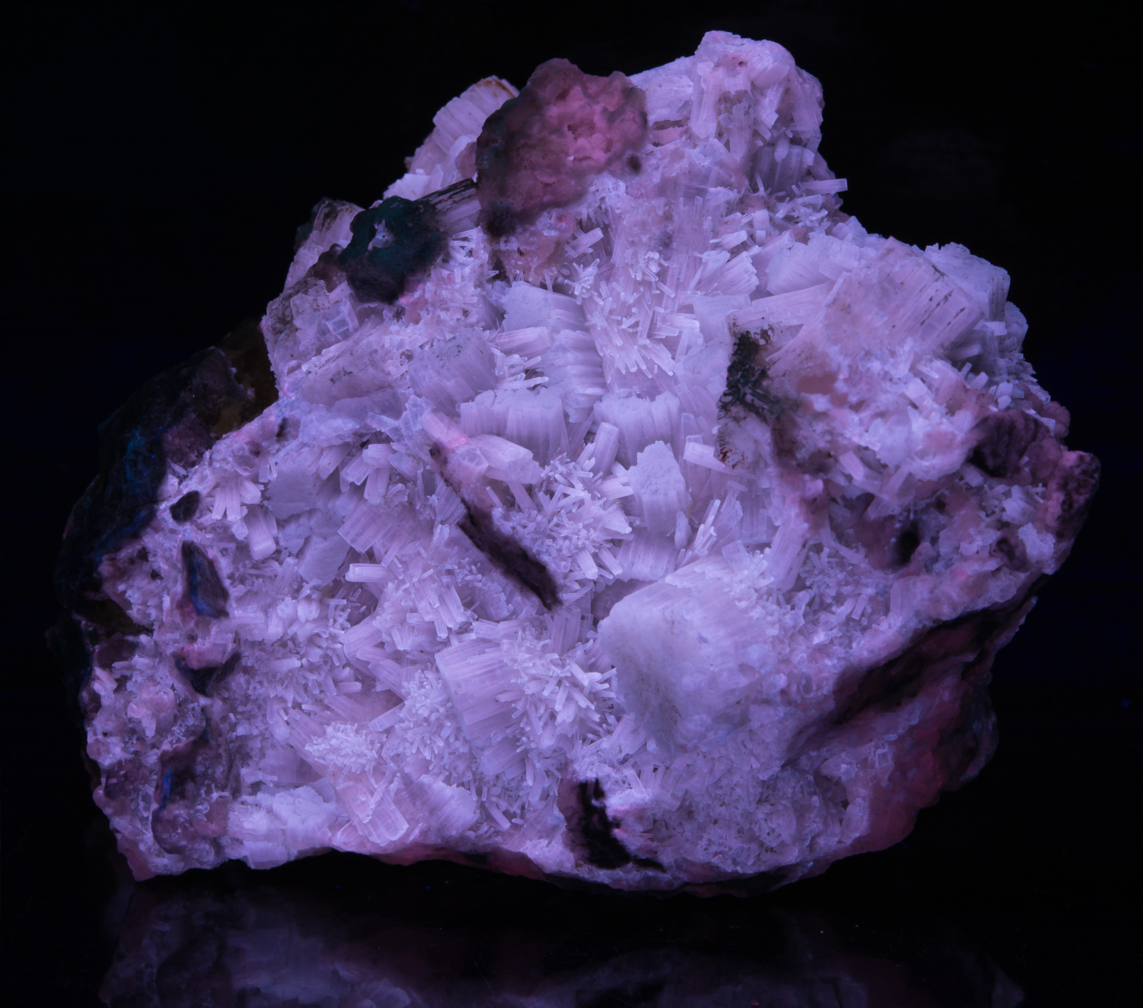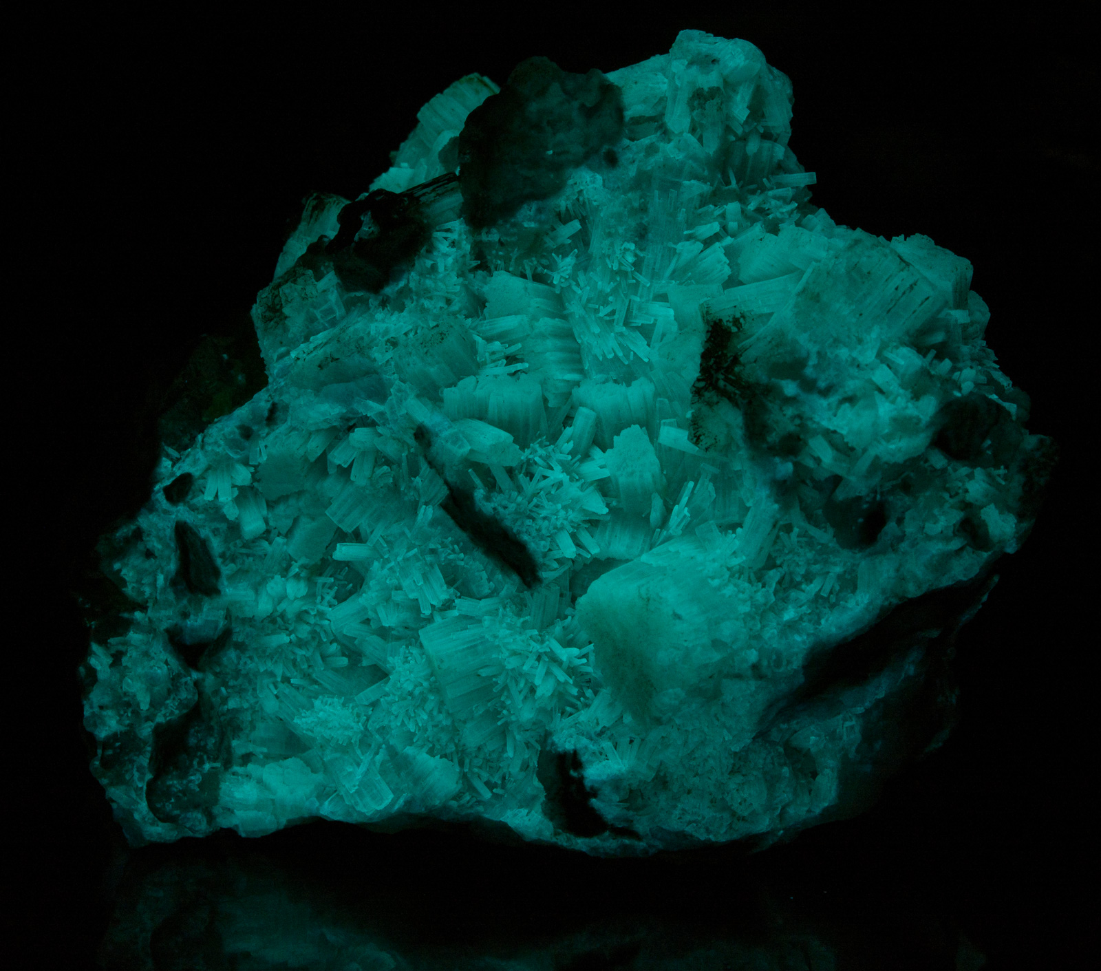 Every time I photograph one of these specimens I am struck by the detail and beauty. Vividly fluorescent but it does not stop there; the fluorescent response changes under each wavelength. And it is extremely phosphorescent to boot (see the picture below, no lights at all). If there were a contest for the classiest fluorescent mineral - as much as I like Greenland - this would make it a hard decision for me.