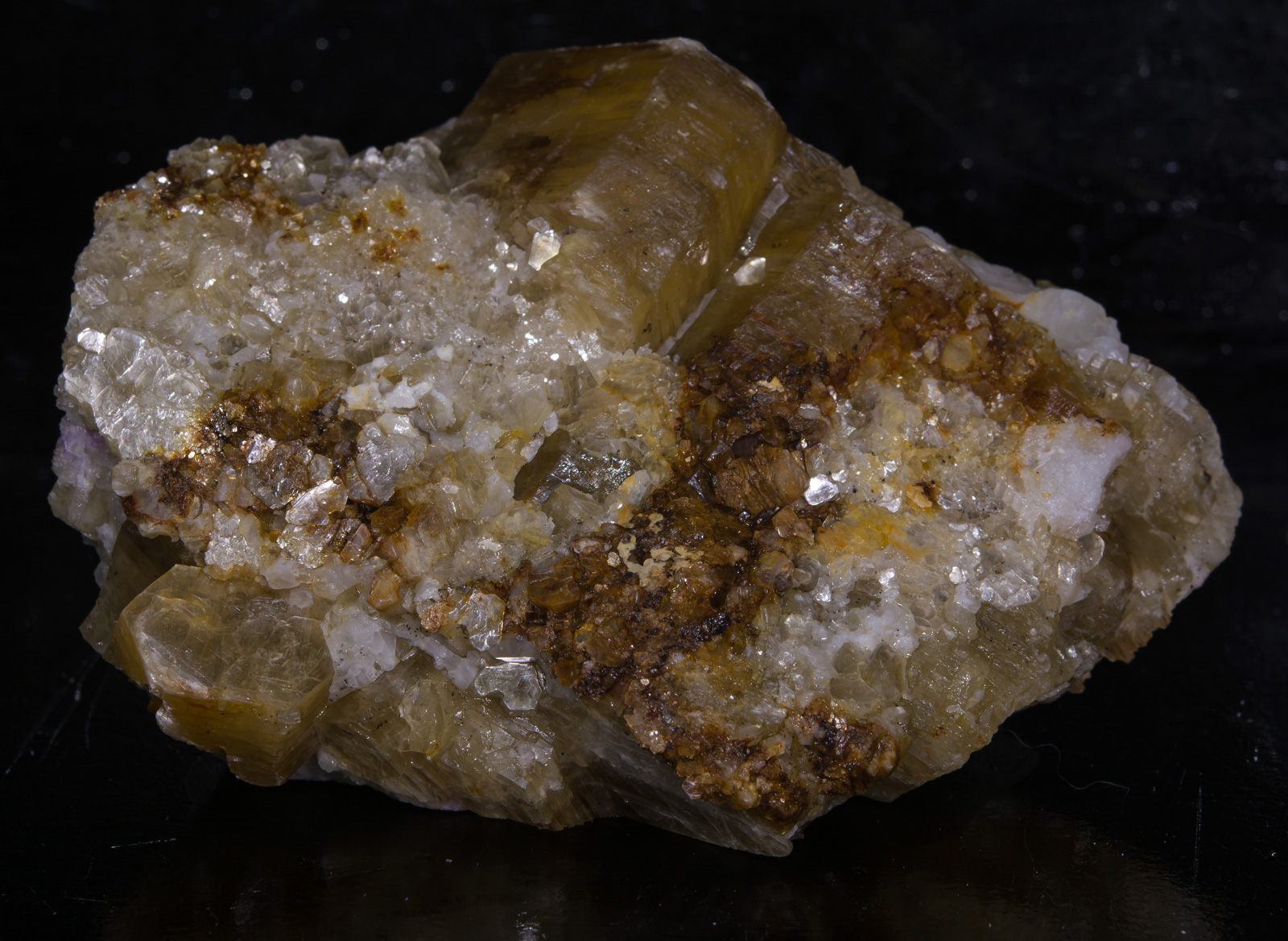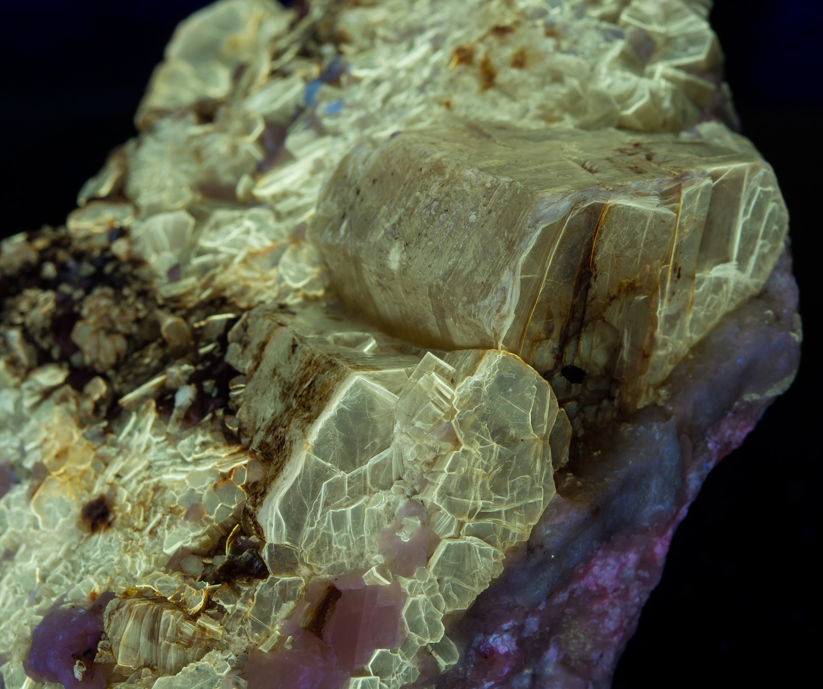 A large plate of phlogopite crystals on a matrix of sodalite var. hackmanite from Badakhshan, Afghanistan. The front surface is covered with phlogopite crystals, while the matrix is a mix of sodalite and calcite. The sodalite is very phosphorescent and tenebrescent. Nice and bright.