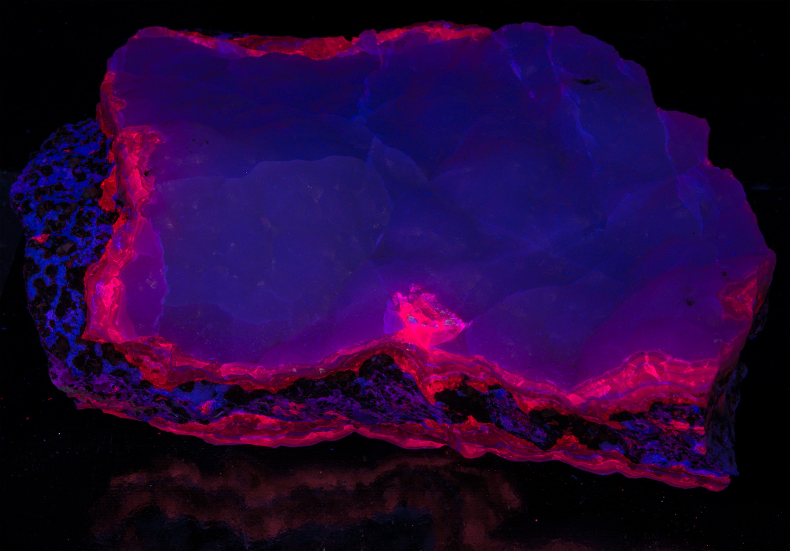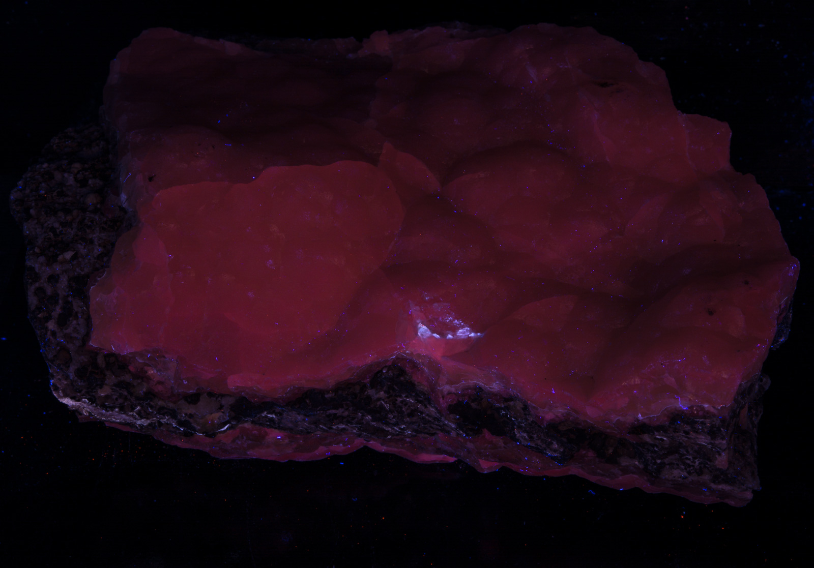 Beautiful red/violet/blue smithsonite sandwiching red fluorescing smithsonite. Also known from the El Potosi Mine and San Antonio Mine, but I think only these have this wonderful dual color fluorescence.