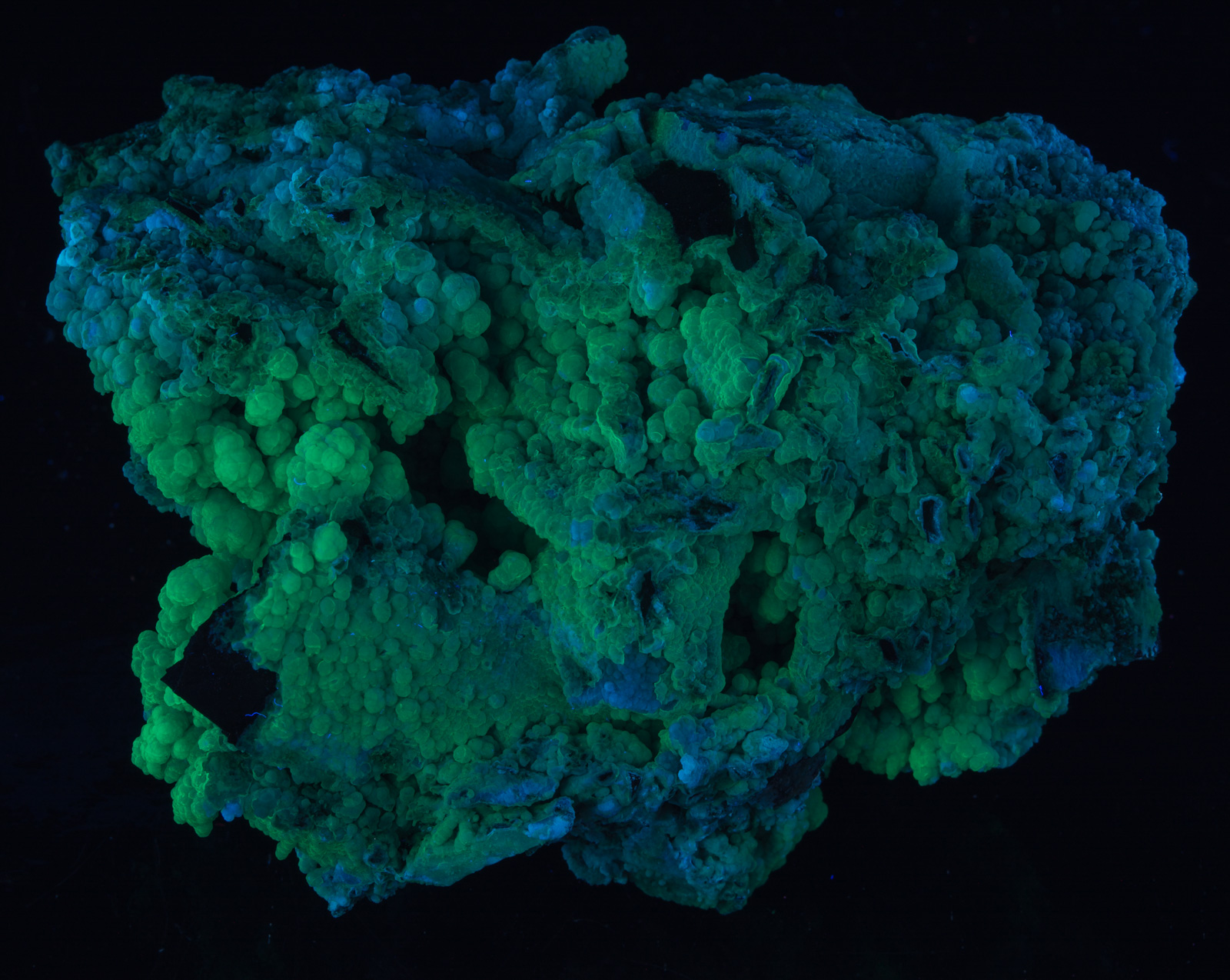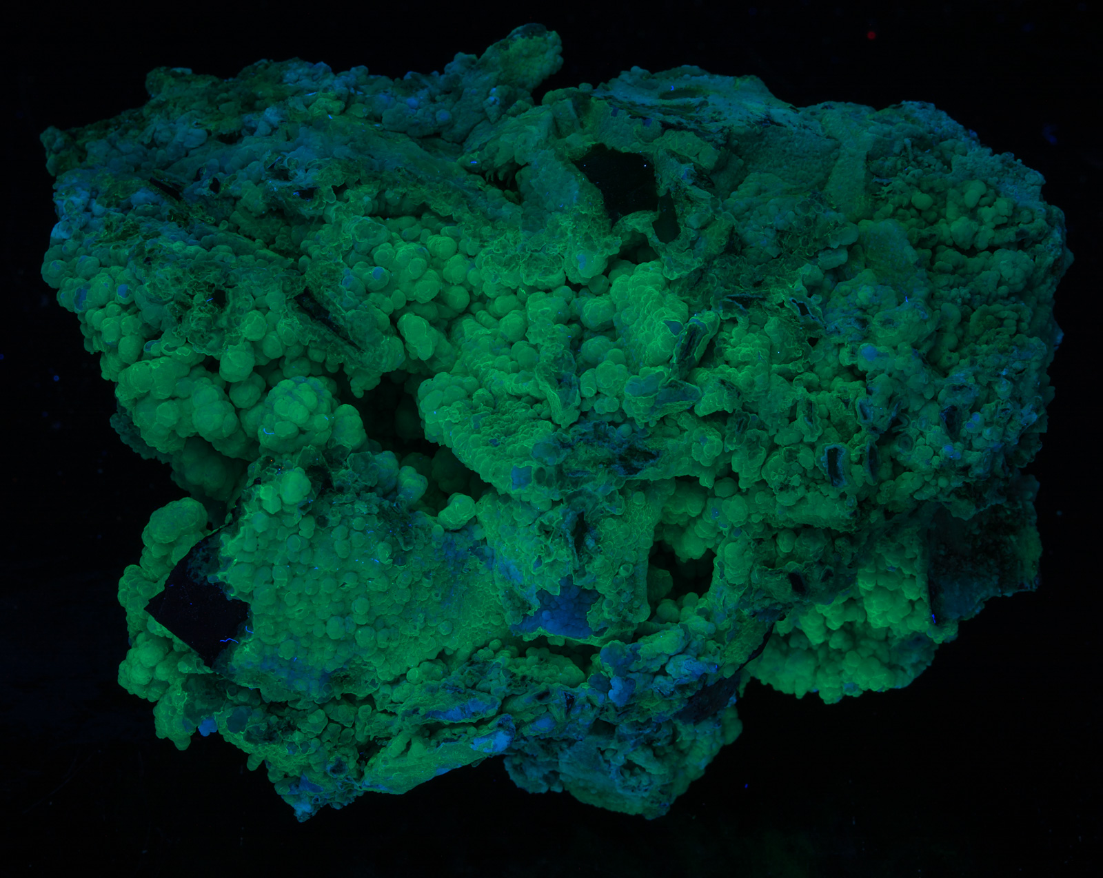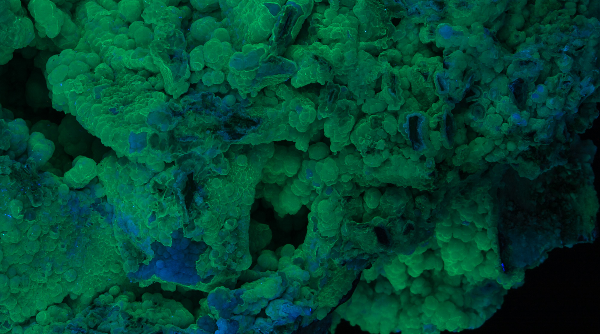 It appears that broken crystals, or ones with thin "shells?" fluoresce blue while most is fluorescent green. Under LW everything shifts to a whitish blue. SW and LW shown, followed by a gallery of closeups, white light pictures and size.