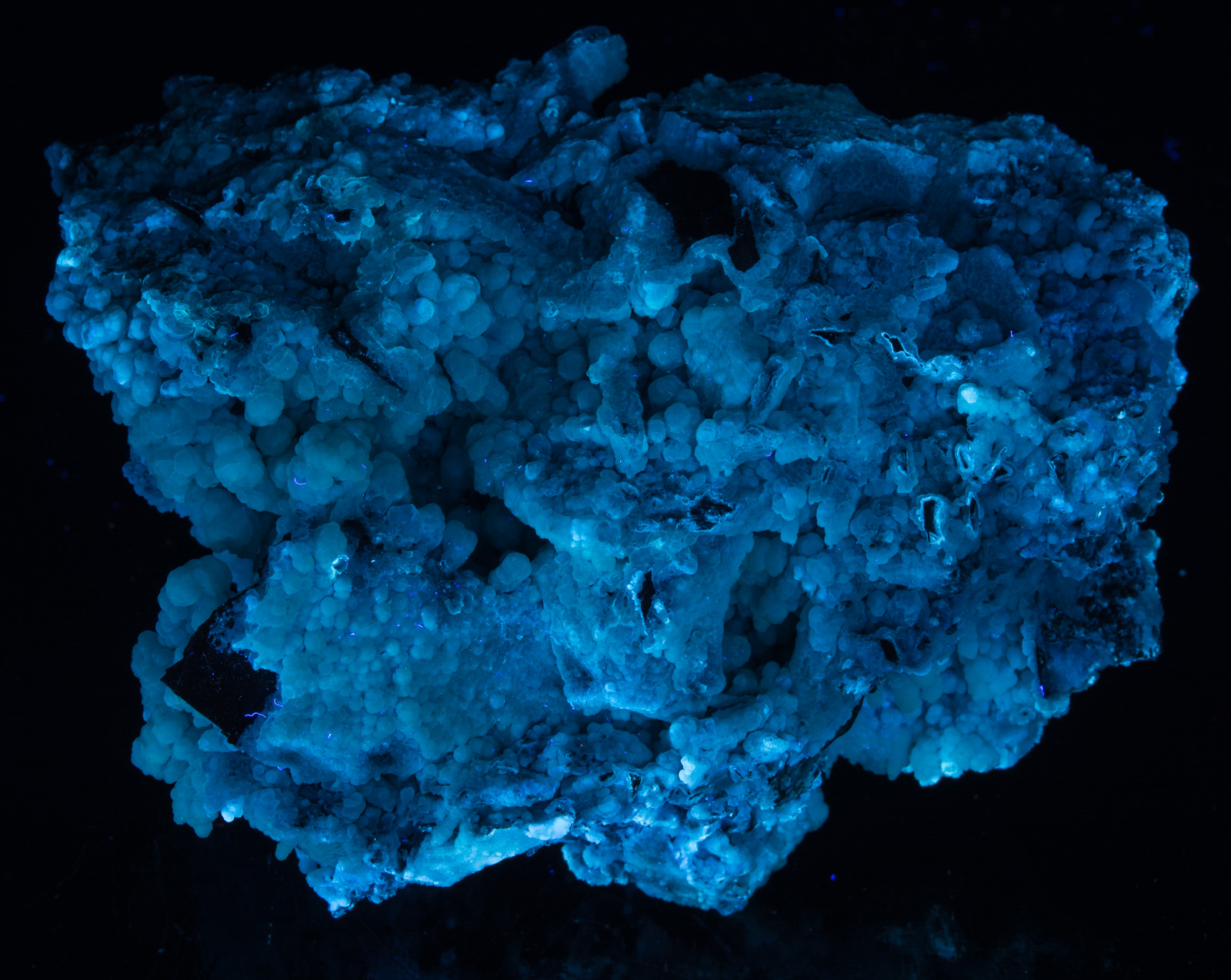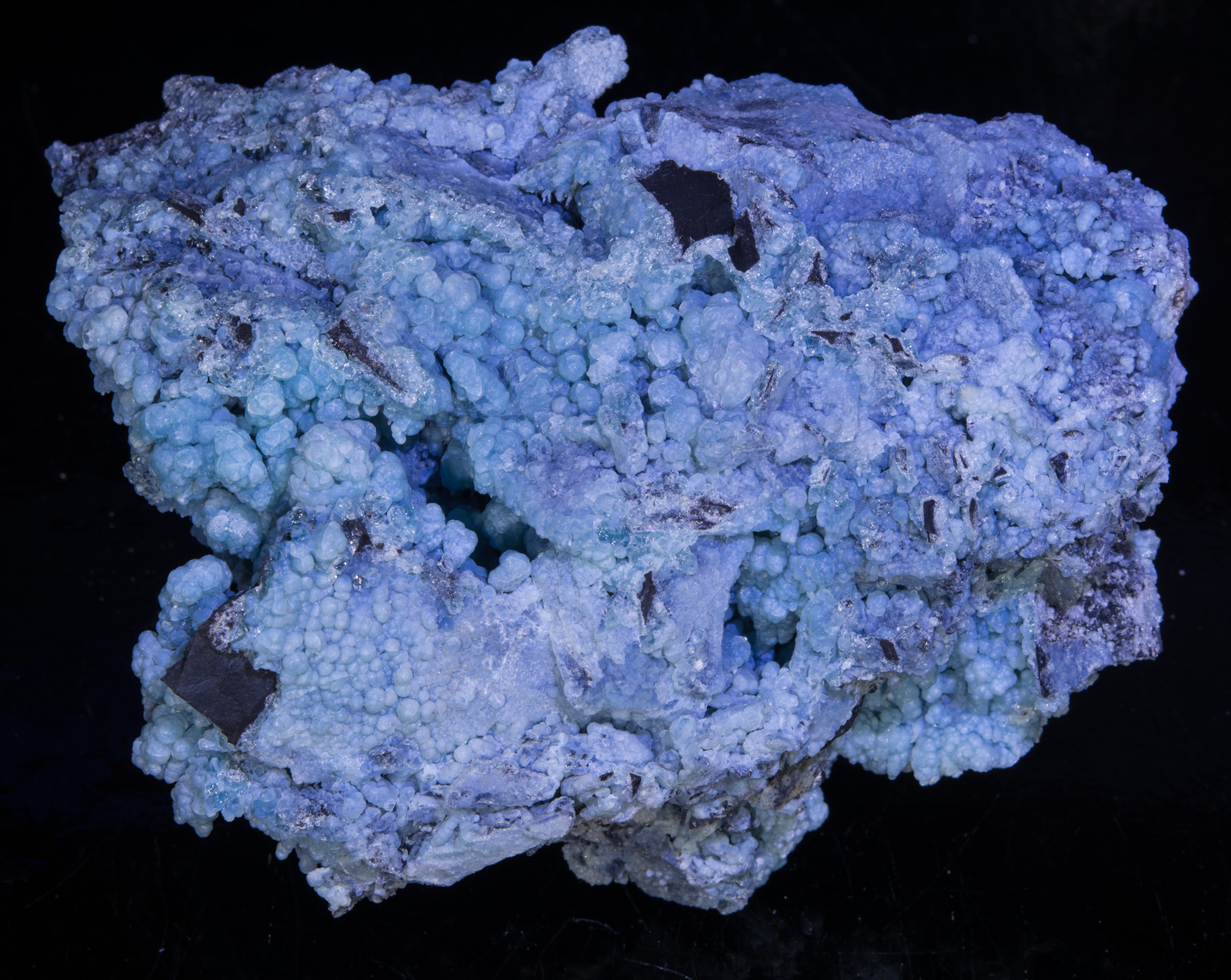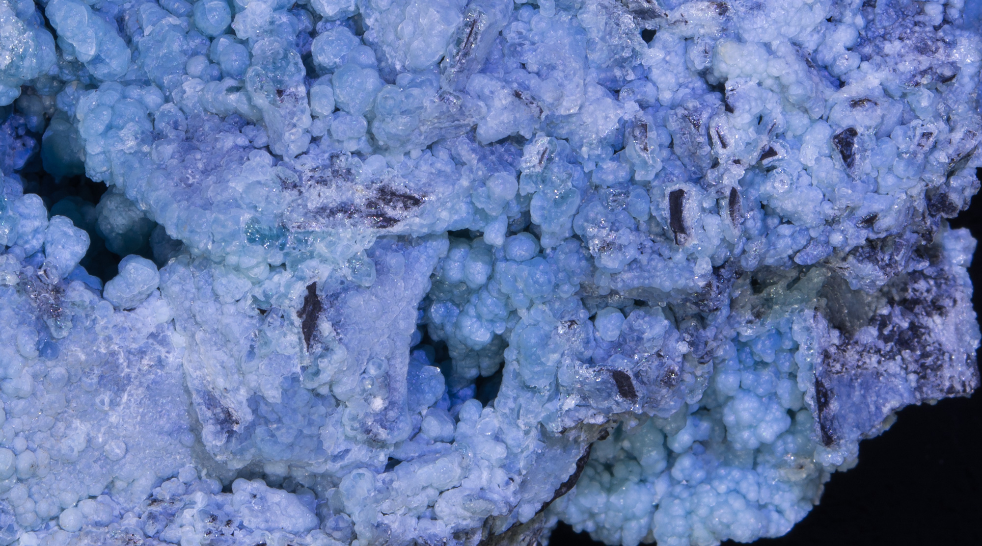 Gibbsite is a relatively rare aluminum hydroxide. It is composed of two different color phases: a rich blue and a lighter sky blue with individual azure botryoidal spheres around 2.5 mm. Gibbsite from this relatively new find (2012) in Yunnan Province represent some of the most colorful specimens of this uncommon species. It is surprisingly lightweight, and very fragile.