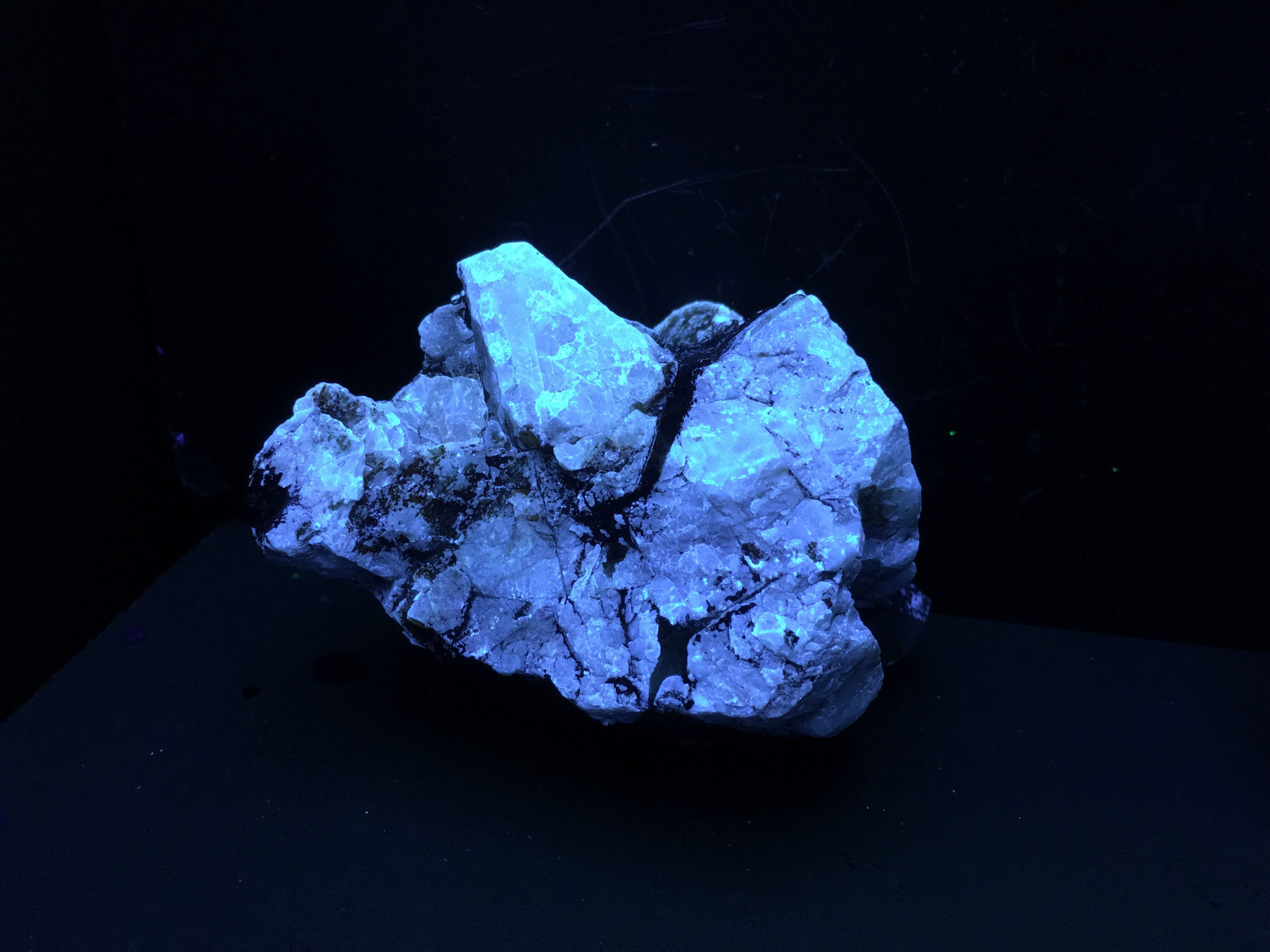 Under MW the scheelite fluoresces yellow and is quite striking. Add some longwave to bring out the fluorite and it\'s an amazing color blast. Under SW the scheelite is the typical bright blue/white. Longwave, of course, brings out the fluorite but there is still a yellow reaction in the scheelite. The ID label that came with this specimen calls out diopside but I don\'t see it.