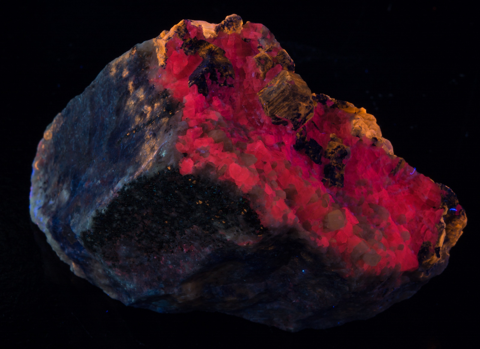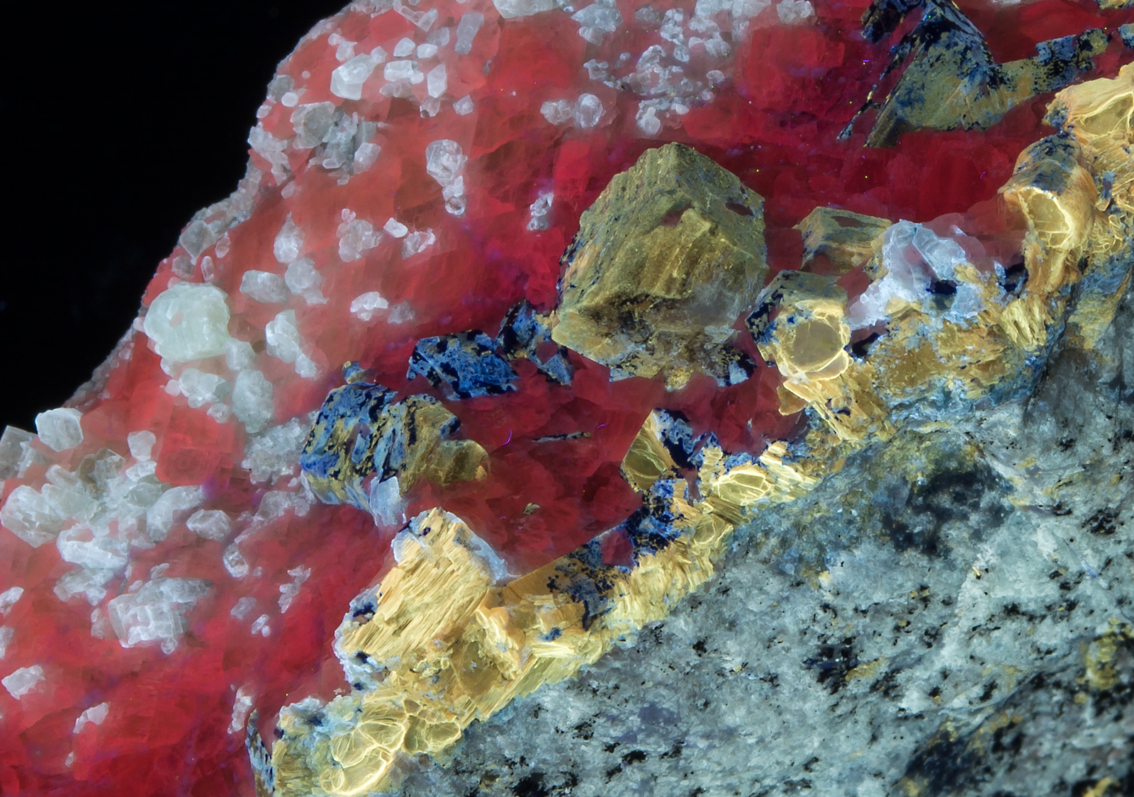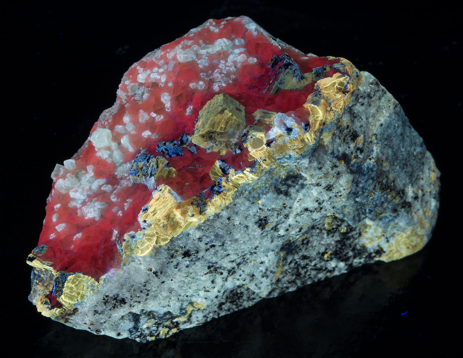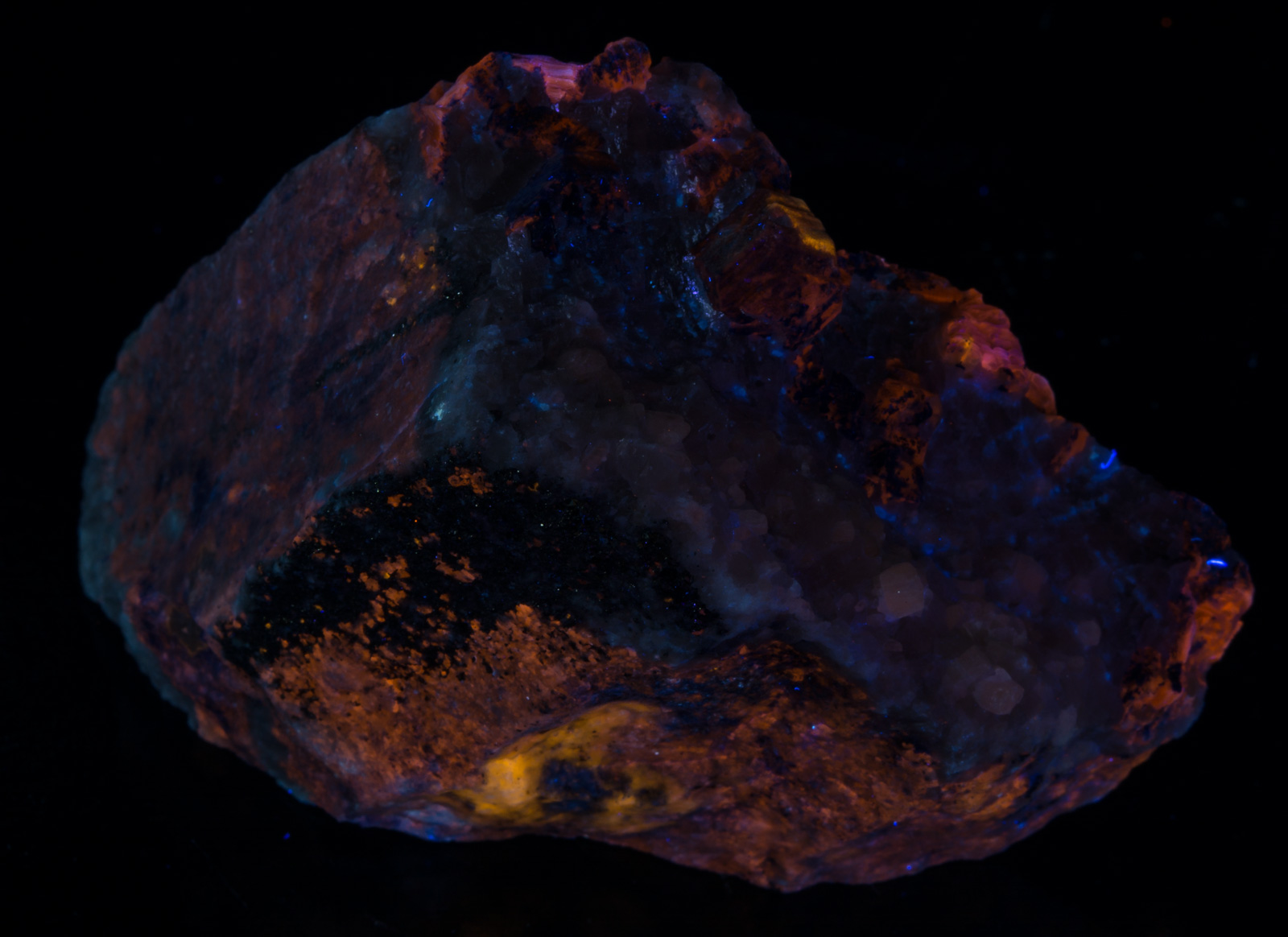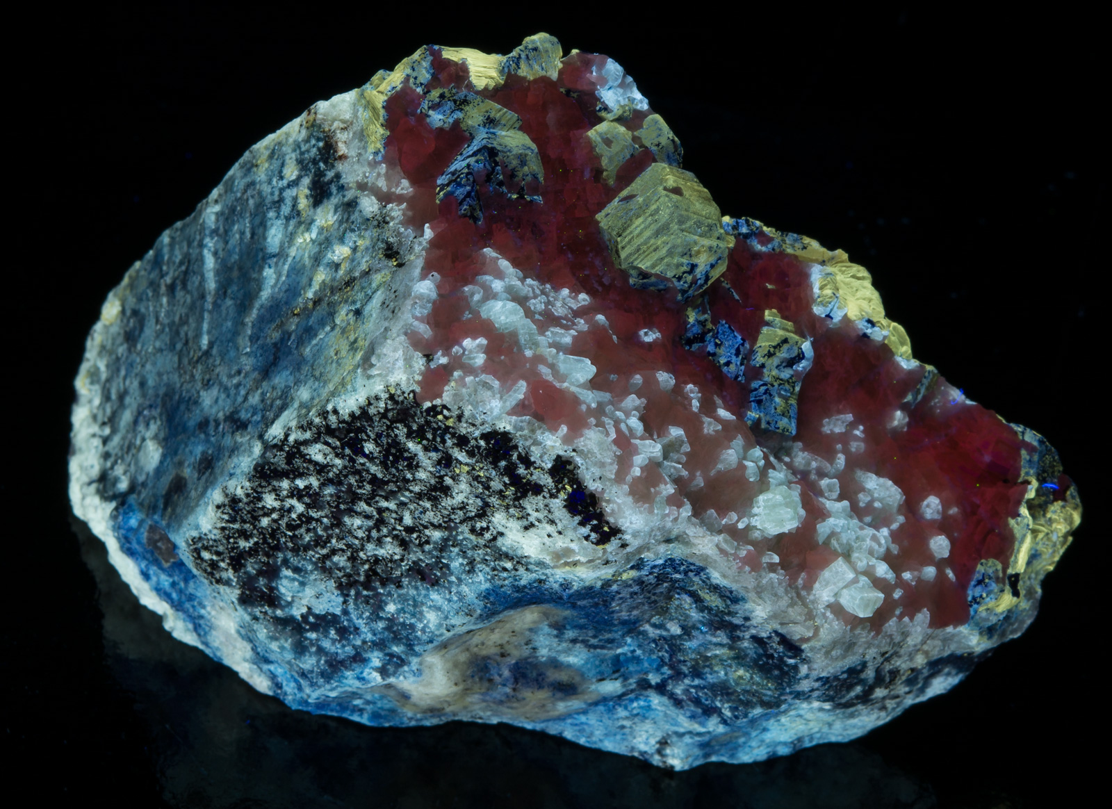 Afghanite - duller yellow longwave, phlogopite - bright yellow shortwave, calcite - reddish SW and MW, diopside crystals in calcite and massive diopside in the matrix - white SW. Beautiful example of a mixed species from Afghanistan; many IDs are subject to verification. Closeup under SW and MW shown.