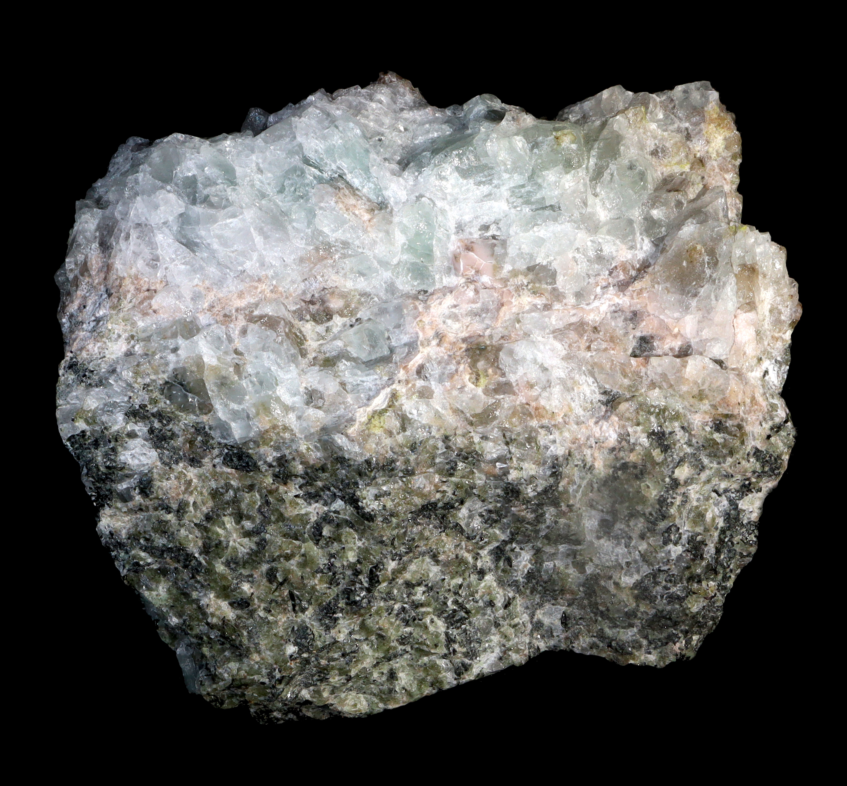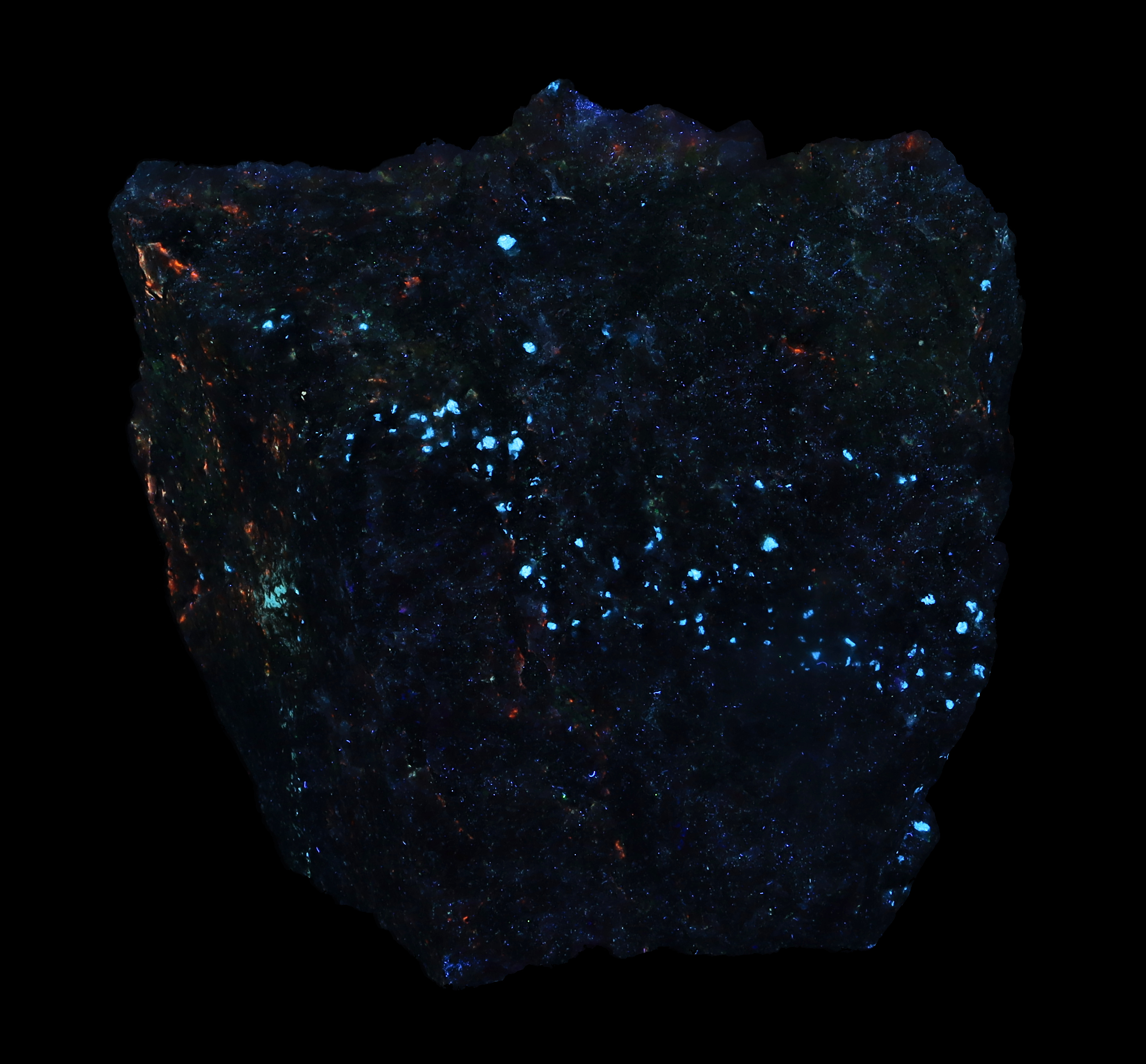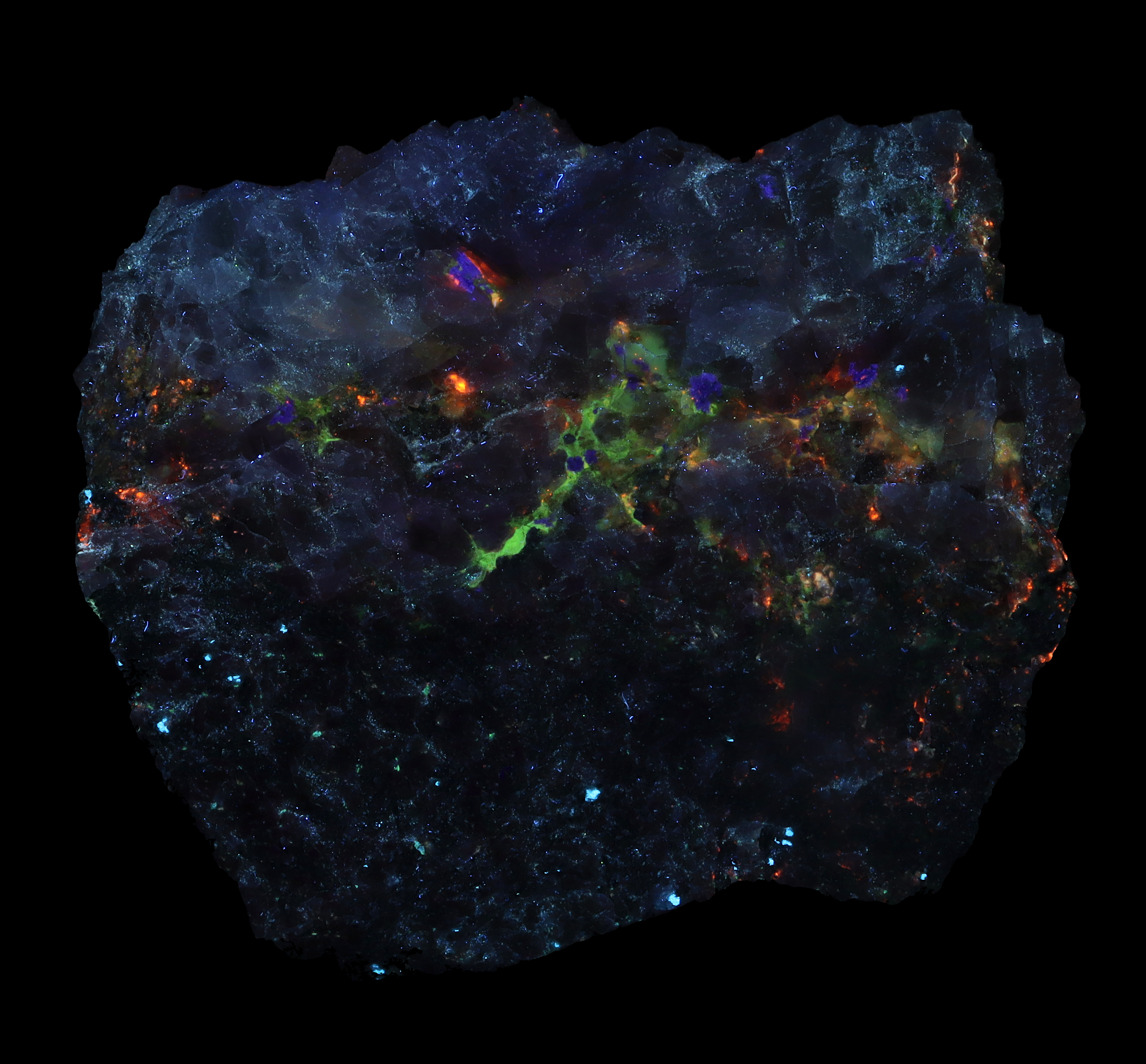 A “rischorrite” rock with some interesting fluorescent minerals. In what I call the front, there is a nice galaxy of natisite dots, fluorescent bright blue under shortwave UV light. On the back side, some natisite is still visible at the bottom, but what is most visible is a vein of an unidentified green fluorescent mineral, some dots of orange fluorescent sodalite (under longwave UV), and a few little crystal of vitusite-Ce, fluorescent violet under shortwave and midwave UV. The red and yellow colors are artifact of the photograph; mostly sodalite fluorescence overlapping the green or the violet.