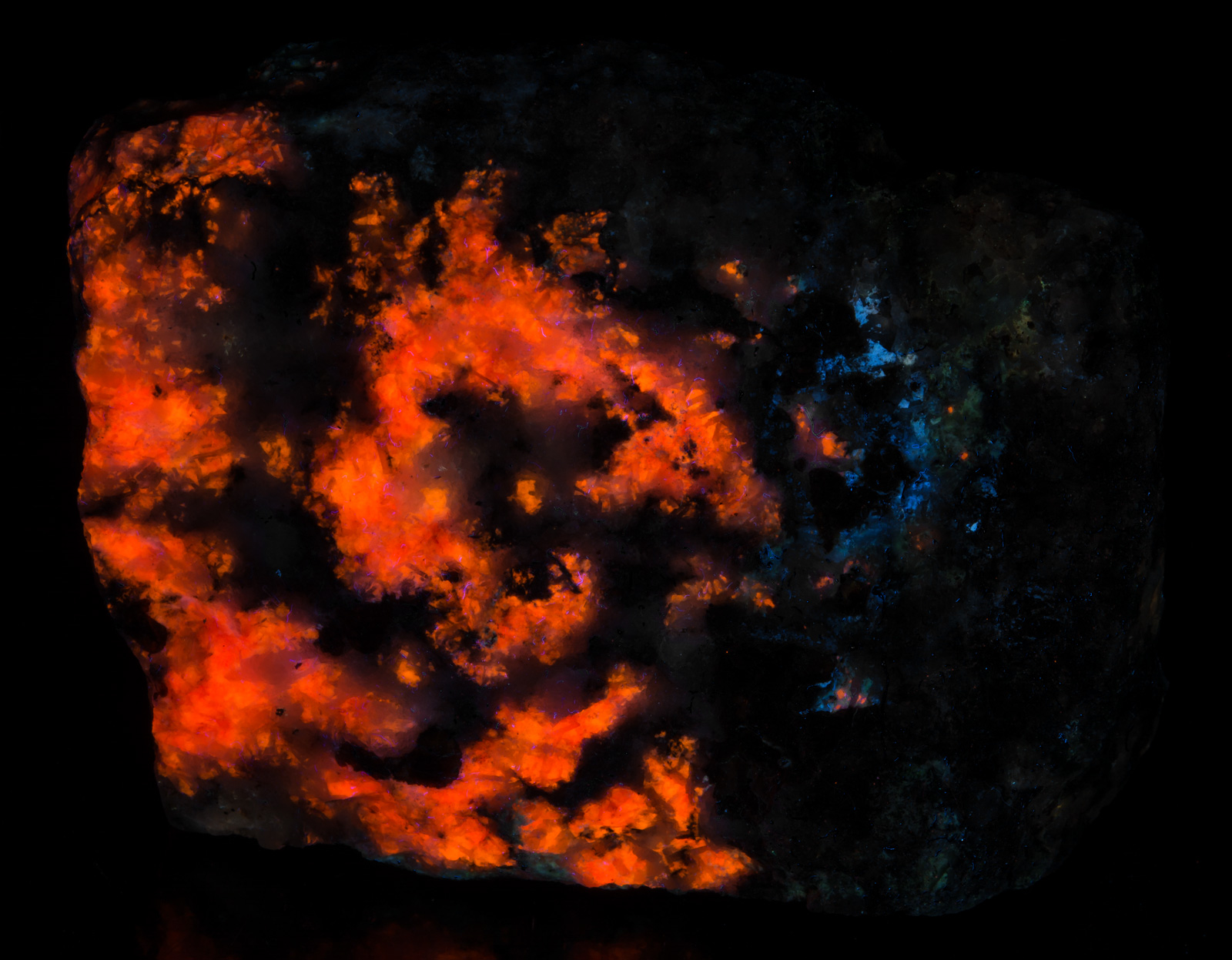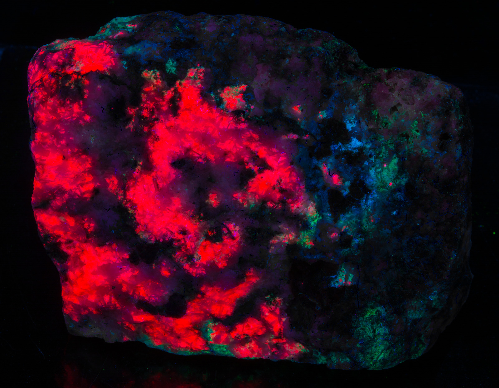 Before 2000, small tugtupite pieces (2" to 3") were selling for $500 or more. They earned the moniker "King of Fluorescent Minerals" due to the rich red color and brightness. In 2001, I started supplying pieces to the market, prices dropped, and we haven\'t looked back. Quality pieces still garner top dollar, but the sizes have also increased (such as this piece).